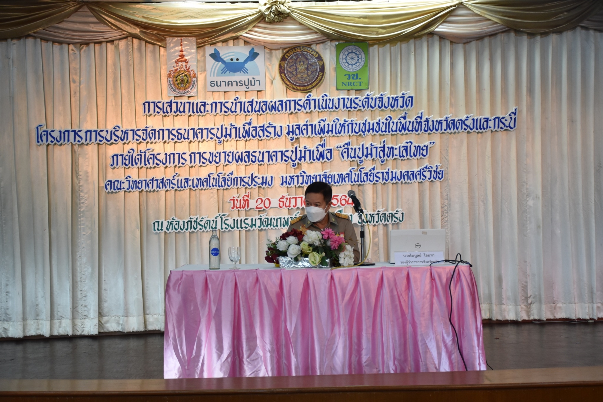 (20 ธ.ค.2564) นายไพบูลย์ โอมาก รองผู้ว่าราชการจังหวัดตรัง เป็นประธานเปิดกิจกรรมการเสวนาและนำเสนอผลการดำเนินงานระดับจังหวัด ตามโครงการ “การบริหารจัดการธนาคารปูม้าเพื่อสร้างมูลค่าเพิ่มให้กับชุมชนในพื้นที่จังหวัดตรังและกระบี่” ภายใต้โครงการขยายผลธนาคารปูม้าเพื่อ “คืนปูม้าสู่ทะเลไทย” ตามมติคณะรัฐมนตรี ณ โรงแรมวัฒนาพาร์ค อ.เมืองตรัง พร้อมมอบโล่เกียรติคุณให้แก่ธนาคารปูม้า/ศูนย์เรียนรู้ฯ ด้านการอนุรักษ์ปูม้า และการฟื้นฟูทรัพยากรชายฝั่งจังหวัดตรัง จำนวน 47 แห่ง โดยมี ดร.วิกิจ ผินรับ หัวหน้าโครงการธนาคารปูม้าตรังและกระบี่ กล่าวรายงาน