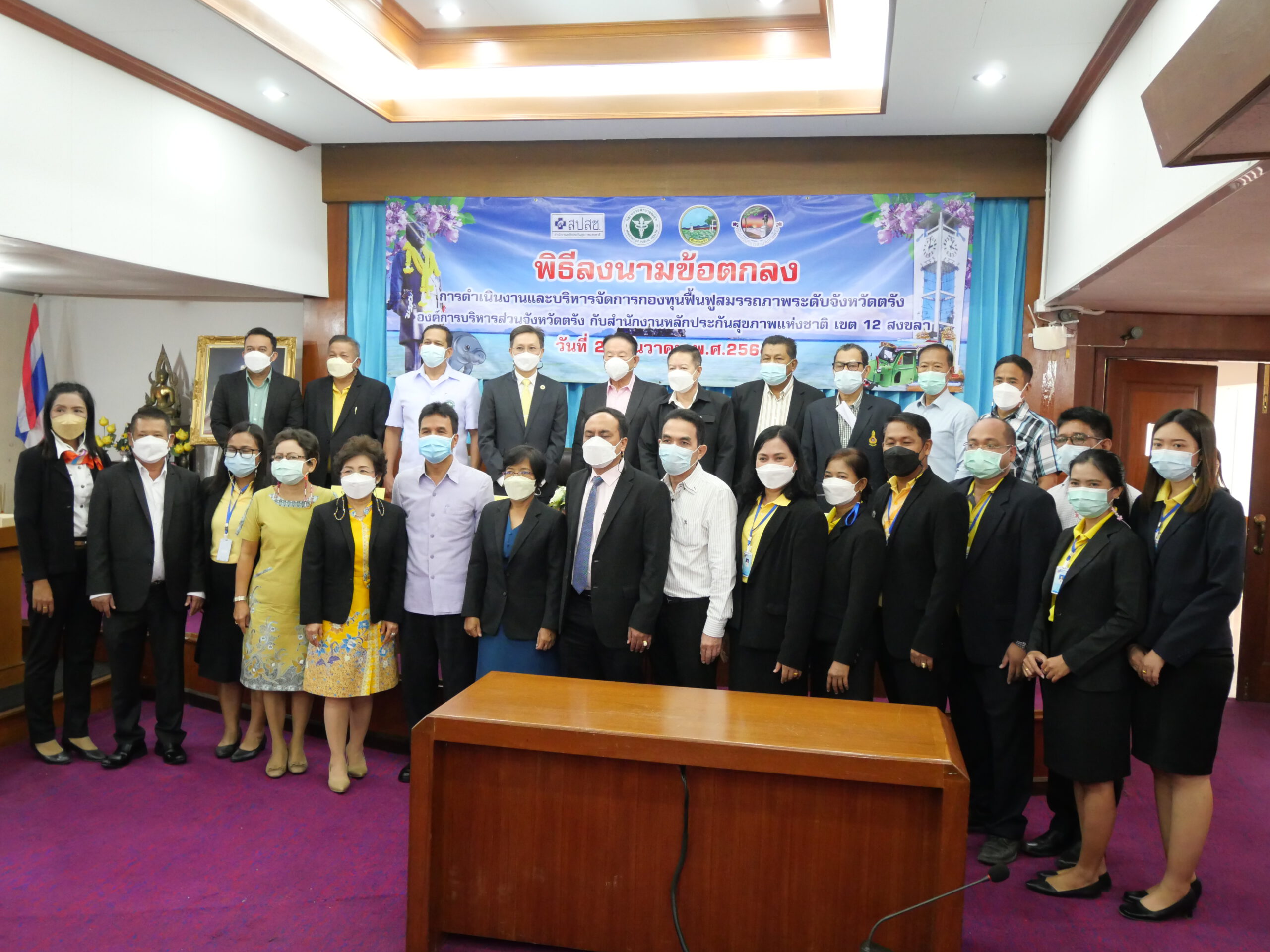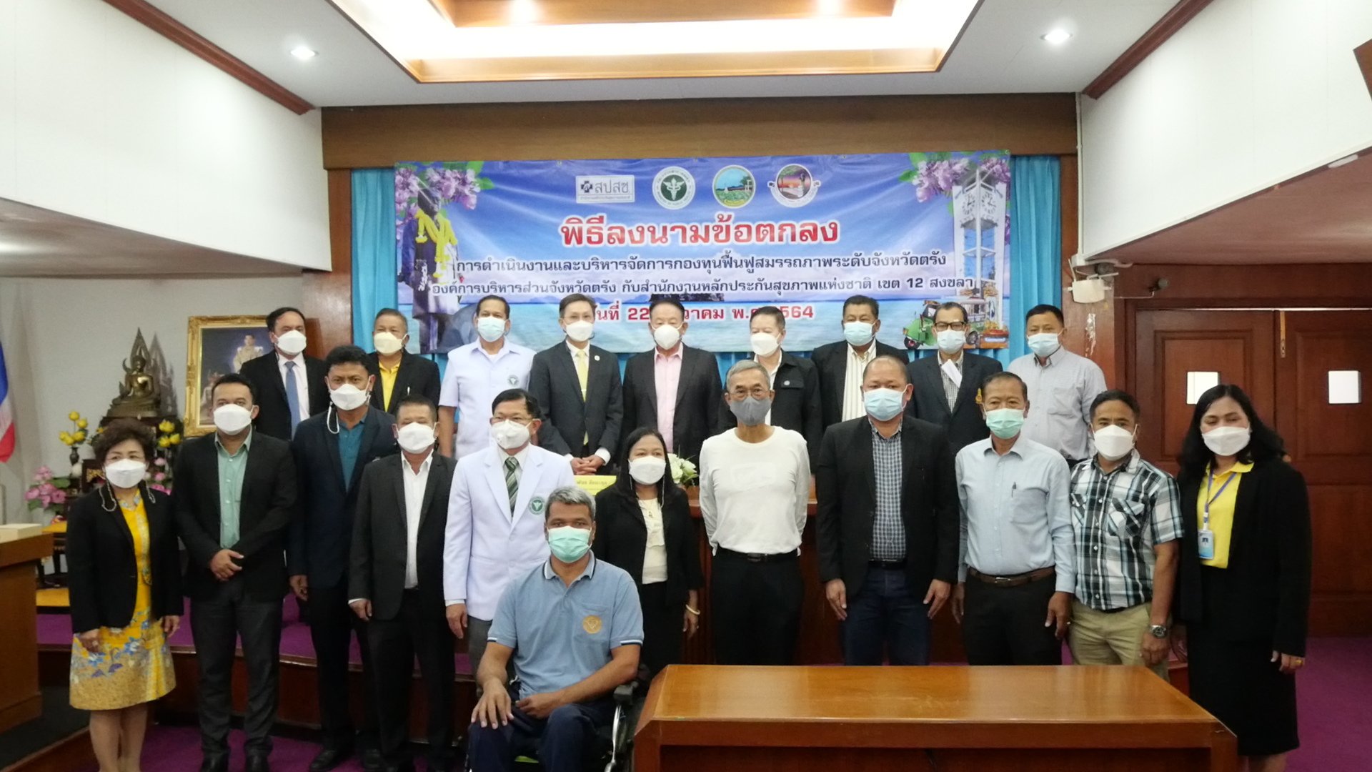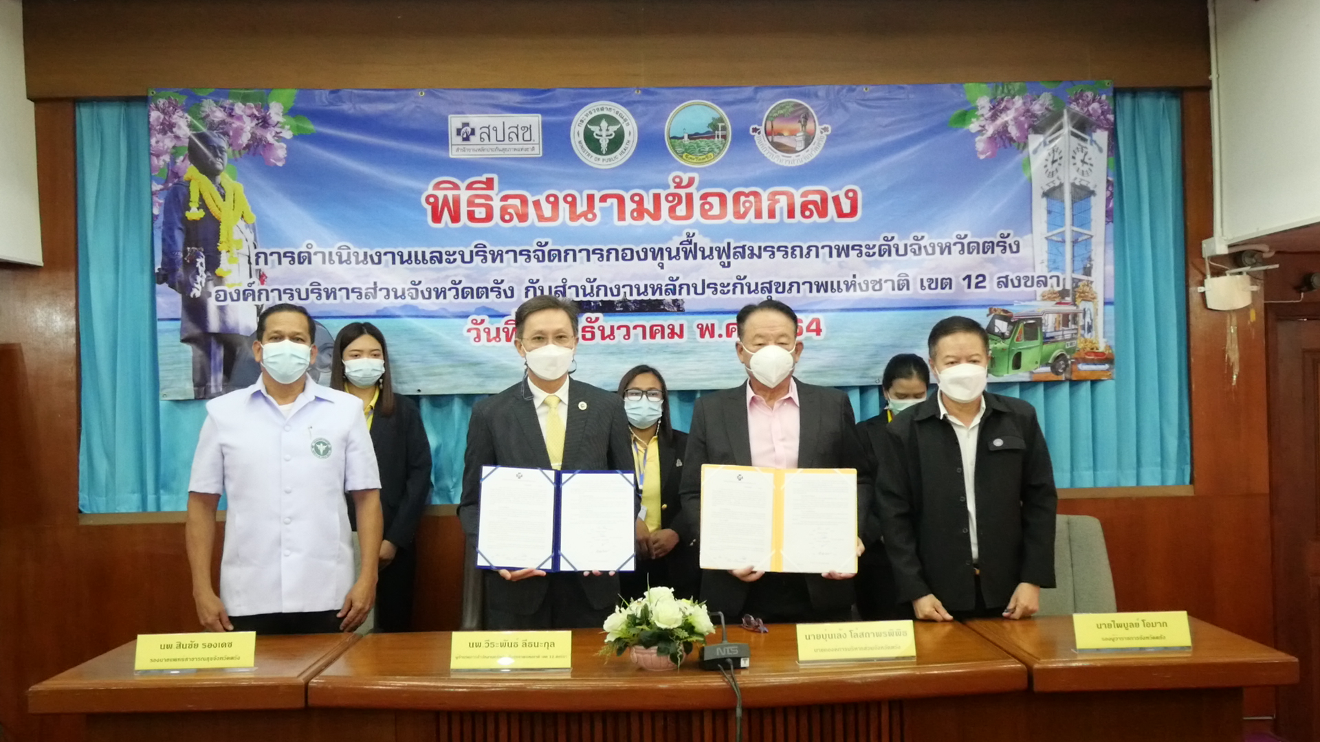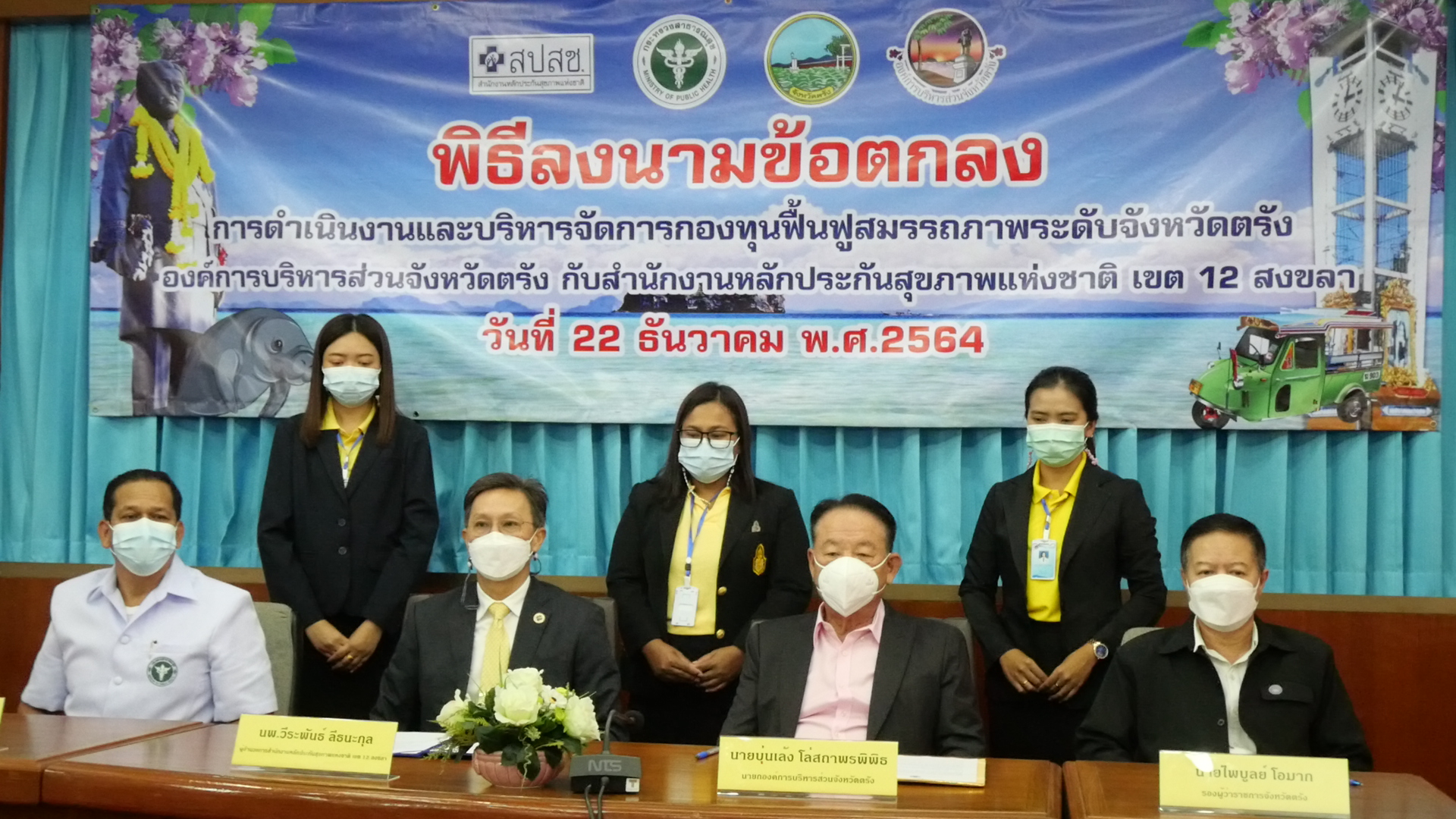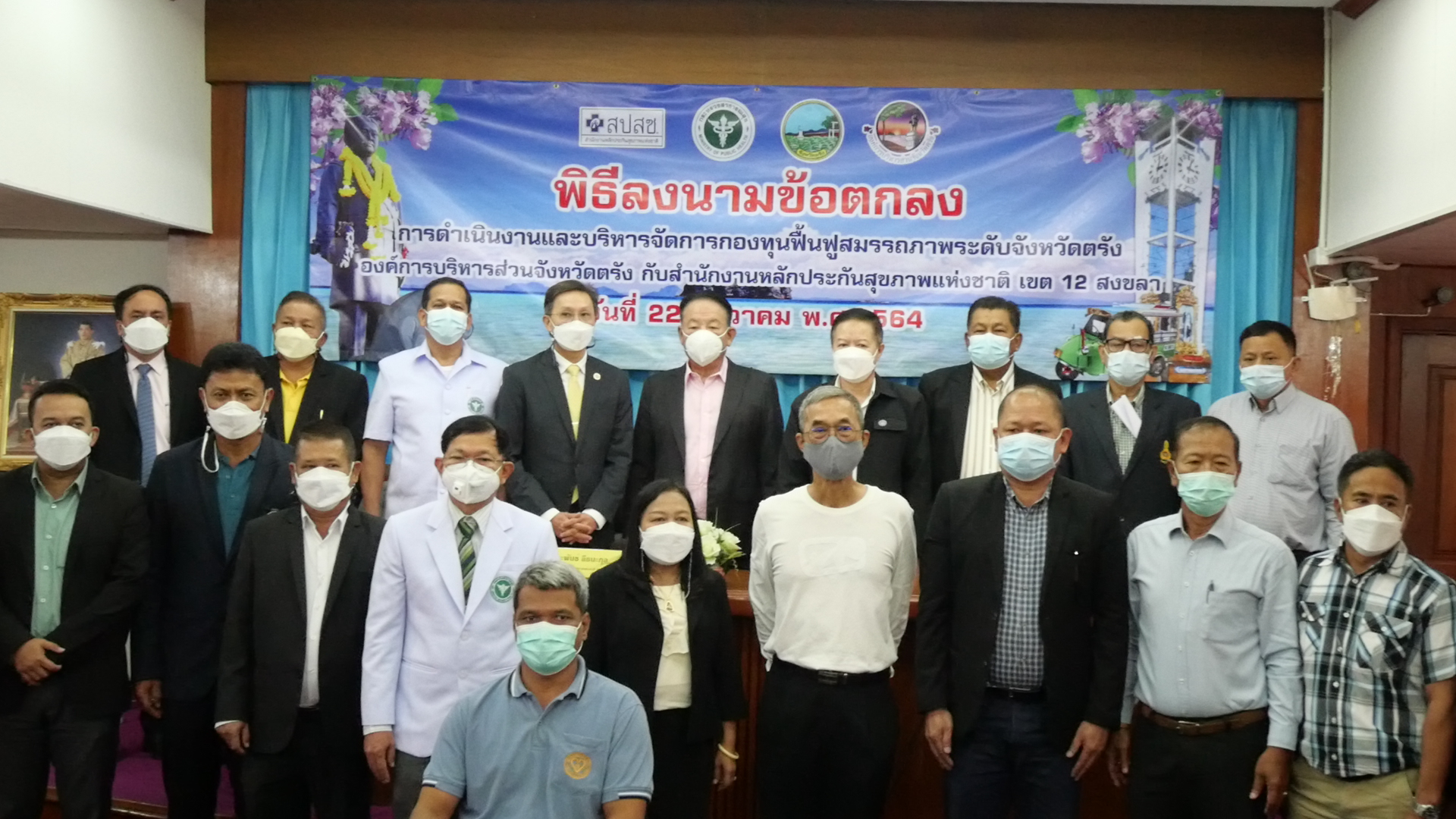 ที่ ห้องประชุมสภา อบจ.ตรัง นายบุ่นเล้ง โล่สถาพรพิพิธ นายก อบจ.ตรัง ลงนามข้อตกลงการดำเนินงานและบริหารจัดการกองทุนฟื้นฟูสมรรถภาพ จังหวัดตรัง ร่วมกับ นพ.วีระพันธ์ ลีธนะกุล ผู้อำนวยการสำนักงานประกันสุขภาพแห่งชาติ เขต12 สงขลา โดยมีนายไพบูลย์ โอมาก รองผู้ว่าราชการจังหวัดตรัง นายแพทย์สาธารณสุขจังหวัดตรัง พัฒนาสังคมและความมั่นคงของมนุษย์จังหวัดตรัง ผู้อำนวยการโรงพยาบาลตรัง ท้องถิ่นจังหวัดตรัง ประธานชมรมคนพิการจังหวัดตรัง สมาชิกสภา อบจ.ตรัง หัวหน้าส่วนราชการ อบจ.ตรัง ร่วมเป็นสักขีพยาน เพื่อให้ประชาชนได้เข้าถึงบริการฟื้นฟูสมรรถภาพที่จำเป็นต่อสุขภาพในจังหวัดอย่างครบวงจร มีประสิทธิภาพ และตอบสนองความต้องการของคนพิการ ผู้สูงอายุ ผู้ป่วยที่อยู่ในระยะกึ่งเฉียบพลัน และผู้ที่มีภาวะพึ่งพิง ให้มีคุณภาพชีวิตที่ดีขึ้น ซึ่งเป็นไปตามประกาศคณะกรรมการหลักประกันสุขภาพแห่งชาติ เรื่องหลักเกณฑ์การดำเนินงานและบริหารจัดการกองทุนฟื้นฟูสมรรถภาพระดับจังหวัด พ.ศ. 2562 และที่แก้ไขเพิ่มเติม หลังจากนั้นมีการประชุมเรื่อง การบริหารจัดการกองทุนฟื้นฟูสมรรถภาพระดับจังหวัด โดยวิทยากร สำนักงานหลักประกันสุขภาพแห่งชาติ เขต 12