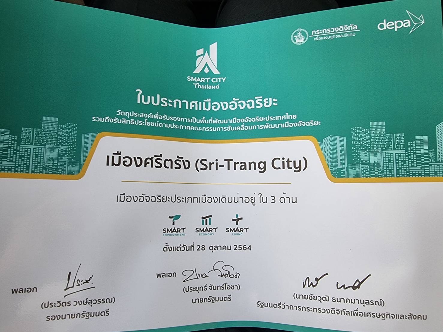 วันนี้ (24 ธ.ค.2564) ที่อาคารภักดีบดินทร์ ทำเนียบรัฐบาล กรุงเทพมหานคร พลเอก ประวิตร วงษ์สุวรรณ รองนายกรัฐมนตรี เป็นประธานในพิธีมอบตราสัญลักษณ์เมืองอัจฉริยะประเทศไทย สำหรับโครงการที่ผ่านการรับรองการเป็นพื้นที่พัฒนาเมืองอัจฉริยะจากคณะกรรมการขับเคลื่อนการพัฒนาเมืองอัจฉริยะ จำนวน 15 เมืองแรกของประเทศไทย ซึ่งจังหวัดตรังมี นายขจรศักดิ์ เจริญโสภา ผู้ว่าราชการจังหวัดตรัง เป็นผู้เข้ารับมอบตราสัญลักษณ์เมืองอัจฉริยะประเทศไทย โครงการเมืองศรีตรัง (Sri-Trang City) ภายใต้วิสัยทัศน์ เมืองสะอาด สงบ ปลอดภัย เป็นมิตรกับสิ่งแวดล้อม