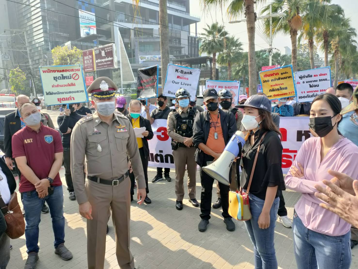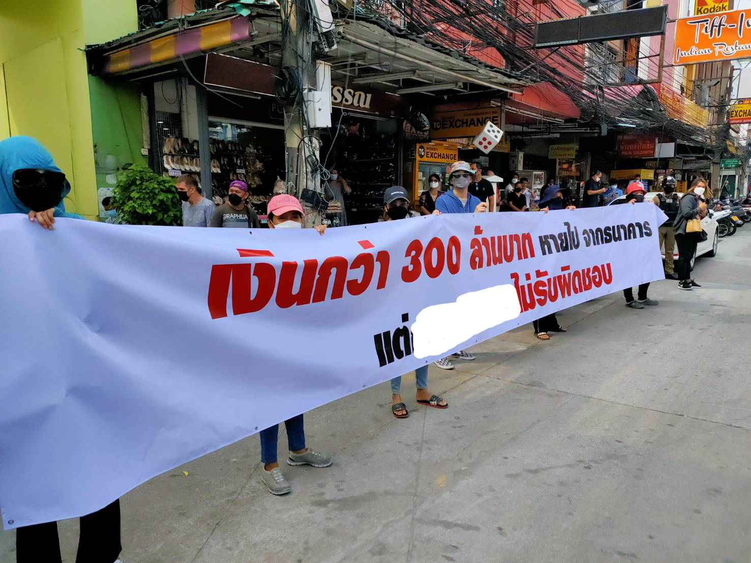 ผู้สื่อข่าวยังรายงานว่า ภายหลังการพูดคุยระหว่างเจ้าทุกข์, พนักงานสอบสวน และตัวแทนธนาคาร ซึ่งได้กล่าวเพียงว่า ขอมารับฟังปัญหาแต่ไม่มีอำนาจตัดสินใจ.ทำให้กลุ่มผู้เสียหายชาวต่างชาติมากกว่า 100 คน ได้เคลื่อนขบวนไปรวมตัวกันที่ธนาคารดังกล่าว