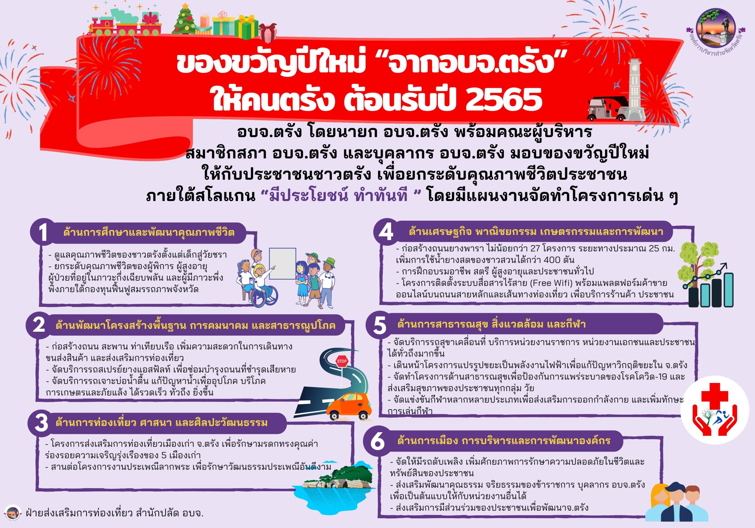 วันที่ 30 ธันวาคม 2564 อบจ.ตรัง โดยนายบุ่นเล้ง โล่สถาพรพิพิธ นายก อบจ.ตรัง พร้อมคณะผู้บริหาร สมาชิกสภา อบจ.ตรัง และบุคลากร อบจ.ตรัง มอบของขวัญปีใหม่ให้กับประชาชนชาวตรัง เพื่อยกระดับคุณภาพชีวิตประชาชน ภายใต้สโลแกน “มีประโยชน์ ทำทันที ” โดยมีแผนงานจัดทำโครงการเด่น ๆ เช่น