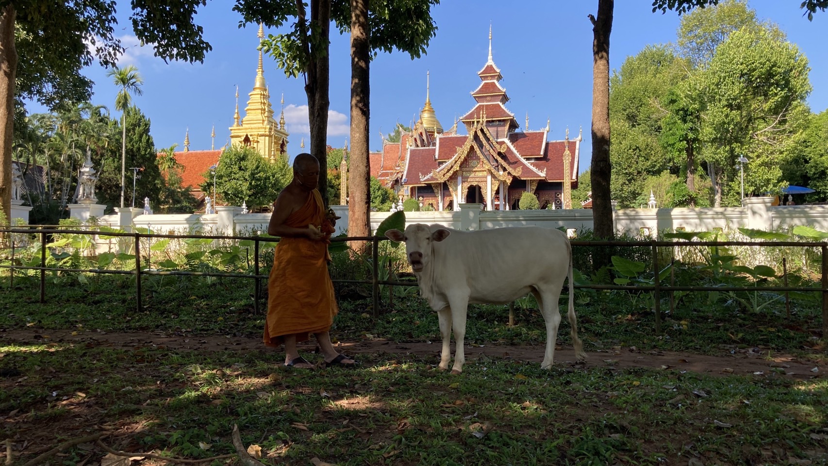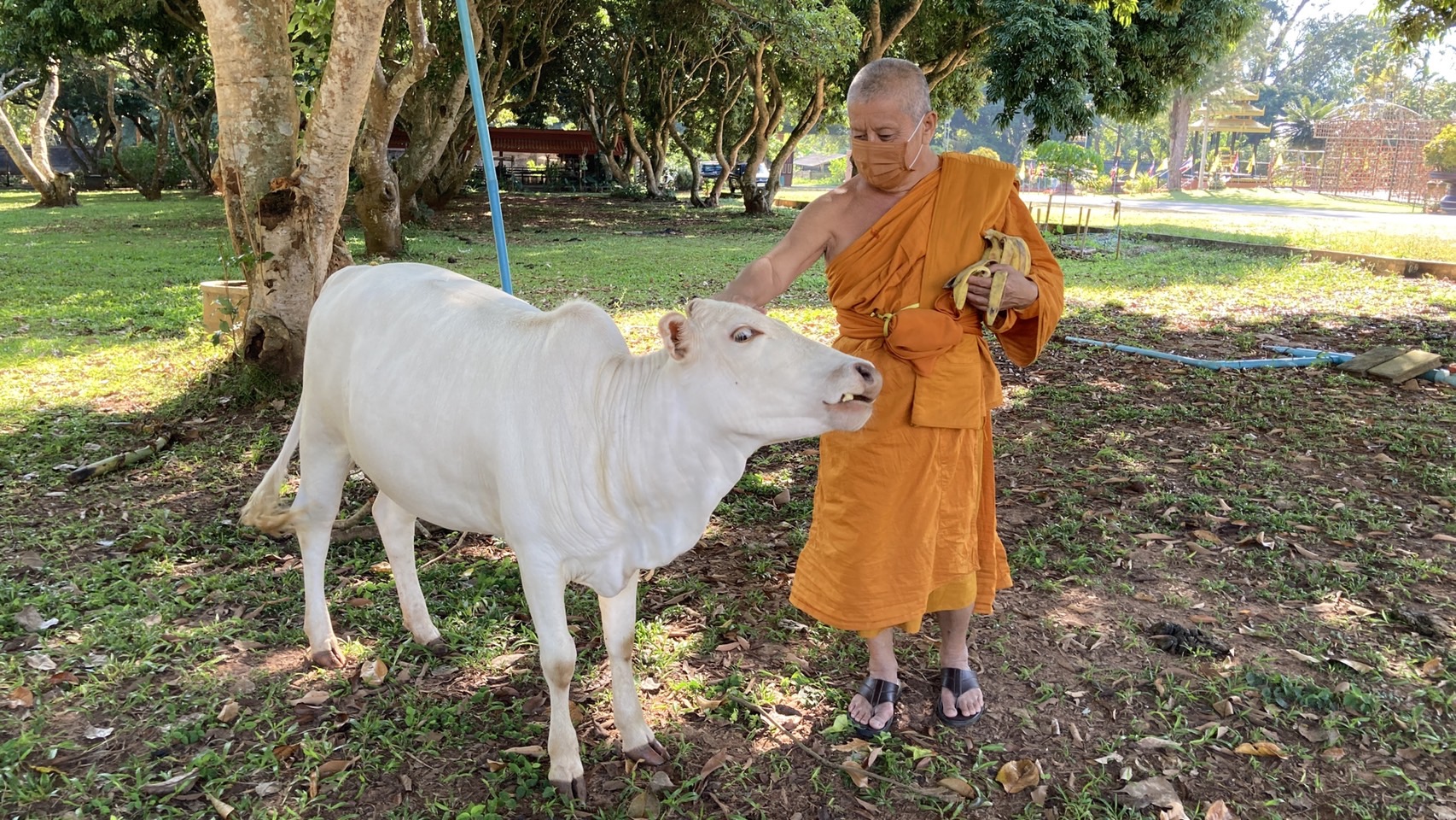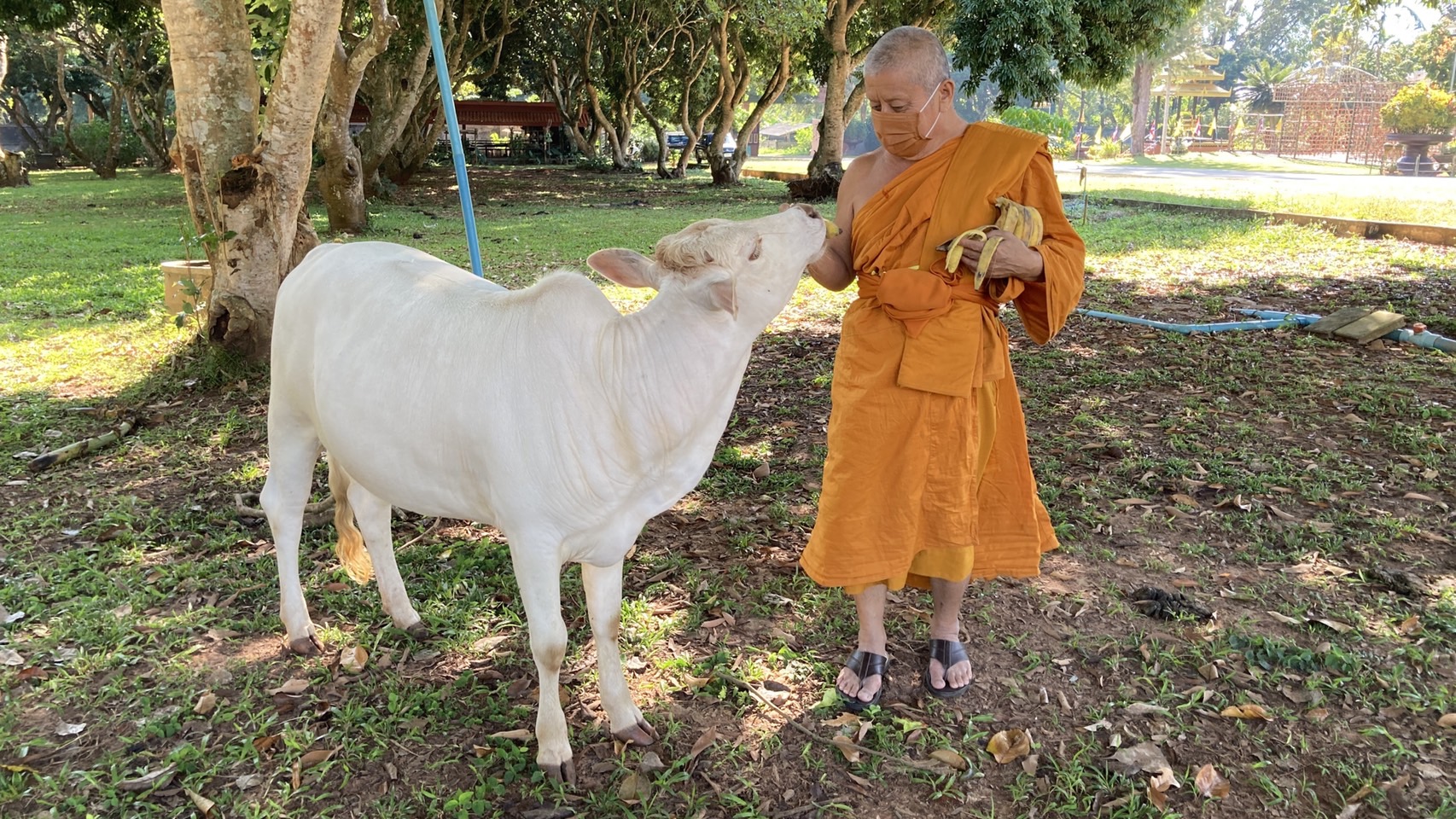 พระครูสถิตธรรมมาภิรักษ์ เจ้าคณะอำเภอไชยปราการ จังหวัดเชียงใหม่ เจ้าอาวาสวัดป่าไม้แดง(พระเจ้าพรหมมหาราช)เป็นพระที่จะชอบไปไถ่ชีวิตวัวควายที่เขาขายเพื่อเข้าโรงฆ่าสัตว์ ท่านจะไปไถ่มาเลี้ยงไว้ในวัด จะมีคนมาช่วยเลี้ยงที่คอยดูแลหาอาหารมาให้ ท่านได้ไปไถ่วัวตัวเมียสีแดงดำมาตัวหนึ่ง บังเอิญว่าติดลูกมาในท้องแล้ว และได้เกิดมาเป็นลูกวัวสีขาวสะอาด ท่านก็ได้เลี้ยงมาอายุยังไม่ถึงปีแต่โตเร็ว และจำเสียงของหลวงพ่อพระครูสถิตธรรมมาภิรักษ์ ได้ดีมากๆ ทุกวันหลวงพ่อจะตื่นแต่เช้าเดินตรวจในบริเวณวัด วัวขาวตัวนี้จะจำถึงจังหวะที่เดินได้ พอได้ยินก็จะเดินมาหาทันที หรือถ้าได้ยินเสียงหลวงพ่อเรียกญาติธรรม เมื่อได้ยินก็จะเดินมาหาทันที