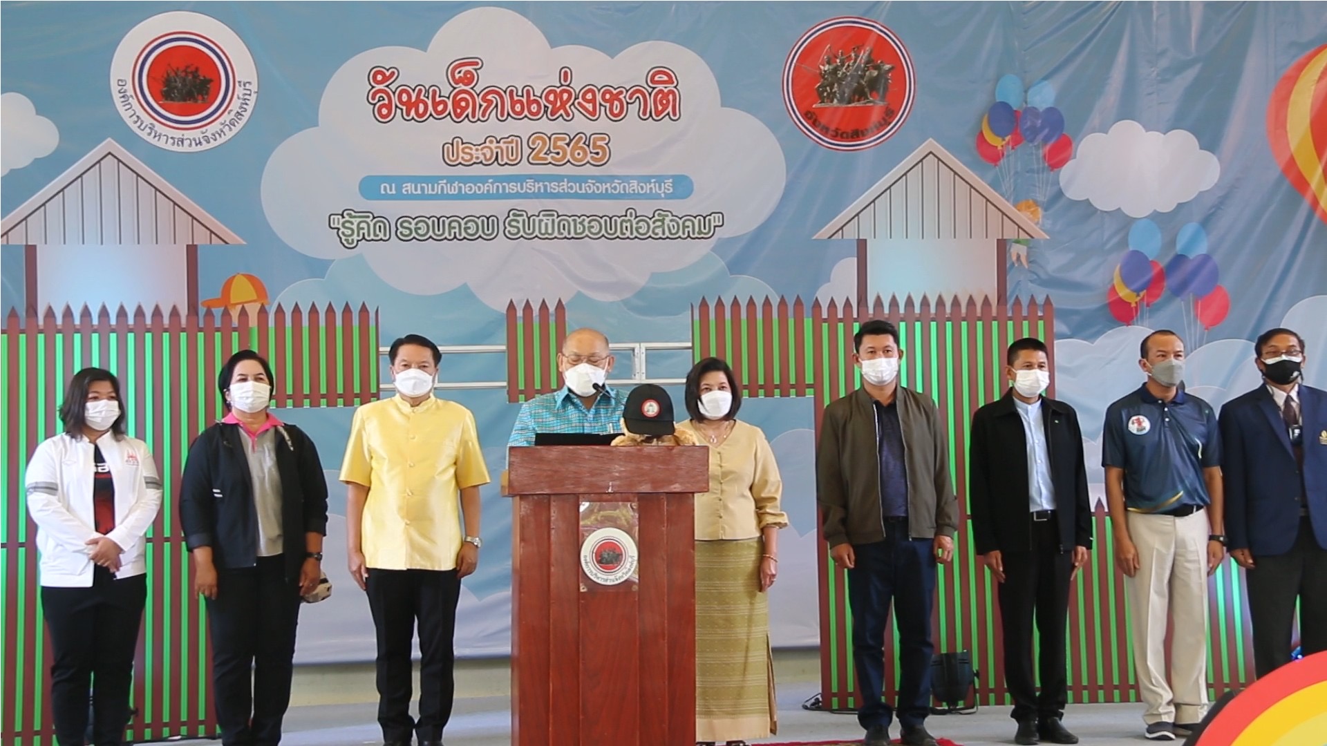 วันที่ 8 มกราคม 2565 จังหวัดสิงห์บุรี ร่วมกับ องค์การบริหารส่วนจังหวัดสิงห์บุรี จัดงานวันเด็กสิงห์บุรี ประจำปี 2565 นายชัยชาญ สิทธิวิรัชธรรม ผู้ว่าราชการจังหวัดสิงห์บุรี เป็นประธานเปิดงานวันเด็ก วิถีใหม่ เพลิน Online & Onsite อ่านสาส์นวันเด็กของฯพณฯนายกรัฐมนตรี และคำขวัญวันเด็ก”รู้คิด รอบคอบ รับผิดชอบต่อสังคม”แล้วมอบโลห์รางวัลและของที่ระลึกให้เด็กและเยาวชนดีเด่น และจับรางวัลพิเศษมอบโชคให้กับเด็กและเยาวชนที่มาร่วมกิจกรรม โดยมีนายโชติวุฒิ ธนาคมานุสรณ์ สมาชิกสภาผู้แทนราษฎร สิงห์บุรี นางจิตติวรรณ สิทธิวิรัชธรรม นายกเหล่ากาชาดจังหวัดสิงห์บุรี นายสัมฤทธิ์ กองเงิน รองผู้ว่าราชการจังหวัดสิงห์บุรี นายศุภวัฒน์ เทียนถาวร นายกองค์การบริหารส่วนจังหวัดสิงห์บุรี สมาชิกสภา อบจ.สิงห์บุรี นายณรงศักดิ์ วิงวอน นายกเทศมนตรีเมืองสิงห์บุรี และหัวหน้าส่วนราชการ
