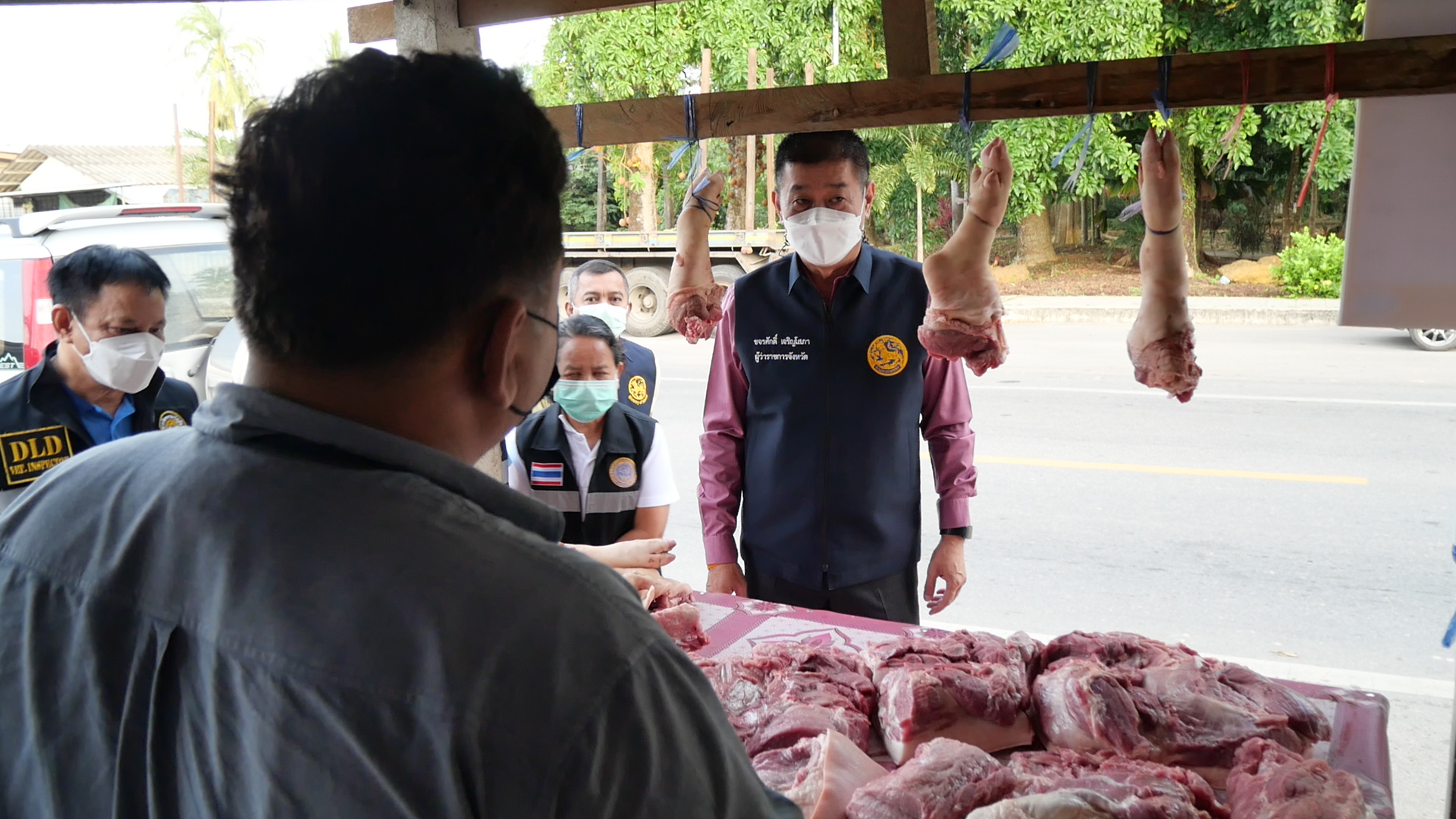 นายขจรศักดิ์ เจริญโสภา ผู้ว่าราชการจังหวัดตรัง พร้อมด้วย นางสาวสุภากิตติ์ เกลี้ยงสงค์ พาณิชย์จังหวัดตรัง นายสุรจิต วิชชุวรรณ ปศุสัตว์จังหวัดตรัง และ นายภานุวัฒน์ พูลสวัสดิ์ ผู้อำนวยการศูนย์ดำรงธรรมจังหวัดตรัง ลงพื้นที่ร้านน้องดิว หน้าสวนสาธารณะนาหมื่นราษฎร์ ตำบลโคกหล่อ อำเภอเมืองตรัง และ ร้านหมูสด แยกวัดตันตยาภิรมณ์ ถนน ตรัง-สิเกา เพื่อติดตามการดำเนินโครงการหมูพาณิชย์ลดราคา ช่วยประชาชน จังหวัดตรัง จำหน่ายหมูเนื้อแดงในราคากิโลกรัมละ 150 บาท ตามนโยบายของรองนายกรัฐมนตรีและรัฐมนตรีว่าการกระทรวงพาณิชย์ (นายจุรินทร์ ลักษณวิศิษฎ์) เพื่อเป็นการแก้ปัญหาเร่งด่วนในภาวะราคาหมูที่สูงขึ้นและให้ประชาชนมีช่องทางในการเลือกซื้อเนื้อหมูราคาถูกกว่าท้องตลาด