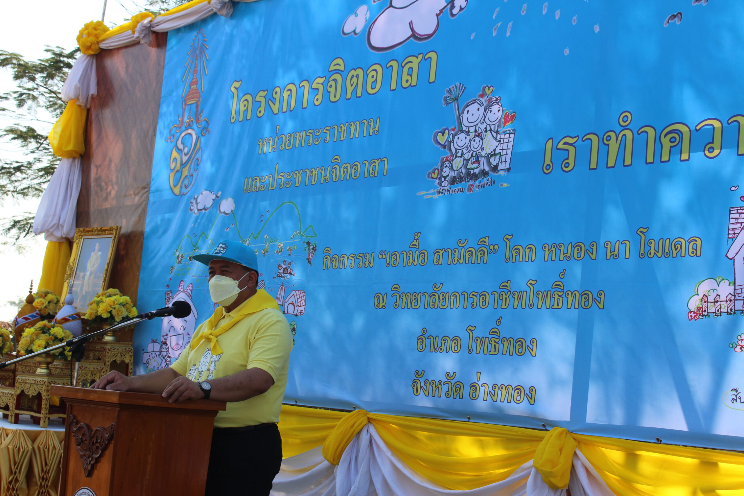 เมื่อวันที่ 15 มกราคม พ.ศ. 2565 เวลา 09.30 น ดร.มงคลชัย สมอุดร รองปลัดสำนักนายกรัฐมนตรี เดินทางมาเป็นประธานในพิธีเปิดกิจกรรม จิตอาสาพัฒนา “โคกหนองนา โมเดล” ของวิทยาลัยการอาชีพโพธิ์ทอง ตั้งอยู่หมู่ที่ 2 ต.บางเจ้าฉ่า อ.โพธิ์ทอง จ.อ่างทอง ณ บริเวณพื้นที่หนองลาดตะเพียนจำนวน 42 ไร่ เศษโดยใช้พื้นที่ดังกล่าวบางส่วนเพียง 3 ไร่เศษๆเพื่อทดลองให้เป็นศูนย์เรียนรู้ โคก หนอง นา โมเดล ของนักศึกษาและประชาชาที่สนใจทั่วไปได้เข้ามาเรียนรู้ เป็นการสอดคล้องกับโครงการตามแนวพระราชดำริ ที่ให้ส่งผลให้การทำการเกษตรมีความสมบูรณ์แบบตามหลักปรัชญาเศรษฐกิจพอเพียงอย่างยั่งยืน