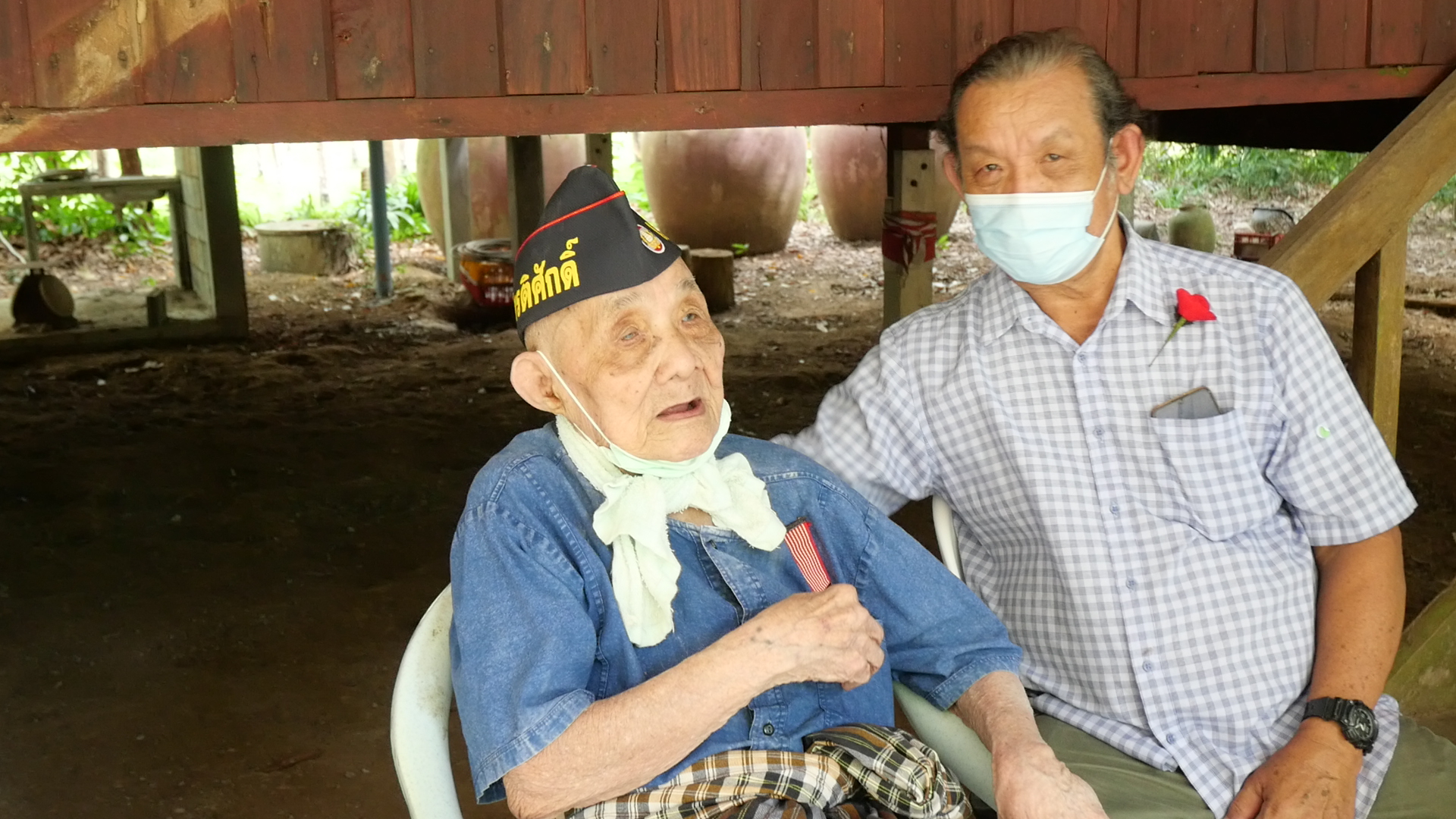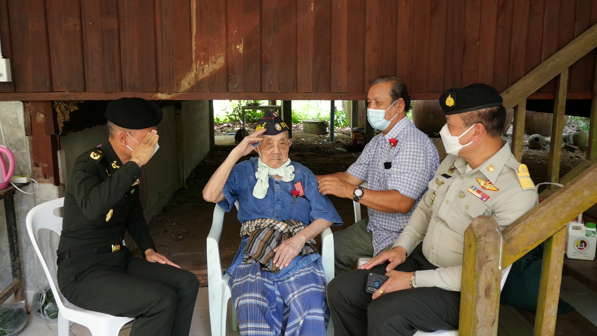 ผู้บัญชาการมณฑลทหารบกที่ 43 และ หัวหน้าสำนักงานสงเคราะห์ทหารผ่านศึกเขตกระบี่ ให้กำลังใจและมอบเครื่องอุปโภค บริโภค ให้กับทหารผ่านศึกในสมัยสงครามโลกครั้งที่ 2 สงครามมหาเอเชียบูรพา
