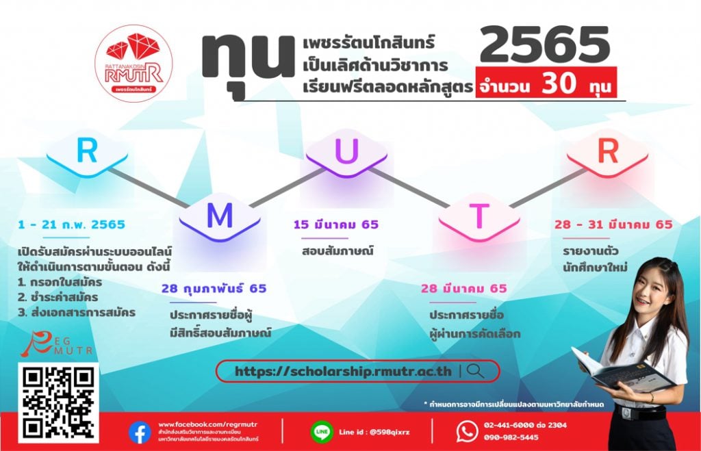 มหาวิทยาลัยเทคโนโลยีราชมงคลรัตนโกสินทร์เปิดรับสมัครคัดเลือกบุคคลเข้าศึกษาต่อระดับปริญญาตรี โครงการเพชรรัตนโกสินทร์ ประจำปีการศึกษา 2565 เปิดรับสมัครตั้งแต่วันที่ 1 – 21 กุมภาพันธ์ 2565 ผู้สมัครสามารถเข้าไปดูรายละเอียดเพิ่มเติมได้ที่ >>> https://scholarship.rmutr.ac.th