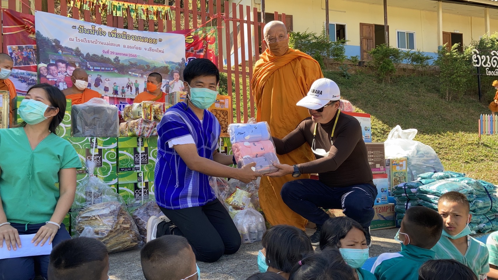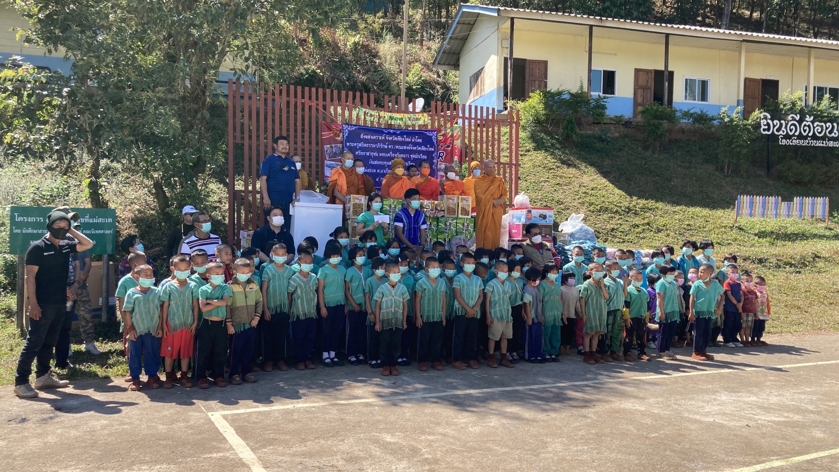 คุณชวลิต ศรีธเนตกุล พร้อมคณะมอบตู้เย็นถนอมอาหารพร้อมบริการรถยนต์ออฟโรดถวายให้พระเณรได้โดยสารไปร่วมงาน และคุณรัศมี แสงนามวงค์ ประธานอาสาสมัครคุมประพฤติสำนักงานคุมประพฤติจังหวัดเชียงใหม่สาขาฝาง และตัวแทนออฟโรสขอนแก่น ตัวแทนออฟโรสลำพูน ตัวแทนออฟโรสกรุงเทพ คุณพงษศักดิ์ คุณพนิดา เวชชานุเคราะห์ มอบอุปกรณ์การเรียน การสอน พร้อมชุดวอร์มกีฬา(กันหนาวได้)นักเรียน อาหารแห้ง คุณชาริดา สุคันทา มอบปลากระป๋องและร่วมในการเดินทางไปมอบต้องใช้เวลาในการเดินทางหลายชั่วโมงกับรถยนต์โพลวินล์ โรงเรียนบ้านแม่สะเต ซึ่งเป็นโรงเรียนห่างไกลความเจริญและการเดินทางที่ลำบาก และยังขาดแคลนครูผู้สอน โดยมี นายนิรันดณ์ ภักดีไพร รองผู้อำนวยการโรงเรียนบ้านห้วยน้ำขาว มาทำการรักษาการณ์ ผู้อำนวยการโรงเรียนบ้านแม่สะเต มีครูเจ้าหน้าที่จำนวน 6 คน ที่ช่วยสอนเด็กนักเรียน ครูข้าราชการ1 ตำแหน่ง พนักงานราชการ1 ตำแหน่ง ธุระการ1ตำแหน่ง ครูพี่เลี้ยงอัตราจ้าง1 ตำแหน่ง พี่เลี้ยงอนุบาล1 ตำแหน่ง มีทั้งหมดเพียง6 คน เปิดเรียนตั้งแต่ระดับชั้นอนุบาลปีที่ 2 จนถึงระดับชั้นประถมปีที่ 6 มีนักเรียนทั้งหมดจำนวน 74 คน ห่างจากตัวอำเภออมก๋อย ประมาณ 70 กิโลเมตร ที่ต้องใช้การเดินทางทั้งรถยนต์และจักรยานยนต์ ถึง 3 ชั่วโมงเศษ