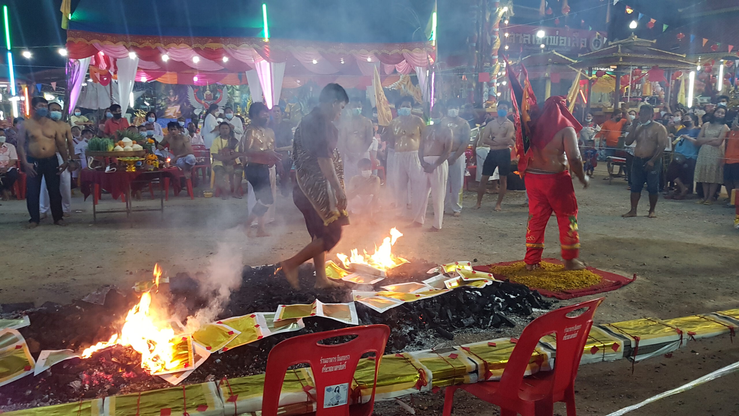 **********สุดท้ายเป็นพิธี ที่4 ของการเดินลุยทะเลเพลิง หรือเรียกว่าเดินลุยไฟ เป็นอันดับสุดท้าย โดยเจ้าหน้าที่เตรียมถ่านสีดำ จุดไฟไปพร้อมกับกองประทัดราดด้วยน้ำมันให้ไฟลุกโชนจนทำให้ถ่านมอดติดเป็นสีแดง จากนั้นใช้เหล็กแผ่นยาวตีให้เกิดลูกไฟ ประกายไฟสีแดง เพื่อแสดงให้เห็นว่า ถ่านมีความร้อนจริงๆ จากนั้นอากงเจ้าพ่อเสือ ได้เดินลุยไฟ ไปมาหลายรอบ ทั้งนี้ได้แสดงอิทธิฤทธิ์ของความศักดิ์สิทธิ์ในพิธีกรรม โดยนำพาลูกศิษย์เดินลุยไฟ โดยมีน้ำมนต์ หรือผ้ายันต์คอยคลุมที่ศีรษะแล้วพาเดินลุยไฟไปด้วยกัน โดยไม่มีบาดแผลพุพองแต่อย่างใด เชื่อว่าเกิดจากความศักดิ์สิทธิ์ของพิธีกรรมที่เข้มขลัง
