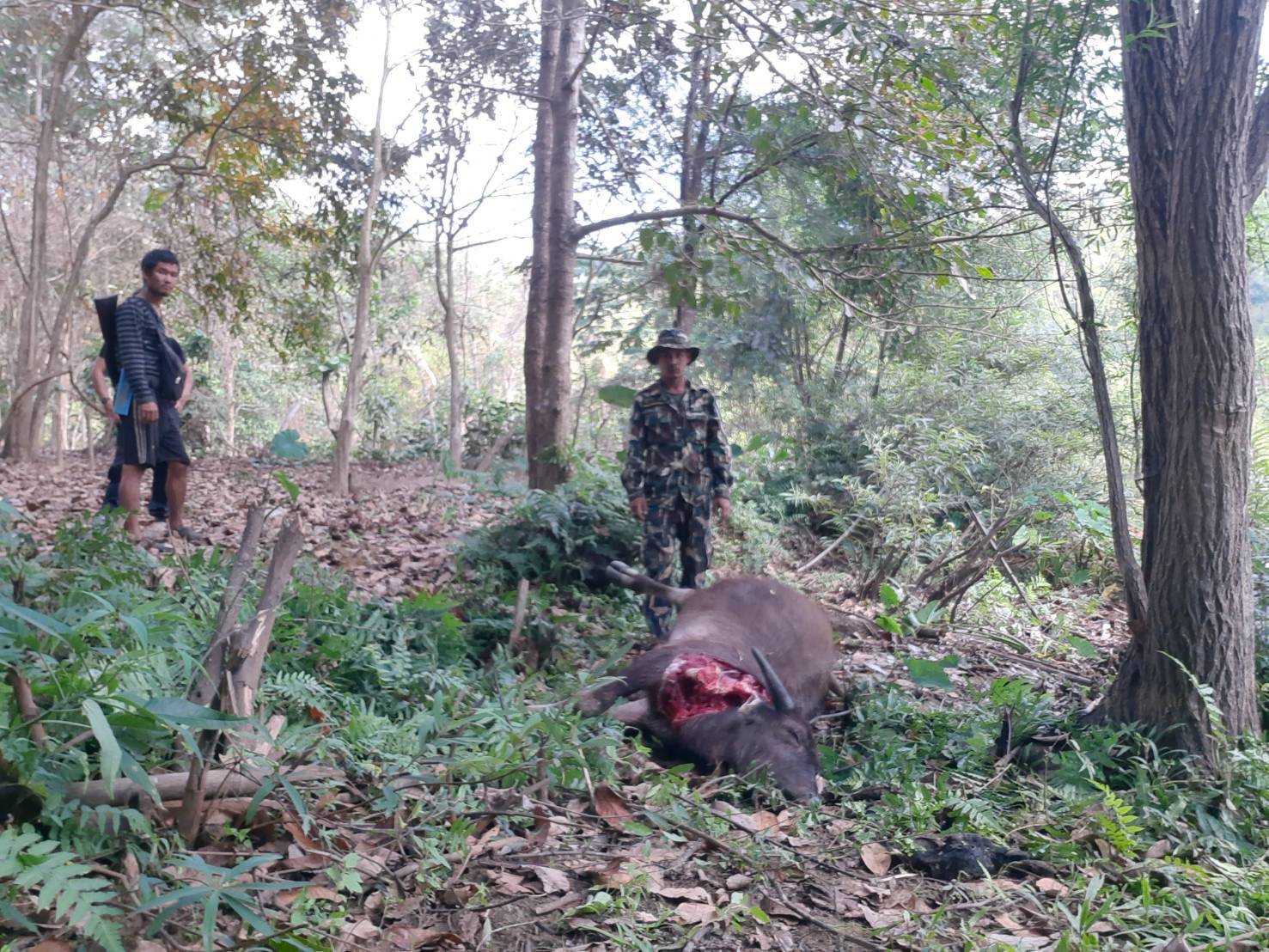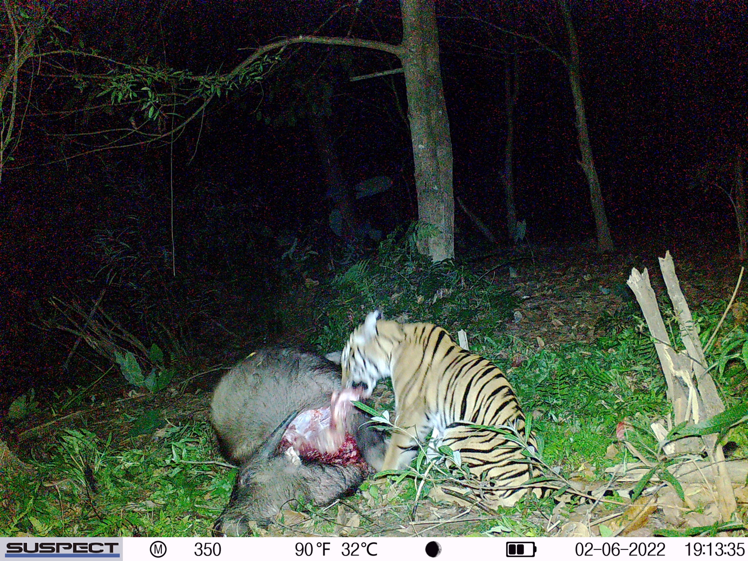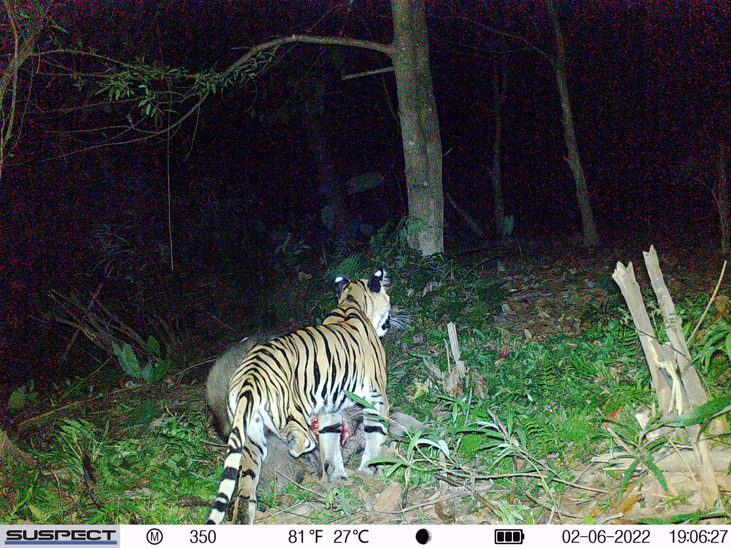 เพื่อทำการติดตั้งกล้องดักถ่ายภาพสัตว์ป่า (Camera Trap) จำนวน 20 ตัว ร่วมกับเจ้าหน้าที่ประจำอุทยานแห่งชาติเขาแหลม เพื่อติดตามเสือโคร่งที่อยู่ในพื้นที่ป่าดังกล่าว ตั้งแต่วันที่ 4-7 ก.พ. 65 ต่อมาได้พบซากควายบริเวณสามแยกสะมะท้อที่ได้มีการติดกล้องดักถ่ายภาพสัตว์ป่า จึงได้ทำการตรวจสอบข้อมูลภาพถ่ายจากกล้องตัวดังกล่าว ในวันที่ 6 ก.พ. 56 ปรากฏว่า พบเสือโคร่งจำนวน 1 ตัว มีลักษณะขาหลังด้านขวาขาขาด หรือพิการใช้การไม่ได้ น่าสงสาร กำลังกินซากควาย อยู่