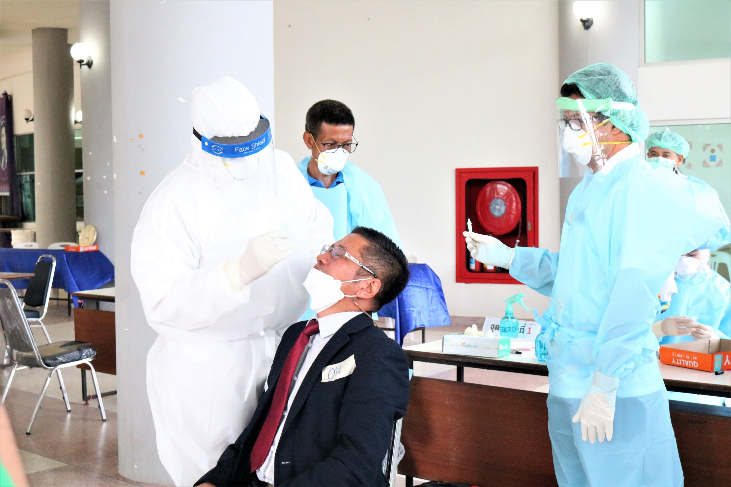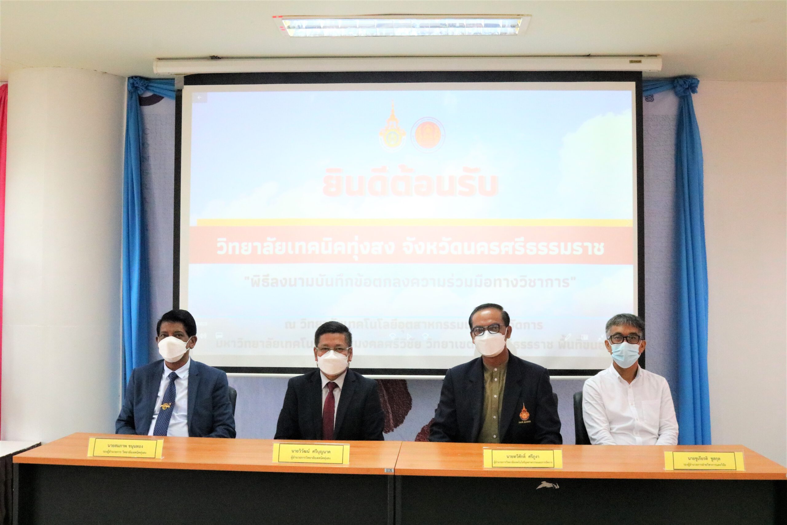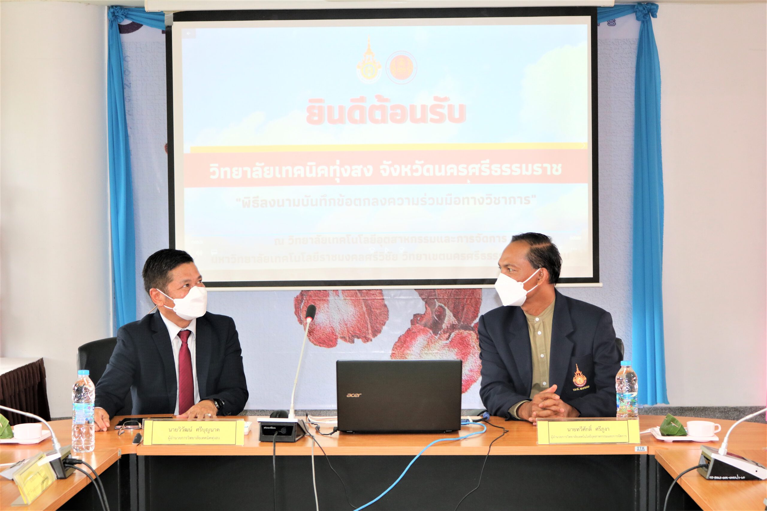 วันที่ 9 กุมภาพันธ์ 2565 ณ วิทยาลัยเทคโนโลยีอุตสาหกรรมละการจัดการ มหาวิทยาลัยเทคโนโลยีราชมงคลศรีวิชัย พื้นที่ขนอม จังหวัดนครศรีธรรมราช นายทวีศักดิ์ ศรีภูงา ผู้อำนวยการวิทยาลัยเทคโนโลยีอุตสาหกรรมละการจัดการ และ นายชูเกียรติ ชูสกุล รองผู้อำนวยการฝ่ายวิชาการและวิจัย ร่วมบันทึกความร่วมมือทางวิชาการ กับ นายวิวัฒน์ ศรีบุญนาค ผู้อำนวยการวิทยาลัยเทคนิคทุ่งสง จังหวัดนครศรีธรรมราช และ นายสมภพ ขนุนทอง รองผู้อำนวยการ โดยมีคณะผู้บริหาร อาจารย์ และบุคลากรเข้าร่วมเป็นพยานในการลงนามครั้งนี้ ทั้งนี้ ก่อนเข้าสู่พิธีการลงนามบันทึกข้อตกลงนั้น ทางคณะดำเนินงานได้รับความอนุเคราะห์จาก สาธารณสุขอำเภอขนอม ในการตรวจหาเชื้อไวรัสโคโรนา 2019 (COVID-19) ด้วยชุดตรวจ Antigen Test Kit (ATK) ตามกระบวนการมาตรการอย่างเคร่งครัด