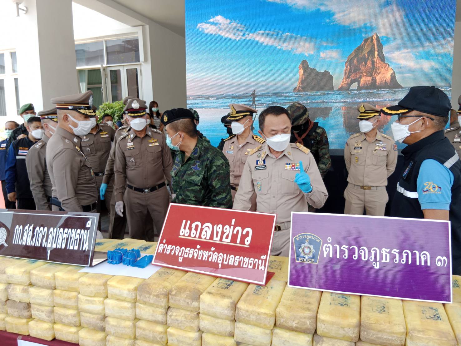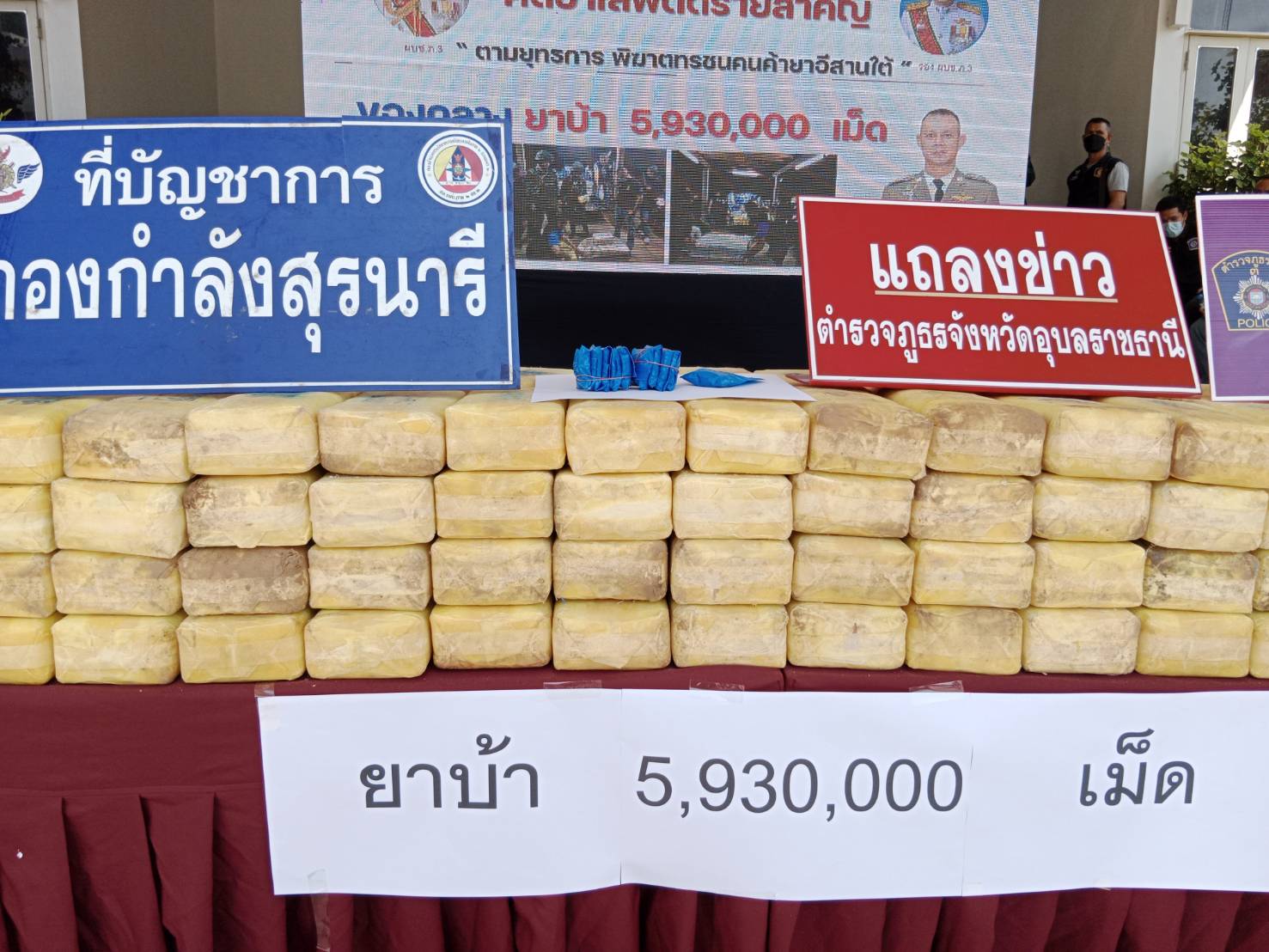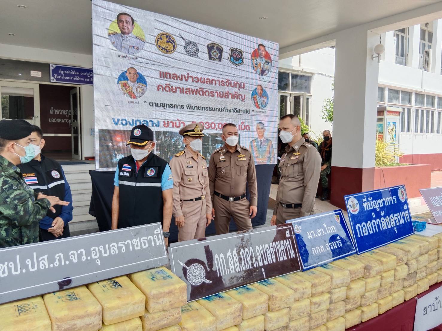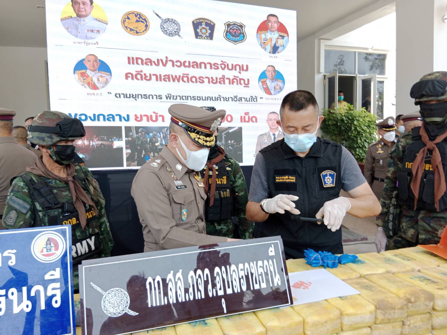 อุบลฯ แถลงผลการจับกุมคดียาเสพติดตราสัญลักษณ์ตอง 999 เป็นของว่าแดงตอนใต้