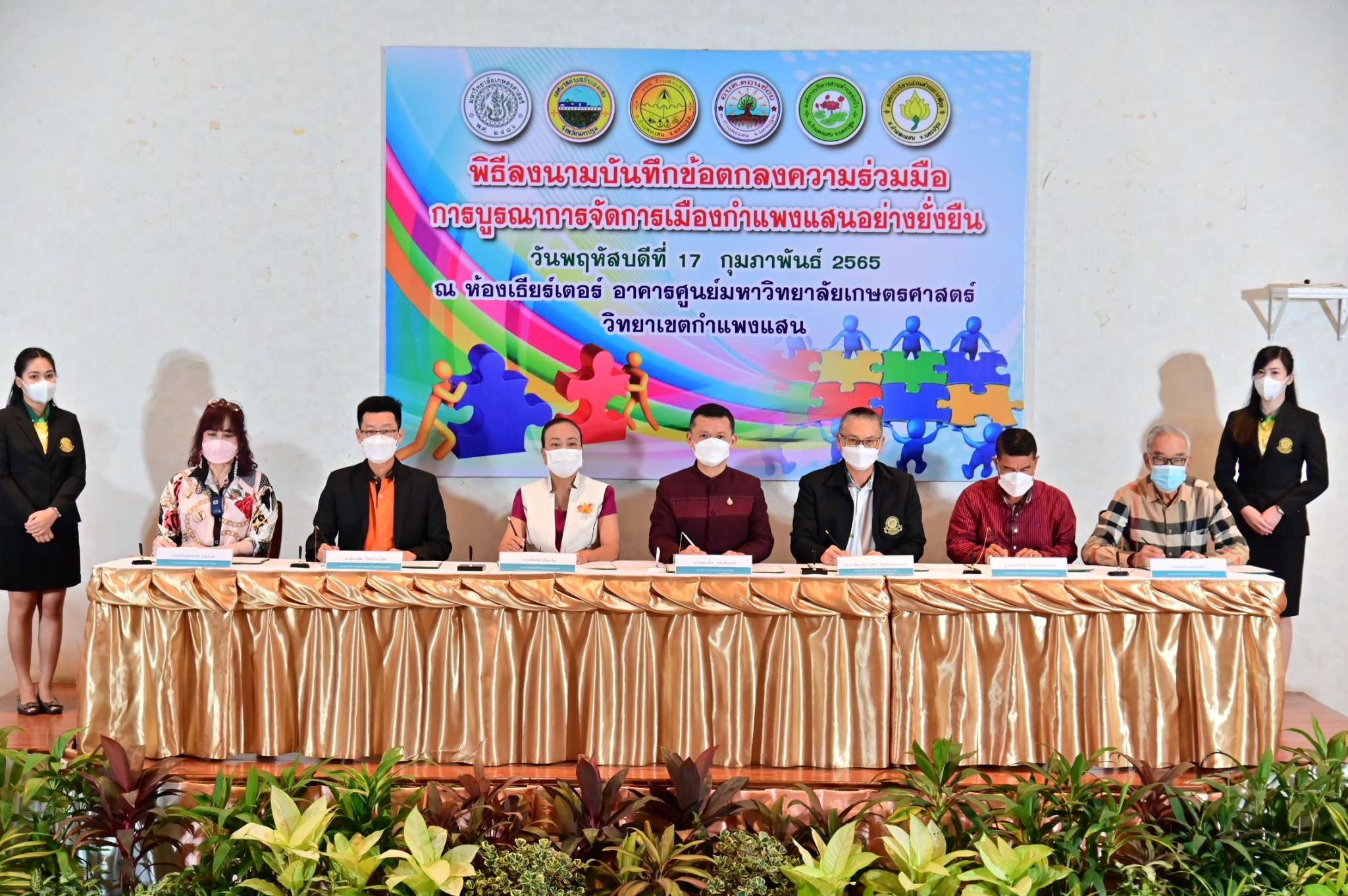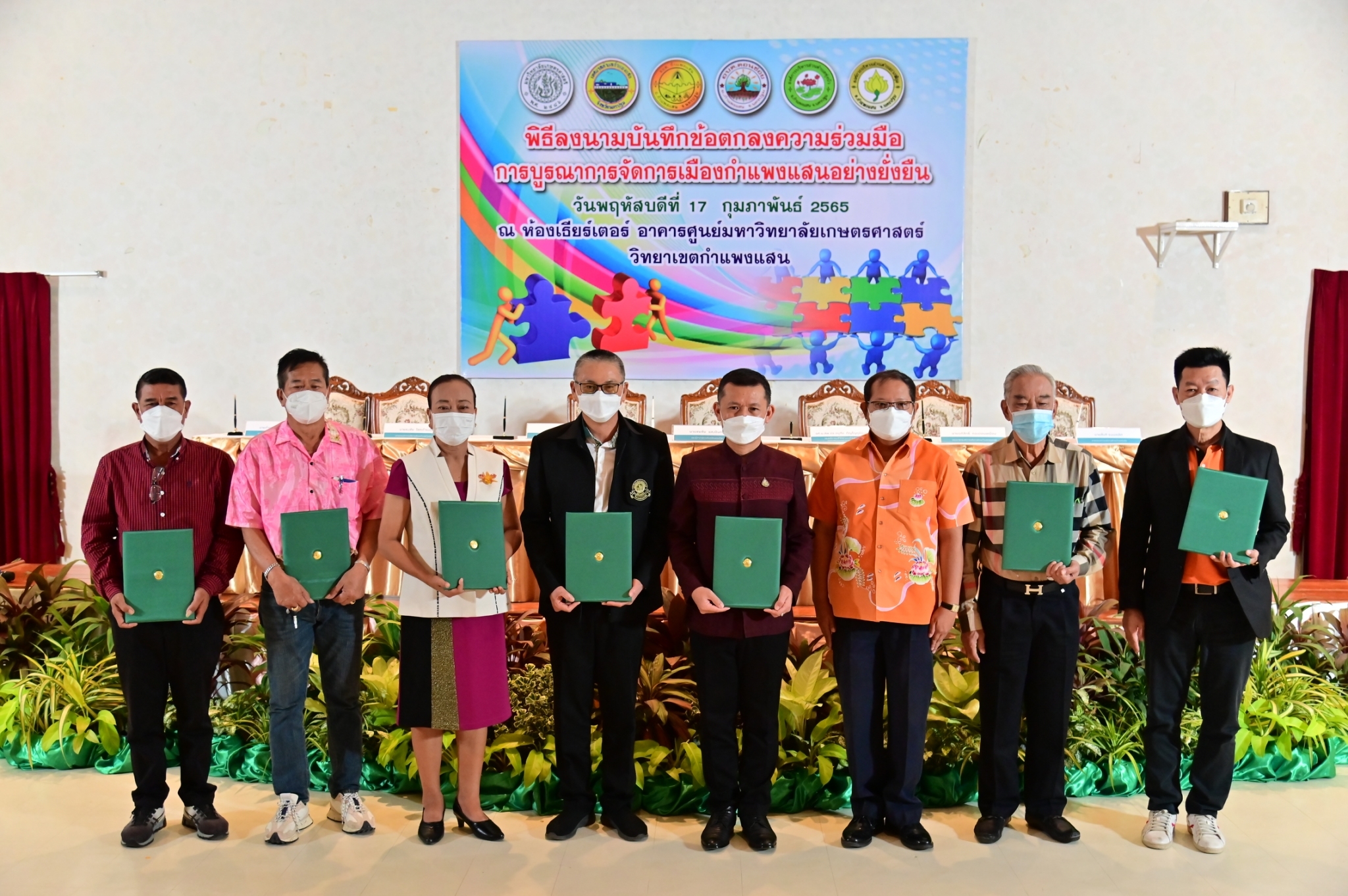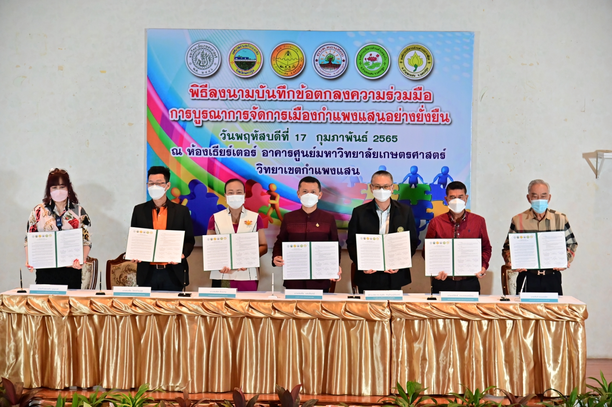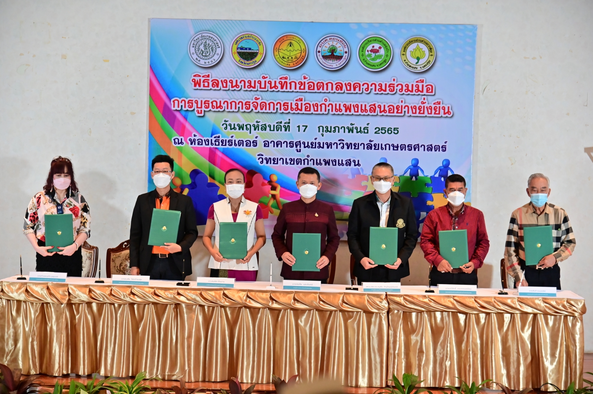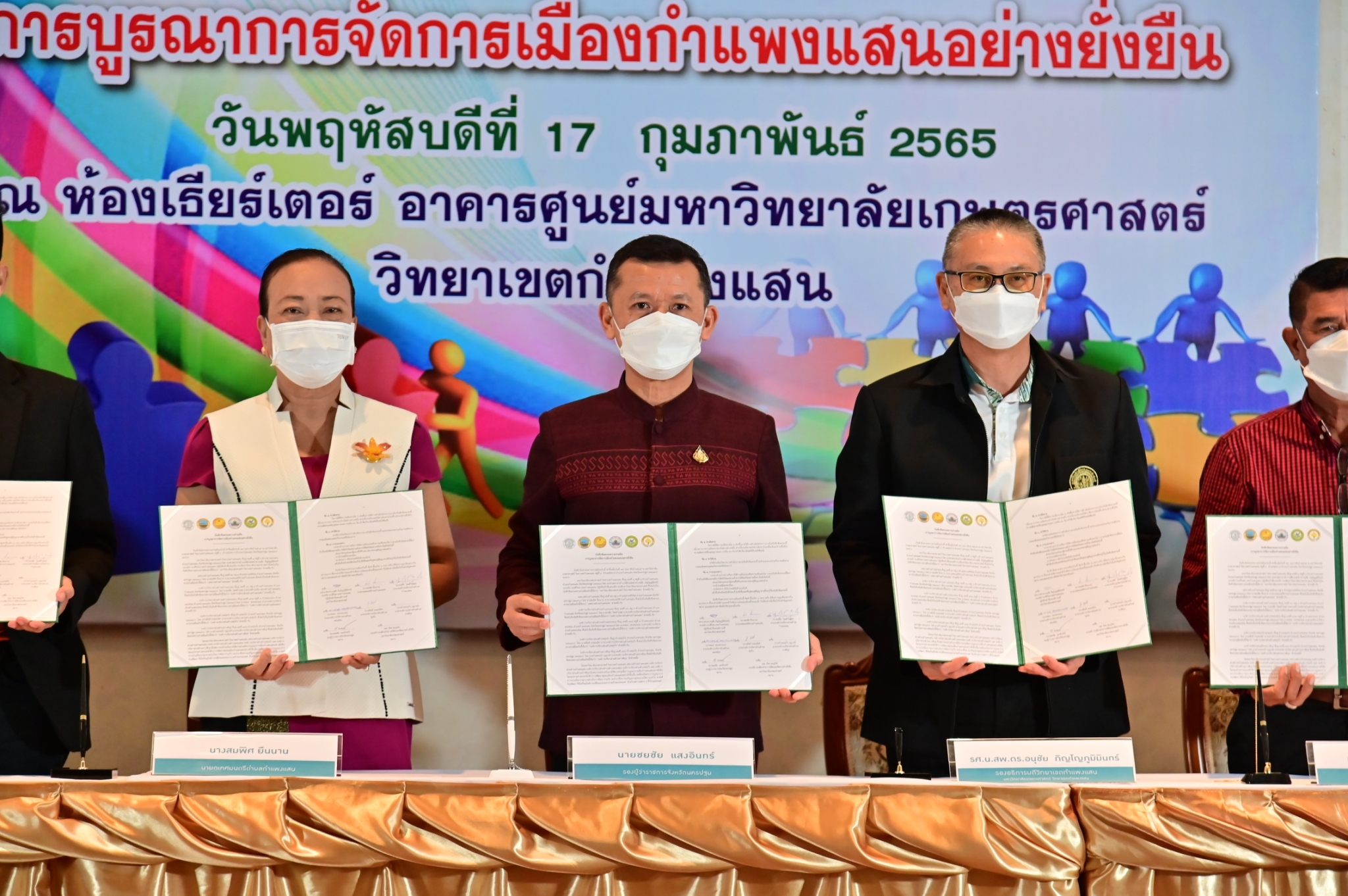 วันที่ 17 กุมภาพันธ์ 2565 ที่ห้องประชุม ศูนย์มหาวิทยาลัยเกษตรศาสตร์ วิทยาเขตกำแพงแสน จังหวัดนครปฐม นายชยชัย แสงอินทร์ รองผู้ว่าราชการจังหวัดนครปฐม พร้อมด้วย รองศาสตราจารย์ นายสัตวแพทย์ ดร.อนุชัย ภิญโญภูมิมินทร์ รองอธิการบดีวิทยาเขตกำแพงแสน นายกเทศมนตรีตำบลกำแพงแสน และนายกองค์การบริหารส่วนตำบลในพื้นที่อำเภอกำแพงแสน ได้แก่ ตำบลกำแพงแสน ตำบลดอนข่อย ตำบลทุ่งบัว และตำบลรางพิกุล ร่วมลงนามบันทึกข้อตกลงความร่วมมือการบูรณาการจัดการเมืองกำแพงแสนอย่างยั่งยืน