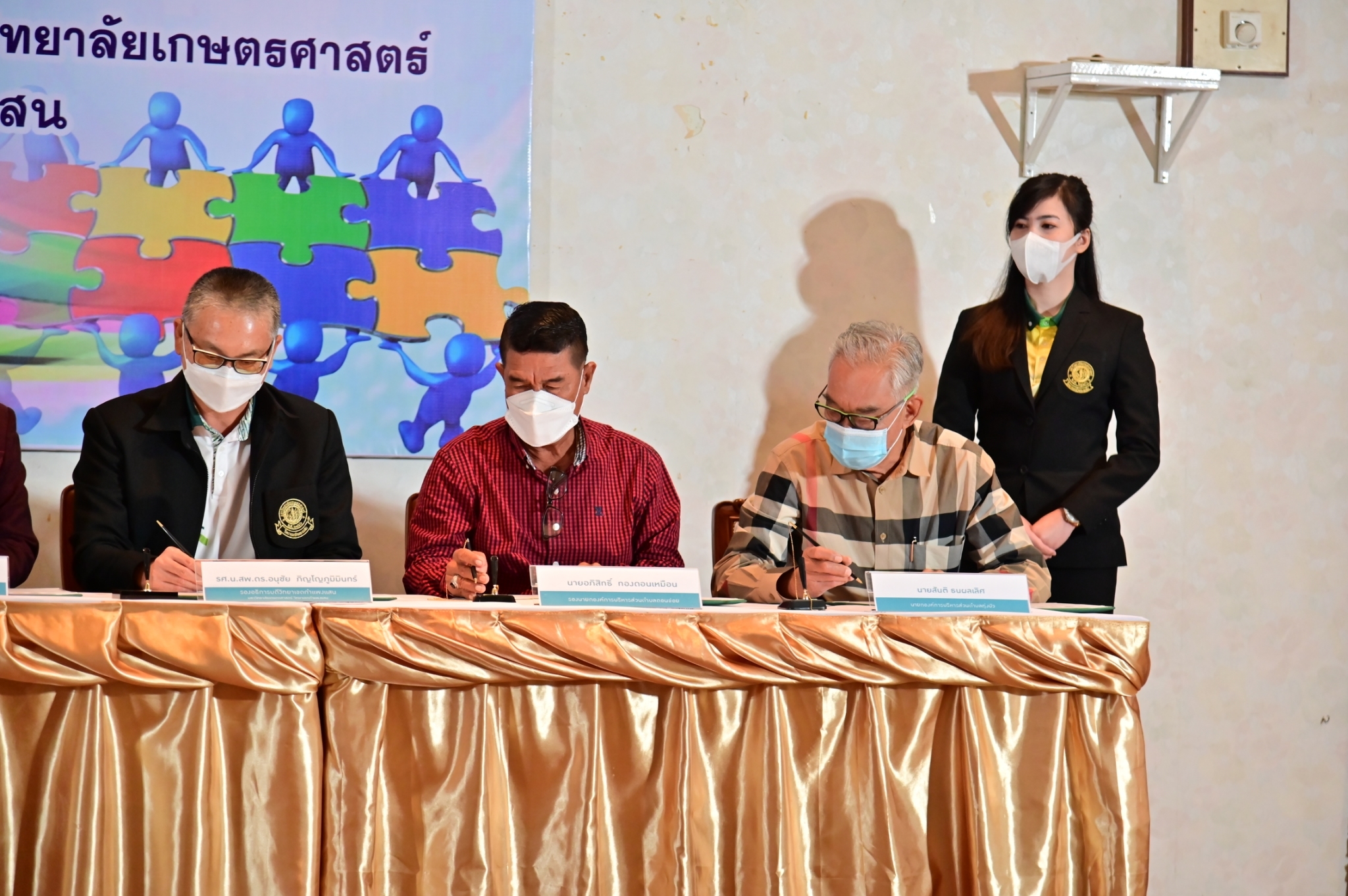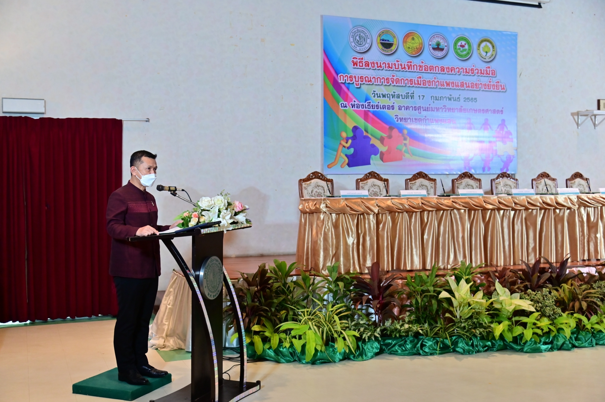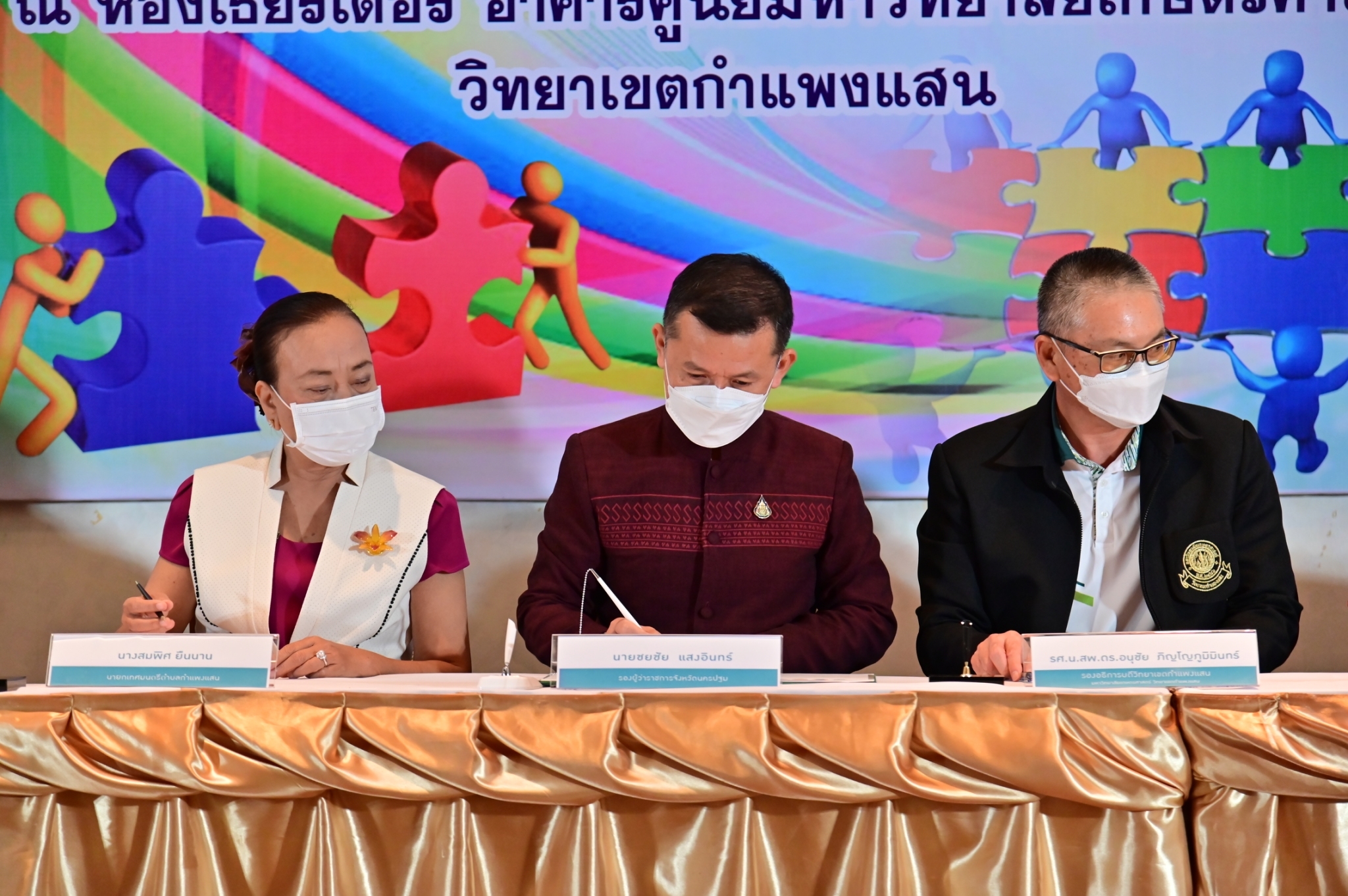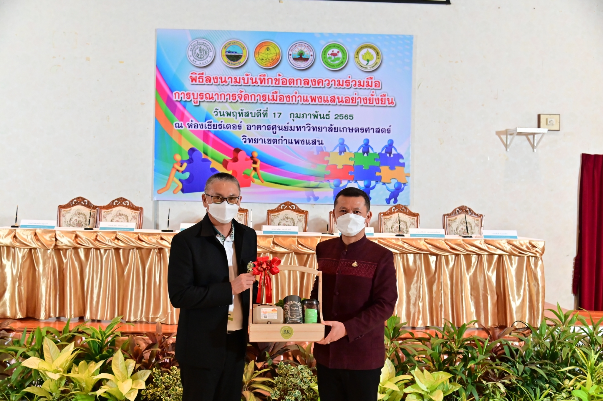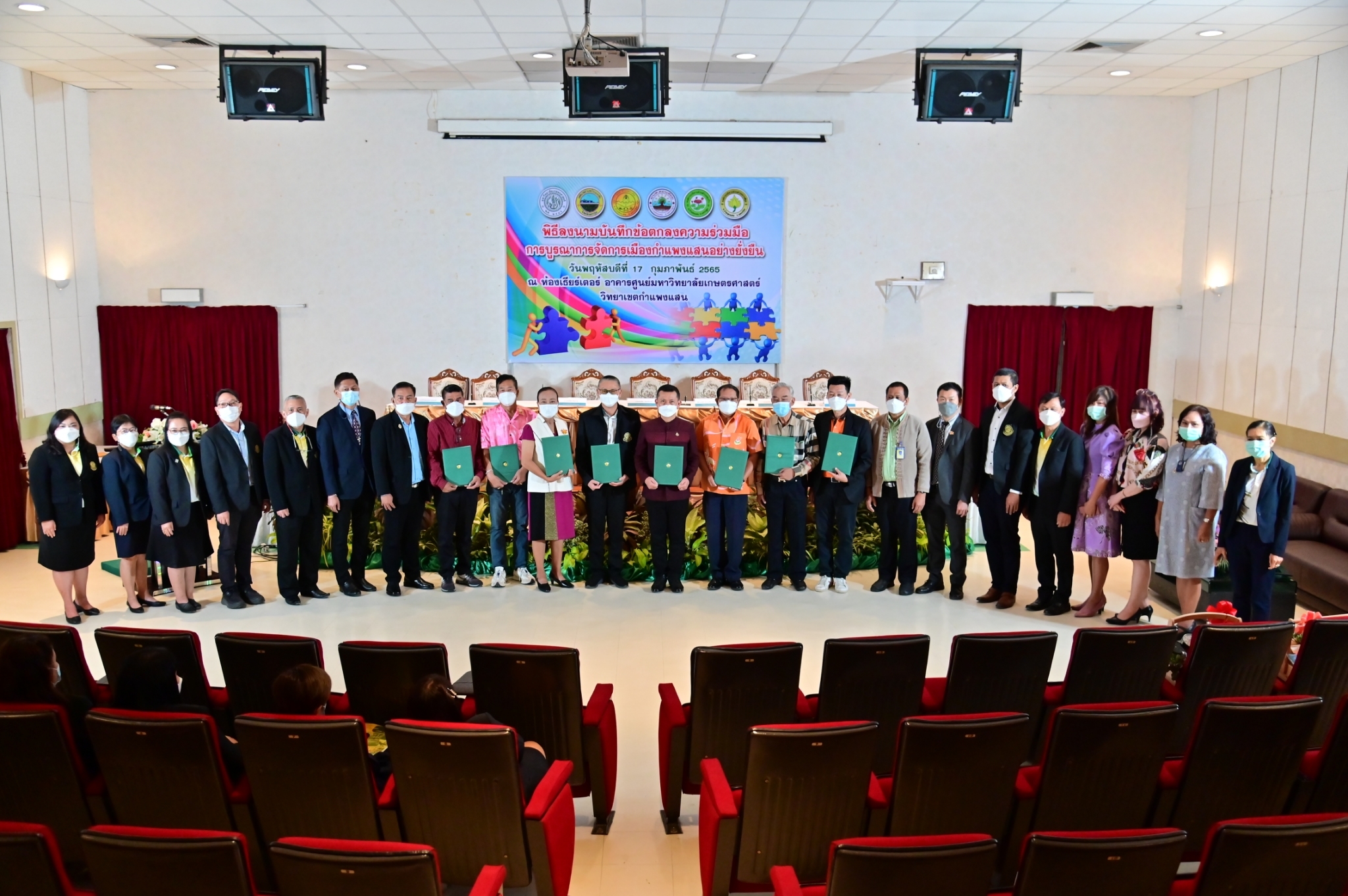 วันที่ 17 กุมภาพันธ์ 2565 ที่ห้องประชุม ศูนย์มหาวิทยาลัยเกษตรศาสตร์ วิทยาเขตกำแพงแสน จังหวัดนครปฐม นายชยชัย แสงอินทร์ รองผู้ว่าราชการจังหวัดนครปฐม พร้อมด้วย รองศาสตราจารย์ นายสัตวแพทย์ ดร.อนุชัย ภิญโญภูมิมินทร์ รองอธิการบดีวิทยาเขตกำแพงแสน นายกเทศมนตรีตำบลกำแพงแสน และนายกองค์การบริหารส่วนตำบลในพื้นที่อำเภอกำแพงแสน ได้แก่ ตำบลกำแพงแสน ตำบลดอนข่อย ตำบลทุ่งบัว และตำบลรางพิกุล ร่วมลงนามบันทึกข้อตกลงความร่วมมือการบูรณาการจัดการเมืองกำแพงแสนอย่างยั่งยืน