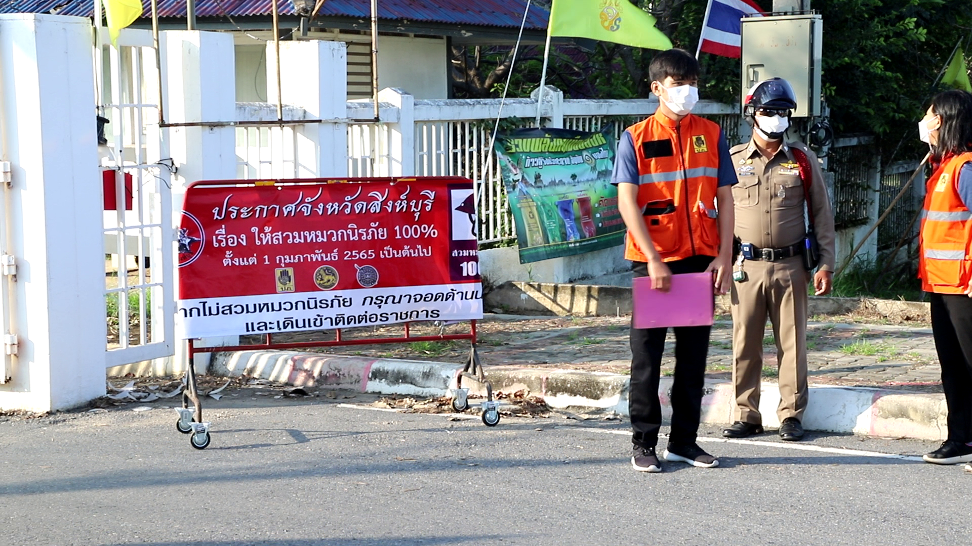 ตามที่จังหวัดสิงห์บุรีได้ประกาศให้มีการสวมหมวกนิรภัย 100 เปอร์เซ็นต์ เป็นวาระจังหวัด และหน่วยงานราชการต่างๆ แจ้งเจ้าหน้าที่ในสังกัด และให้ร่วมกันรณรงค์ประชาสัมพันธ์ให้ประชาชนได้ถือปฏิบัติอย่างเคร่งคัดตั้งแต่วันที่ 1 กุมภาพันธ์ 2565 ที่ผ่านมา ในส่วนของศูนย์ราชการ ศาลากลางจังหวัดสิงห์บุรี ในระยะแรกก็จะให้เจ้าหน้าที่ตำรวจ เจ้าหน้าที่ปกครองจังหวัดสิงห์บุรี เจ้าหน้าที่จากป้องกันและบรรเทาสาธารณภัย ออกมายืนดักบริเวณทางเข้าศูนย์ราชการศาลากลางจังหวัดสิงห์บุรี เพื่อที่จะตักเตือนข้าราชการ เจ้าหน้าที่หน่วยงานต่างๆ และประชาชนทั่วไปที่มาติดราชการ ที่ขับขี่รถจักรยานยนต์ที่ไม่สวมหมวกนิรภัย ที่จะเข้าไปบริเวณศูนย์ราชการ รวมถึงผู้ซ้อนด้วย ให้สวมหมวกนิรภัยทุกครั้งก่อน ในระยะสองหากยังพบมีผู้ขับขี่รถจักรยานยนต์ที่ไม่สวมหมวกนิรภัยประสงค์จะเข้าบริเวณศูนย์ราชการ ก็จะให้จอดรถจักรยานยนต์ไว้ที่ทางเข้าและให้เดินเข้าไปติดต่อราชการ และสุดท้ายก็จะใช้มาตรการทางกฎหมายเจอผู้ไม่สวมหมวกนิรภัยก็จะดำเนินการตามกฎหมาย จับและปรับทันที ซึ่งจากการปฏิบัติงานว่ากล่าวตักเตือนของเจ้าหน้าที่ ล่าสุด พบว่ายังมีประชาชนที่มาติดต่อราชการที่ไม่สวมหมวกนิรภัยอยู่บ้างเล็กน้อย ส่วนข้าราชการและเจ้าหน้าที่จะสวมหมวกนิรภัยกันทุกคน