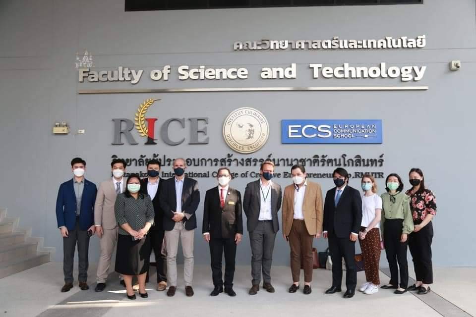รศ.ดร.อุดมวิทย์ ไชยสกุลเกียรติ รักษาราชการแทนอธิการบดี พร้อมด้วย ดร.สำเนียง องสุพันธ์กุล คณบดีคณะวิศวกรรมศาสตร์ และดร.ณัฐพงศ์ โชติกเสถียร ผู้อำนวยการวิทยาลัยผู้ประกอบการสร้างสรรค์นานาชาติรัตนโกสินทร์ ให้การต้อนรับคณะผู้ช่วยทูตและเจ้าหน้าที่ของสถานเอกอัครราชทูตฝรั่งเศส ประจำประเทศไทย ประกอบด้วย นายตีแยรี เบย์ล ผู้ช่วยทูตฝ่ายวัฒนธรรม และนายกีโยม ดา ผู้ช่วยทูตฝ่ายความร่วมมือด้านวิทยาศาสตร์และอุดมศึกษา ที่มาเยี่ยมชมสถานที่ และเข้าพบเพื่อหารือเพิ่มเติมเกี่ยวกับประเด็นความร่วมมือที่มหาวิทยาลัยมีกับสถานศึกษาและองค์กรภาคธุรกิจของฝรั่งเศส รวมถึงความร่วมมือด้านการศึกษา การวิจัย และวัฒนธรรม ที่จะมีความร่วมมือกันในอนาคตต่อไป