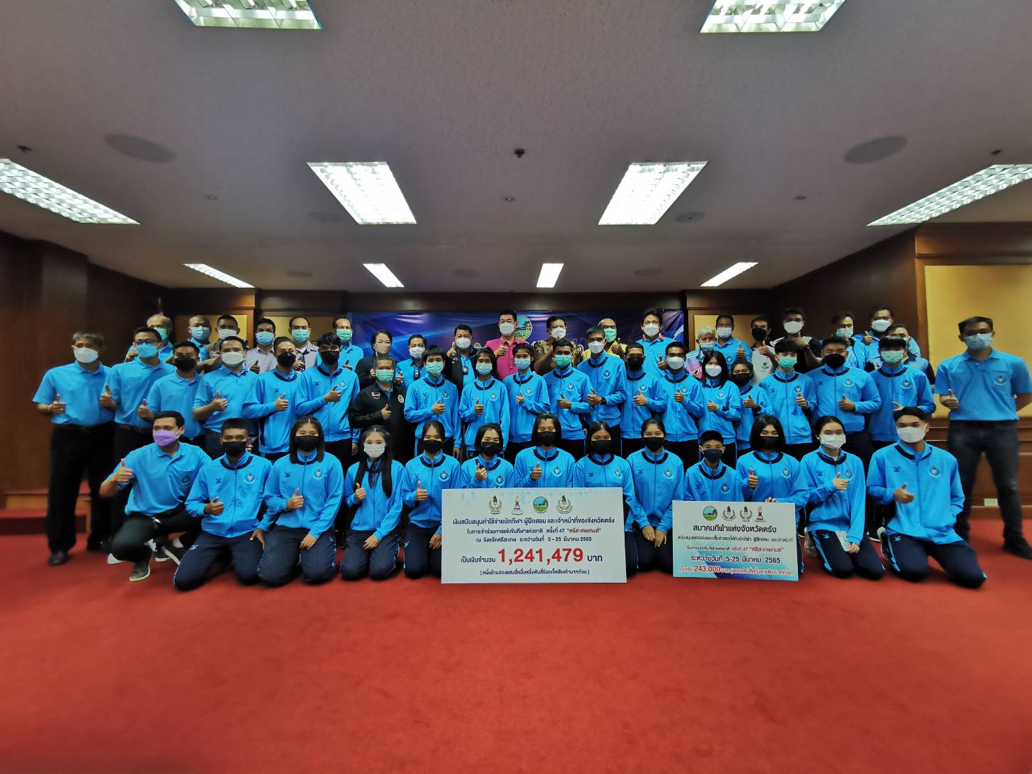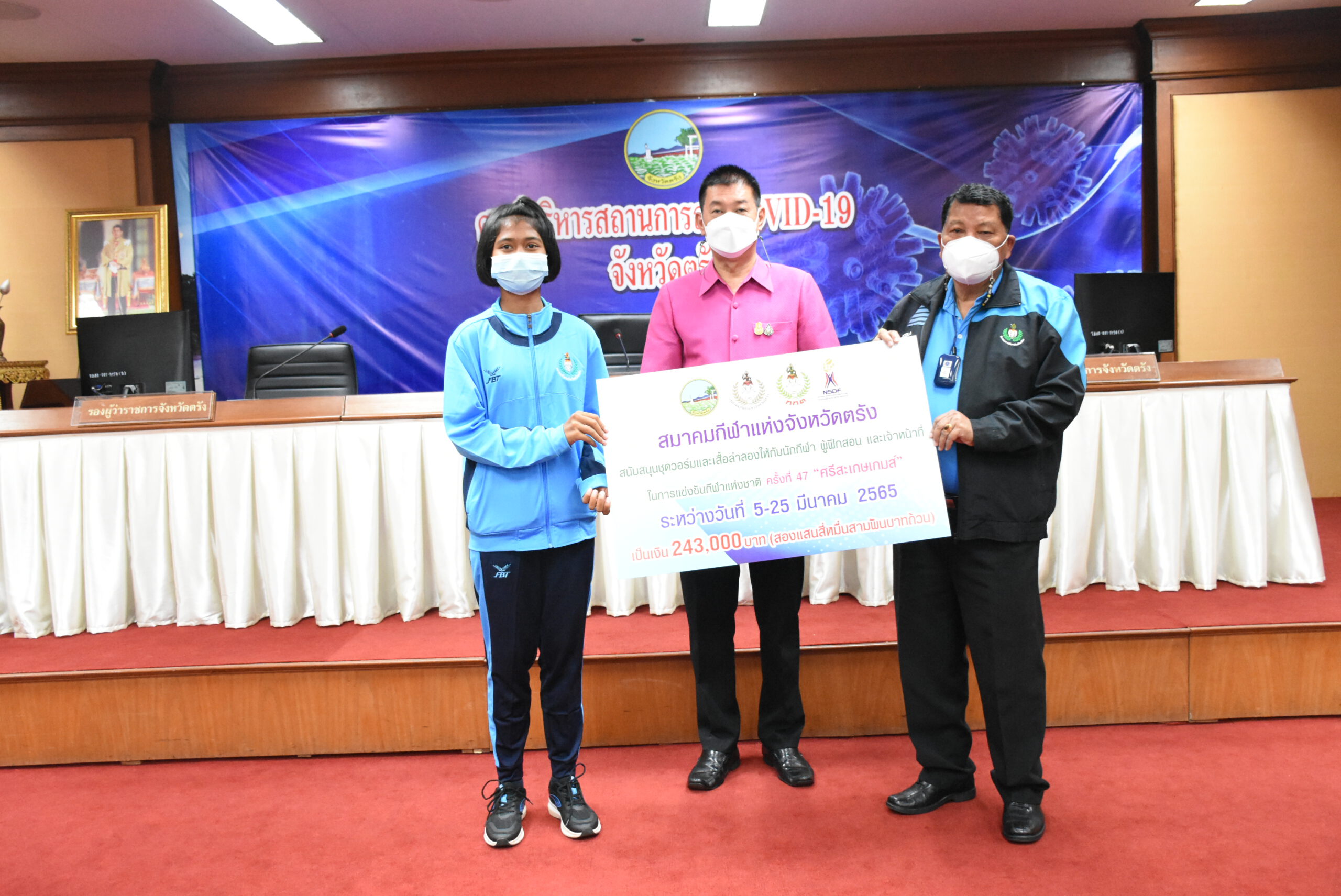วันนี้ (1 มี.ค.2565) ที่ห้องพระยารัษฎา ชั้น 5 ศาลากลางจังหวัดตรัง นายขจรศักดิ์ เจริญโสภา ผู้ว่าราชการจังหวัดตรัง เป็นประธานในพิธีมอบเงินค่าใช้จ่ายเป็นเงินทั้งสิ้น 1,241,479.-บาท (หนึ่งล้านสองแสนสี่หมื่นหนึ่งพันสี่ร้อยเจ็ดสิบเก้าบาทถ้วน) และกล่าวให้โอวาทนักกีฬา ผู้ฝึกสอน ในการเข้าร่วมการแข่งขันกีฬาแห่งชาติ ครั้งที่ 47 “ศรีสะเกษเกมส์” ณ จังหวัดศรีสะเกษ ระหว่างวันที่ 5-25 มีนาคม 2565