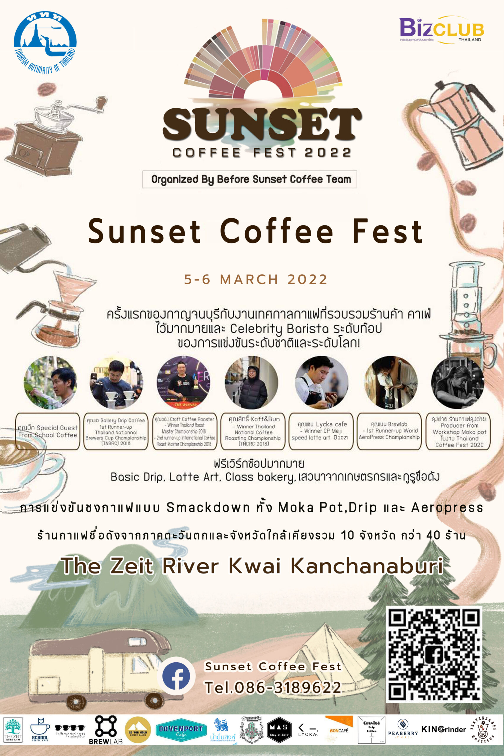 วันที่ 3 มีนาคม 2565 นางสาวสรียา บุญมาก ผู้อำนวยการการท่องเที่ยวแห่งประเทศไทย (ททท.) สำนักงานกาญจนบุรี เปิดเผยกับผู้สื่อข่าวว่า ในเดือนมีนาคมนี้ ททท. สำนักงานกาญจนบุรี จัดกิจกรรมกระตุ้นการเดินทางท่องเที่ยวเข้าสู่จังหวัดกาญจนบุรี จำนวน 3 กิจกรรม โดย 1 ในนั้น คือ ร่วมกับกลุ่มบิสคลับ และเดอะไซท์ริเวอร์แควกาญจนบุรี (The Zeit River Kwai Kanchanaburi) จัดงาน Sunset Coffee Fest 2022 (เทศกาลกาแฟแห่งภาคตะวันตก) ขึ้นในวันที่ 5 – 6 มีนาคม 2565 ระหว่างเวลา 09.00 – 18.30 น. ณ The Zeit River Kwai Kanchanaburi อำเภอเมือง จังหวัดกาญจนบุรี โดยมีวัตถุประสงค์เพื่อส่งเสริมการท่องเที่ยวของจังหวัดกาญจนบุรีให้เป็นเมืองแห่งกาแฟและสร้างความเข้มแข็งแก่เครือข่ายพันธมิตรผู้ประกอบการธุรกิจกาแฟภาคตะวันตก