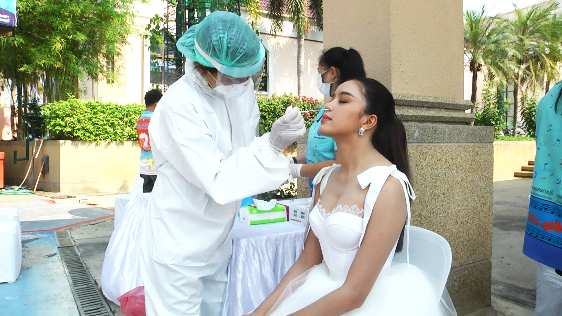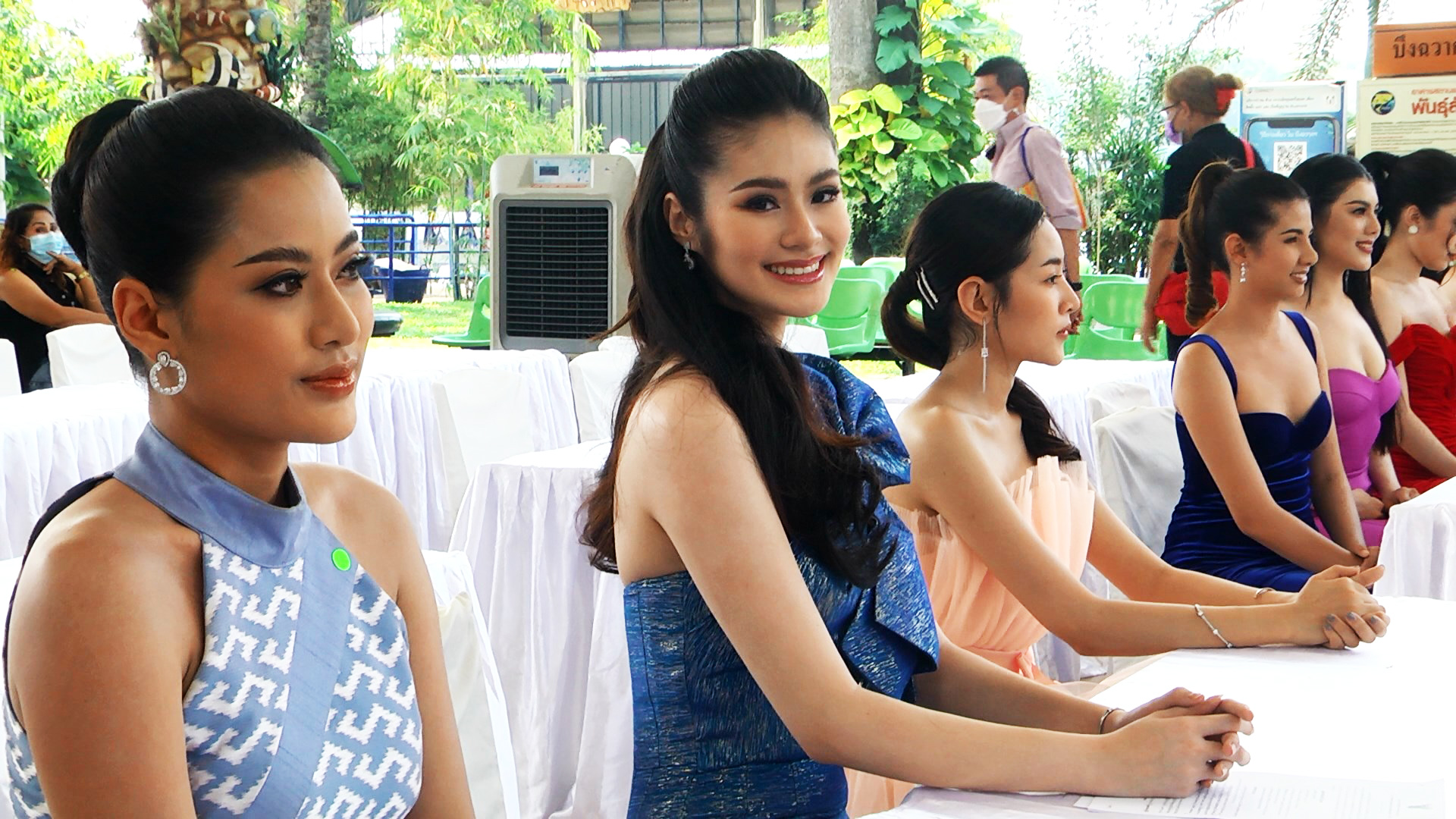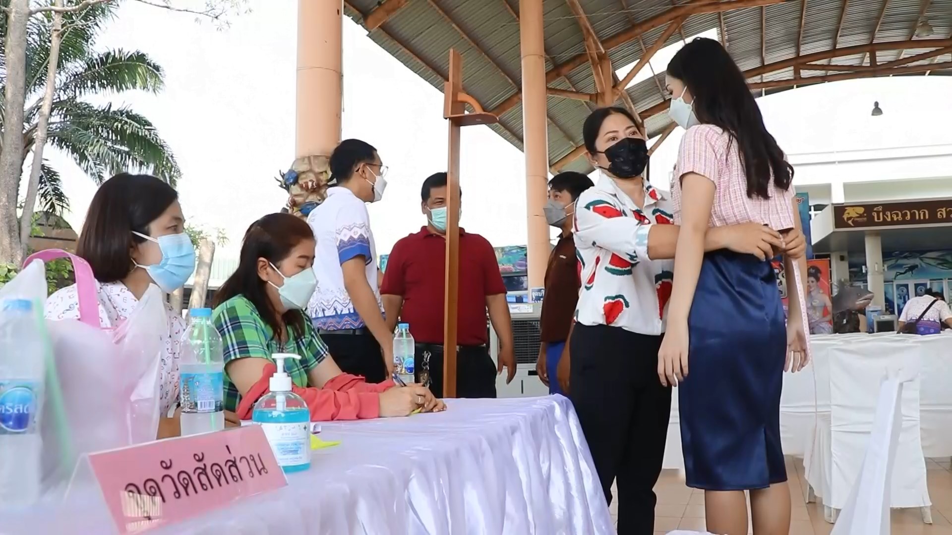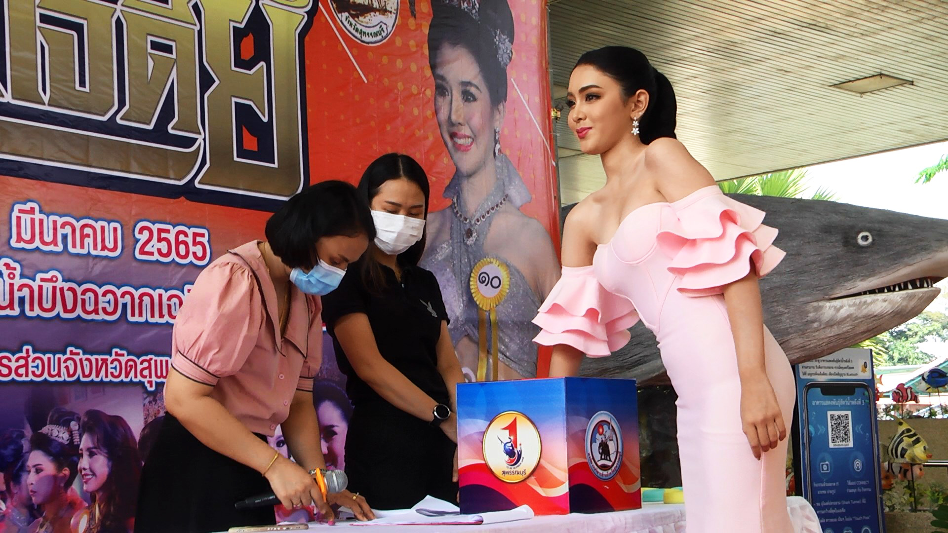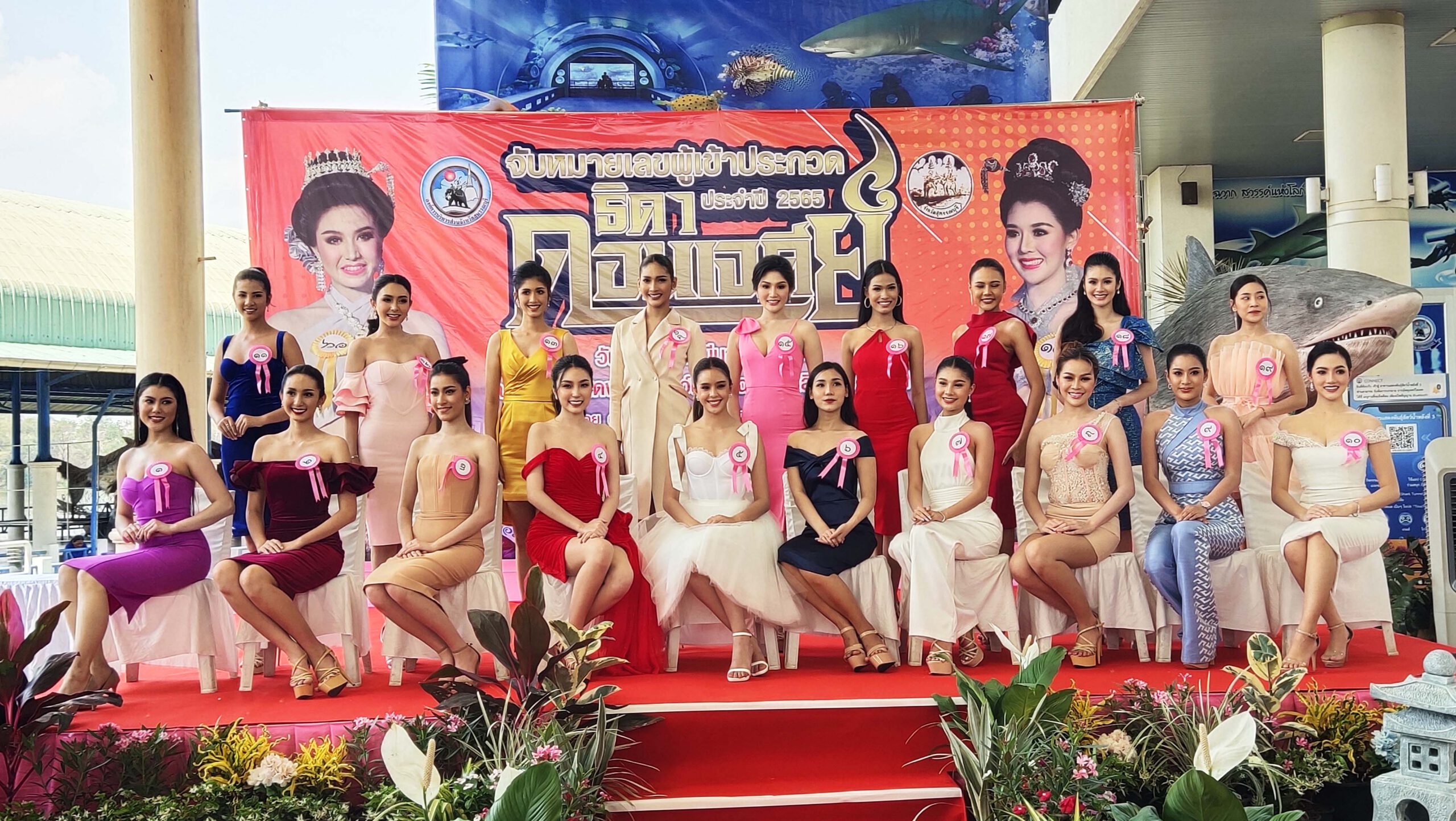 บรรยากาศการจับหมายเลขผู้เข้าประกวดธิดาดอนเจดีย์ ประจำปี 2565 ที่บริเวณสถานแสดงพันธุ์สัตว์น้ำบึงฉวากเฉลิมพระเกียรติฯ อ.เดิมบางนางบวช จ.สุพรรณบุรี ได้สาวงามจากทั่วประเทศเดินทางมาสมัครเข้าประกวดธิดาดอนเจดีย์ และจับหมายเลขประจำตัวกันอย่างคึกคัก ซึ่งสาวงามที่เดินทางมาเข้าร่วมประกวดและผู้ติดตาม รวมทั้งเจ้าหน้าที่ ผู้ร่วมกิจกรรมจะต้องผ่านการตรวจ ATK ก่อนเข้าภายในบริเวณงานกันทุกคนภายใต้มาตรการป้องกันการแพร่ระบาดของเชื้อโควิด 19 อย่างเคร่งครัด