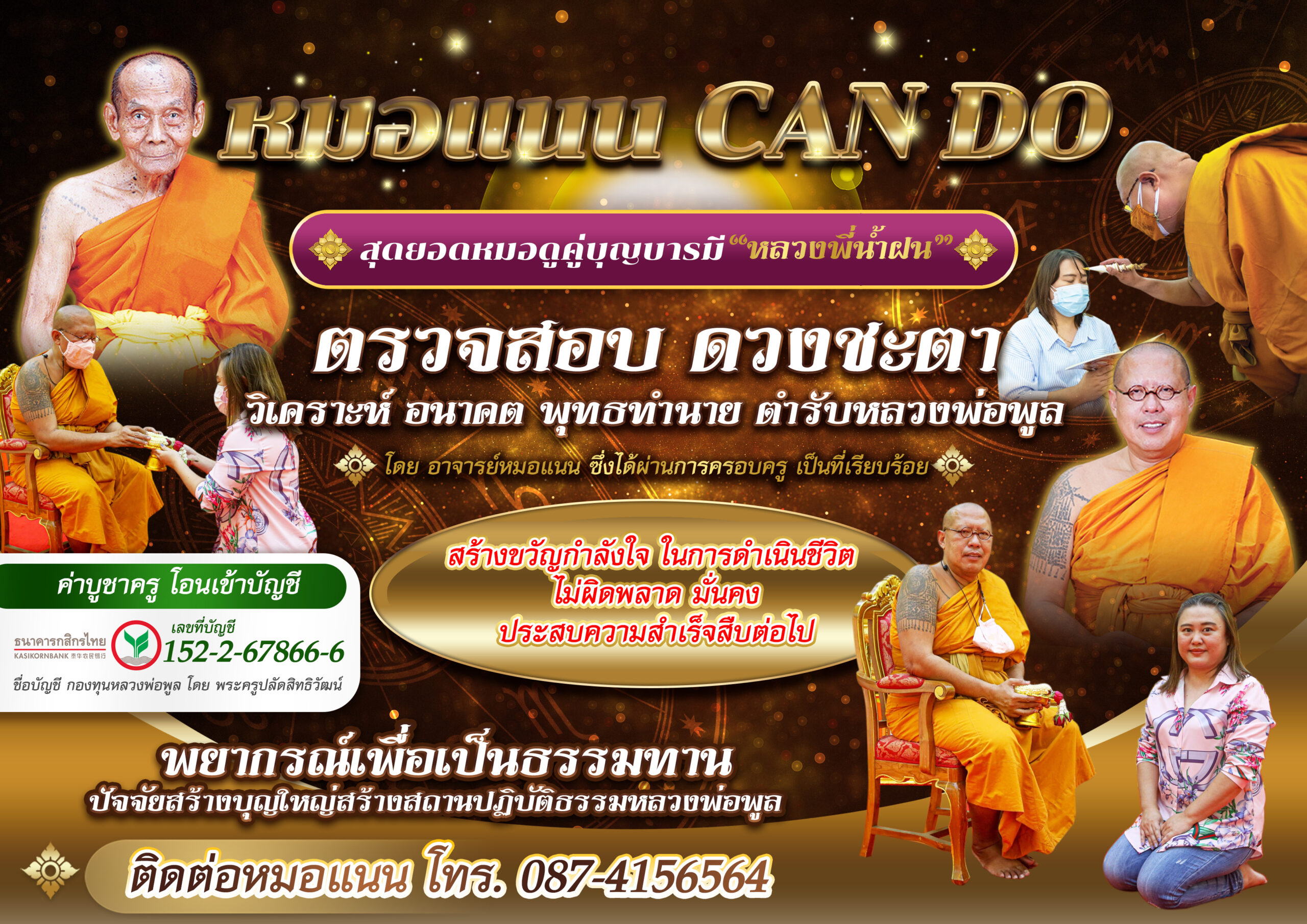 นั่นคือ อาจารย์หมอแนน CAN DO ผู้ที่อาตมาเรียกได้ว่าเป็นศิษย์หลวงพี่น้ำฝน ทายาทศิษย์เอกหลวงพ่อพูล วัดไผ่ล้อม จ.นครปฐม เป็นนักโหราศาสตร์ผู้หนึ่งซึ่งได้รับการอบรมสั่งสอน และรับการครอบครูอย่างถูกต้องแล้วตามประเพณี อีกทั้งมีคุณสมบัติแห่งความเป็นหมอดูที่ดีอย่างครบถ้วน