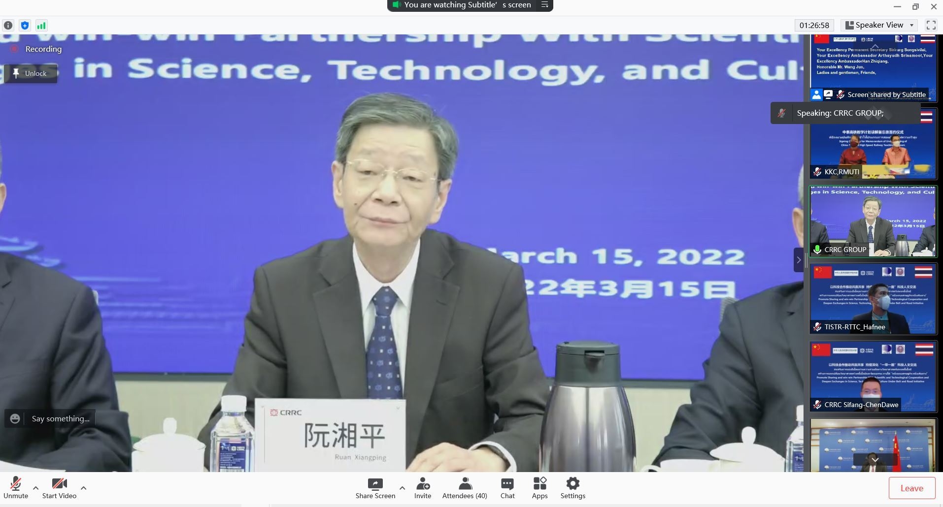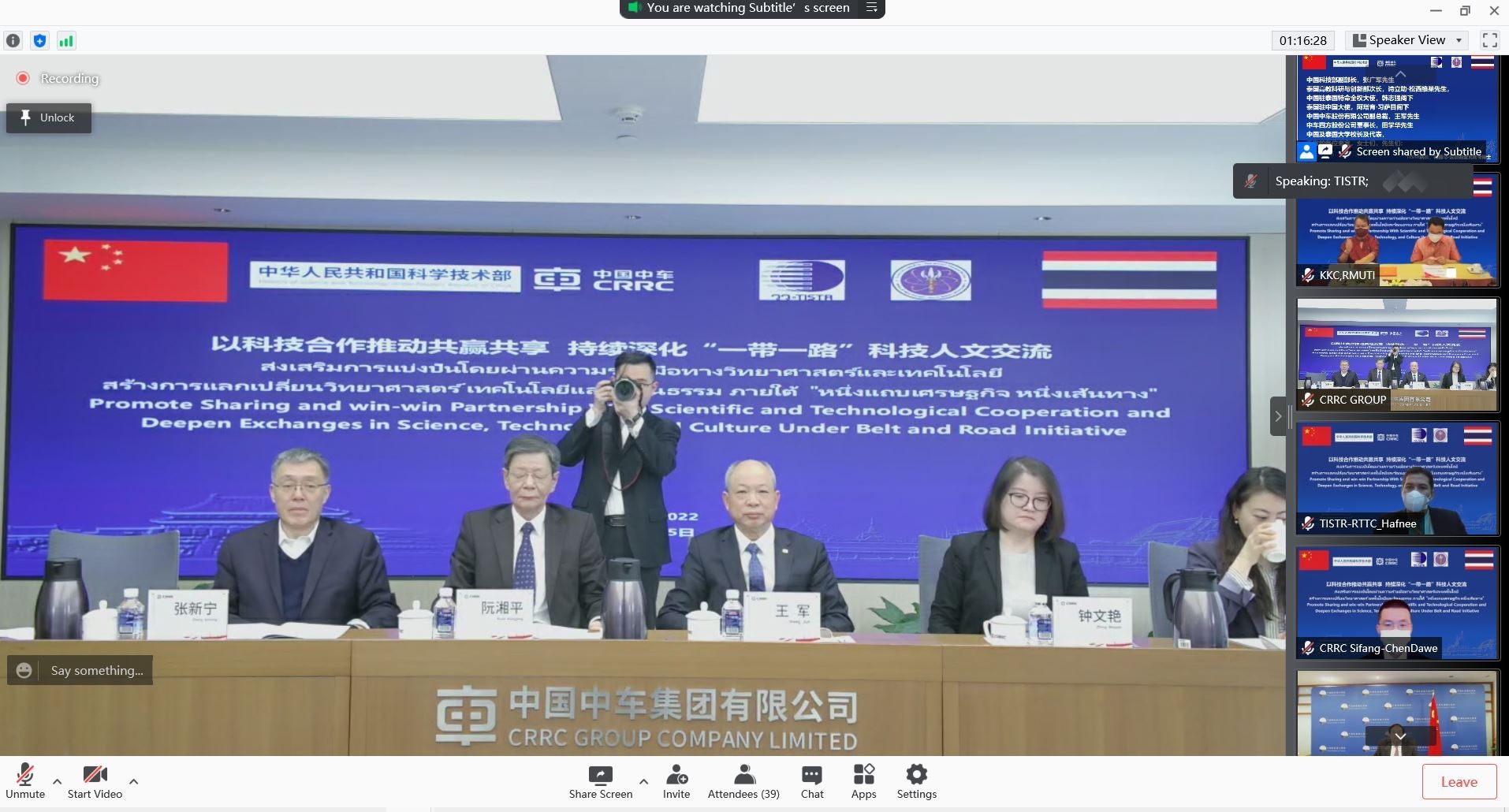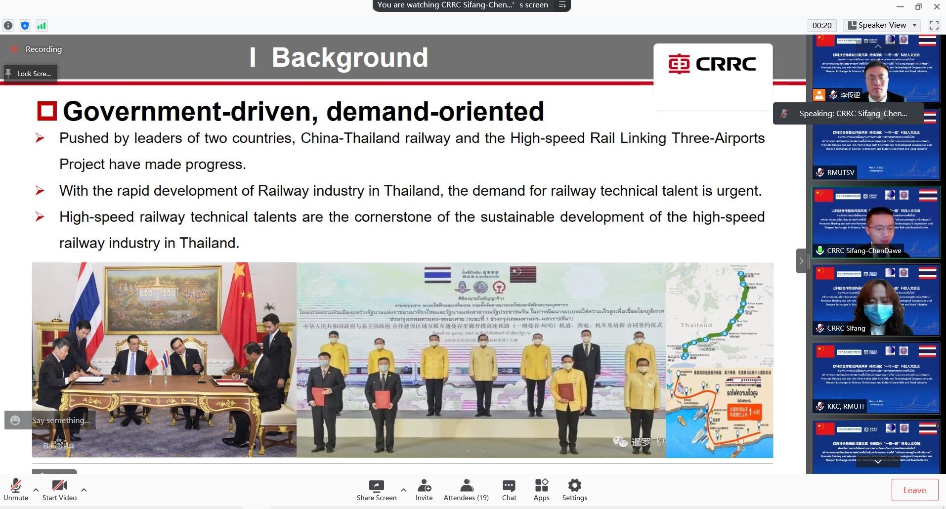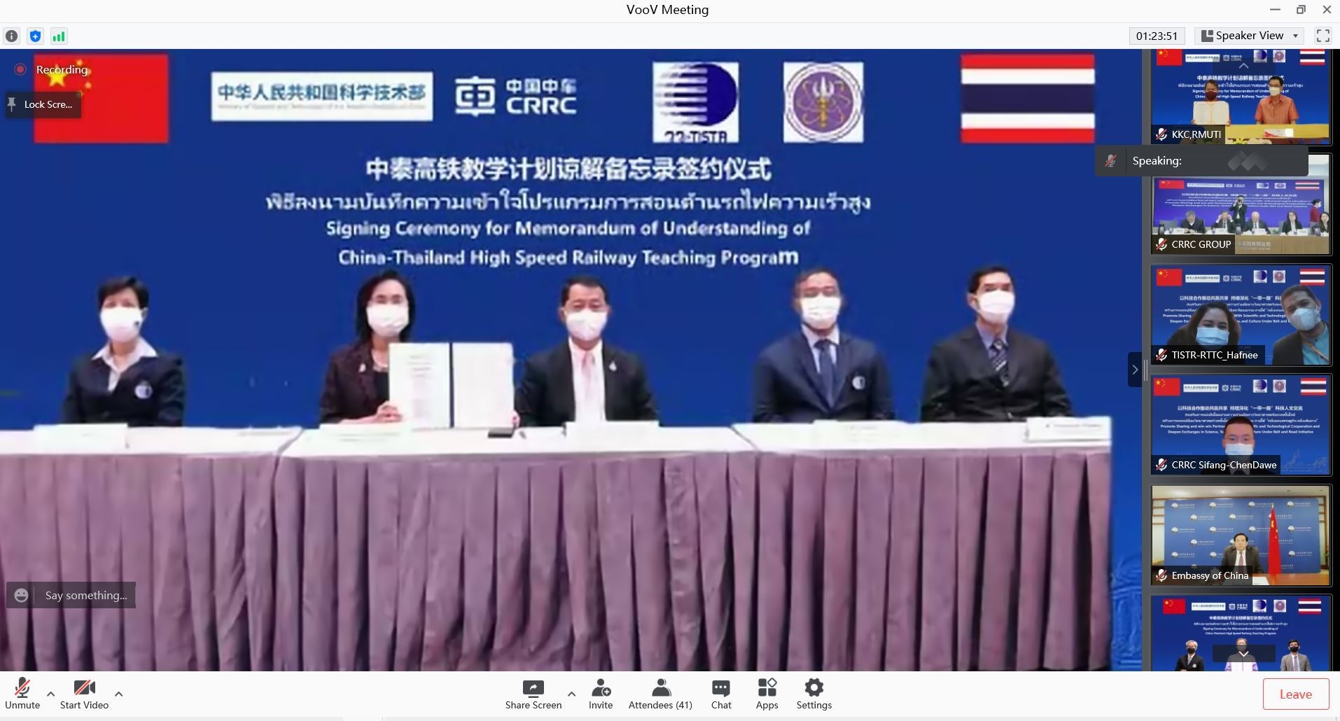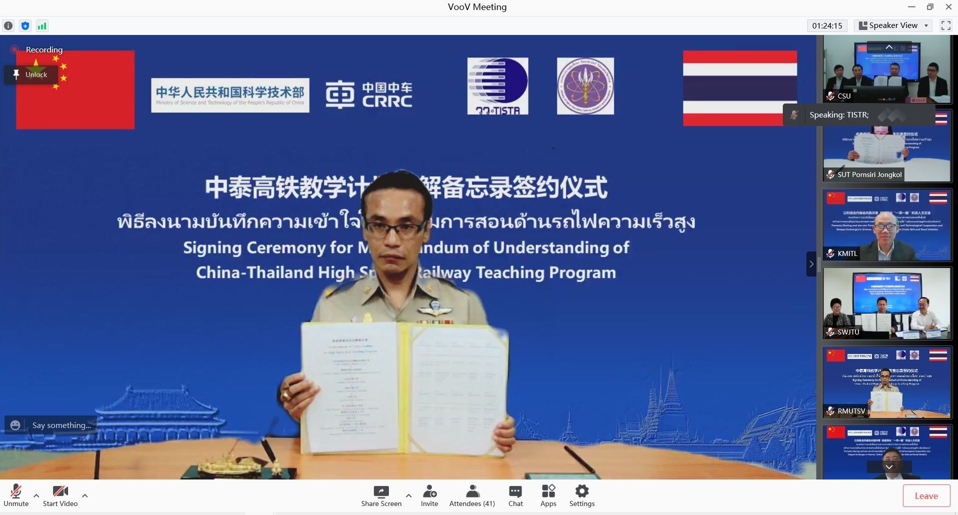 พิธีลงนามบันทึกความเข้าใจโปรแกรมการสอนด้านรถไฟความเร็วสูง จัดขึ้นภายใต้การกำกับดูแลระหว่างประเทศไทย โดยกระทรวงการอุดมศึกษา วิทยาศาสตร์ วิจัยและนวัตกรรม และสถาบันวิจัยวิทยาศาสตร์และเทคโนโลยีแห่งประเทศไทย กับประเทศจีน โดย กระทรวงวิทยาศาสตร์และเทคโนโลยีสาธารณรัฐประชาชนจีน ซึ่งเป็นการลงนามบันทึกความเข้าใจด้านการสอนรถไฟความเร็วสูงร่วมกับ 8 มหาวิทยาลัยทั้งประเทศไทยและประเทศจีน ดังนี้ มหาวิทยาลัยเทคโนโลยีราชมงคลศรีวิชัย , มหาวิทยาลัยเทคโนโลยีราชมงคลอีสาน วิทยาเขตขอนแก่น , สถาบันเทคโนโลยีพระจอมเกล้าเจ้าคุณทหารลาดกระบัง , มหาวิทยาลัยเทคโนโลยีสุรนารี , มหาวิทยาลัยเชียงใหม่ , Beijing Jiaotong University , Central South University , Southwest Jiaotong University