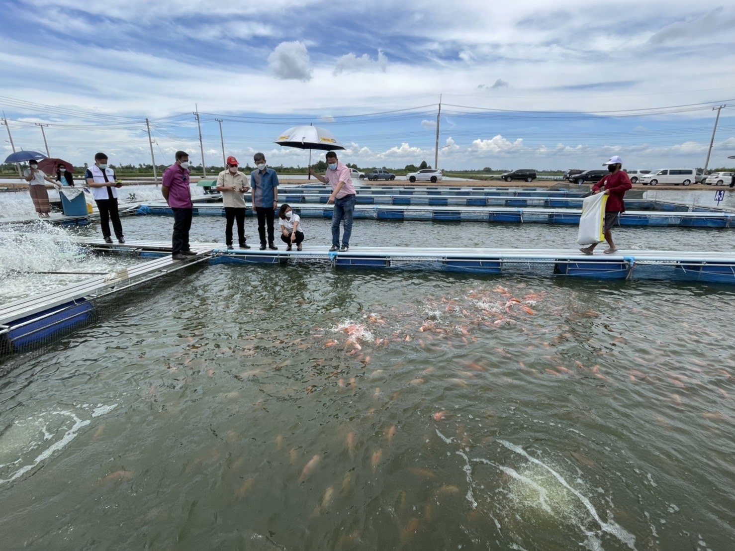 จากนั้น ผู้ว่าราชการจังหวัดนครปฐม และคณะ ตรวจเยี่ยมเครือข่ายศูนย์อำนวยการขจัดความยากจนและพัฒนาคนทุกช่วงวัยอย่างยั่งยืน ตามหลักปรัชญาของเศษฐกิจพอเพียง ด้านประมง ณ บริษัท ธนันชัยฟาร์ม จำกัด ตำบลแหลมบัว อำเภอนครชัยศรี ซึ่งจำหน่ายปลานิลสด ปลาทับทิมสด และกุ้งขาวทุกขนาด ทั้งปลีกและส่ง โดยนายธนันชัย เอกเผ่าพันธุ์ ได้รับการคัดเลือกเป็นเกษตรกรดีเด่นระดับจังหวัด ประจำปี 2564 สาขาอาชีพเพาะเลี้ยงสัตว์น้ำจืด อีกทั้งยังได้รับรองมาตรฐาน GAP ผ่านการพิจารณาได้รับเครื่องหมายรับรองระดับคุณภาพชั้น 1 สินค้าคุณภาพมาตรฐานดีเยี่ยม (ตะเพียนทอง) จากกองพัฒนาระบบการรับรองมาตรฐานสินค้าประมง และหลักฐานเพื่อการสืบค้น เป็นปลากระชังแท้ๆ ไม่เหม็นคาว ไม่มีกลิ่นโคลนอีกด้วย