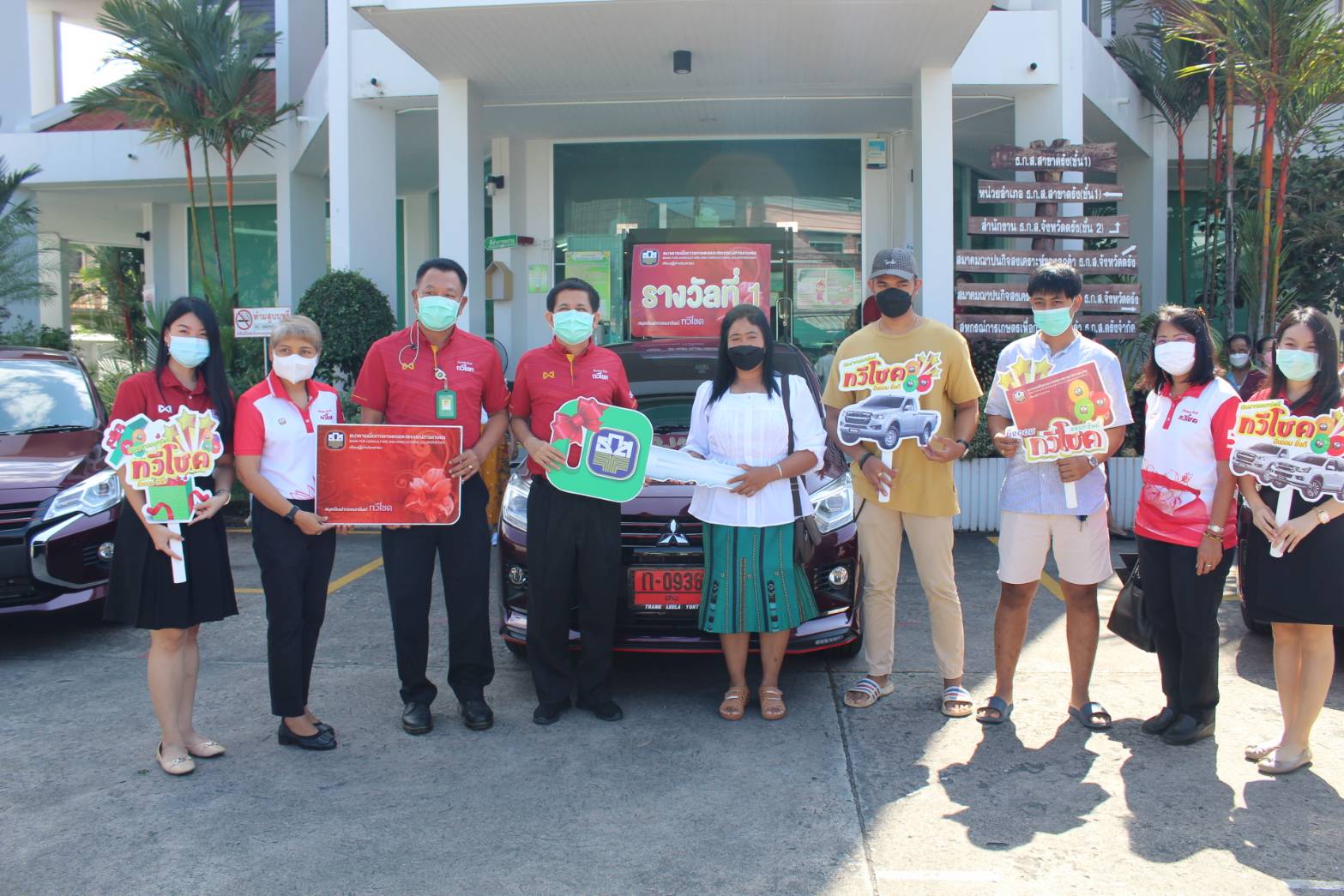 เมื่อเวลา 10.00 น. วันที่ 24 มี.ค.65 ณ บริเวณลานจอดรถหน้าที่ทำการ ธ.ก.ส.สาขาตรัง ต.ทับเที่ยง อ.เมืองตรัง จ.ตรัง นายชาญยุทธ กาญจนพรหม ผู้อำนวยการสำนักงาน ธ.ก.ส.จังหวัดตรัง พร้อมด้วยคณะผู้บริหาร ธ.ก.ส.ในพื้นที่จังหวัดตรัง ร่วมจัดพิธีมอบรถยนต์เก๋ง ยี่ห้อ Mitsubishi Attrage รุ่น 1.2 SMART CVT จำนวน 5 คัน มูลค่า 2,650,000 บาท ให้กับผู้โชคดี จากการจับรางวัลเงินฝากออมทรัพย์ทวีโชค ครั้งที่ 2 ประจำปีบัญชี 2564 เมื่อวันที่ 5 ก.พ.65 ที่ผ่านมา โดยมีผู้โชคดีได้รับรางวัลที่ 1 จำนวน 5 ท่าน ประกอบด้วย ผู้โชคดีคนที่ 1 นางเบ็ญจวรรณ สุระกุล ลูกค้า ธ.ก.ส.สาขาตรัง ผู้โชคดีคนที่ 2 นางขวัญตา ไทรงาม ลูกค้า ธ.ก.ส.สาขาห้วยยอด ผู้โชคดีคนที่ 3 นางเครือวัลย์ บุญยง ลูกค้า ธ.ก.ส.สาขาทุ่งยาว ผู้โชคดีคนที่ 4 น.ส.ศิริวรรณ ล่องตี้ ลูกค้า ธ.ก.ส.สาขาสิเกา และผู้โชคดีคนที่ 5 นางอรอุมา ช่วยสง ลูกค้า ธ.ก.ส.สาขานาโยง