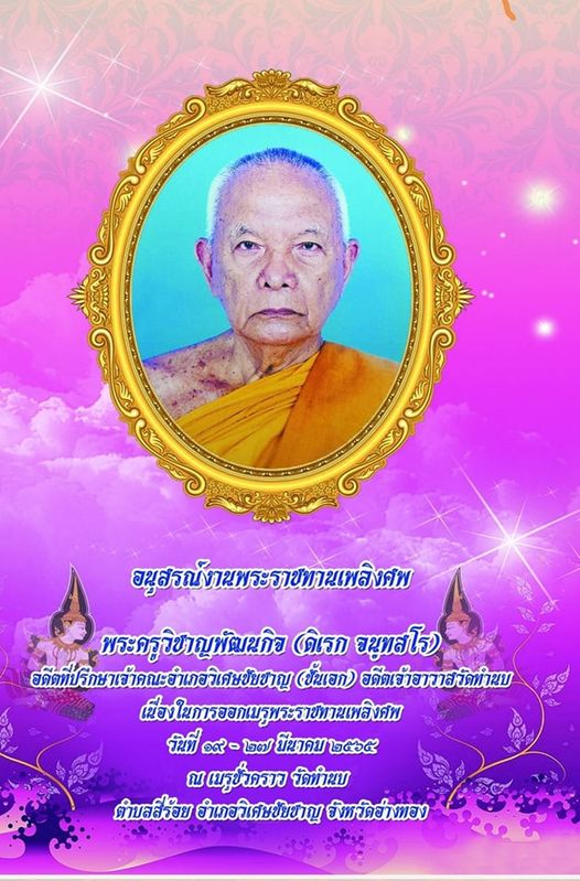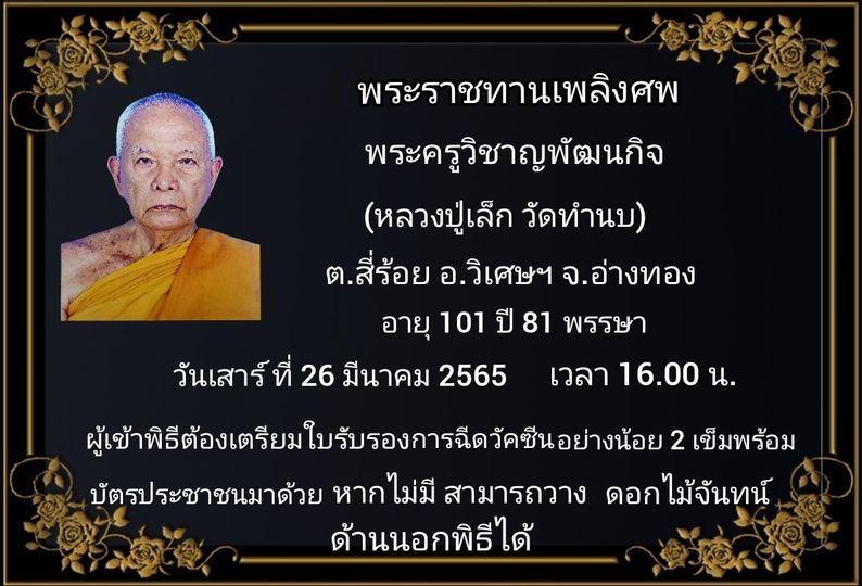 หมายเหตุ ผู้ที่จะเข้าร่วมในพิธีฯ บริเวณลานสนามภายในโดมพิธี ต้องคัดกรอง แสดงใบรับรองการฉีดวัคซีนอย่างน้อย 2 เข็มและแสดงบัตรประชาชน หรือแสดงแอพพลิเคชั่น หมอพร้อม ตามมาตรการอย่างเคร่งครัด ส่วนท่านใดที่ไม่มีใบรับรองผลการฉีดวัคซีนมายืนยัน ทางวัดจะจัดให้วางดอกไม้จันทน์บริเวณด้านหน้าข้างลานสนามพิธี ด้านหน้าหลวงพ่อวัดกุฏิ ให้