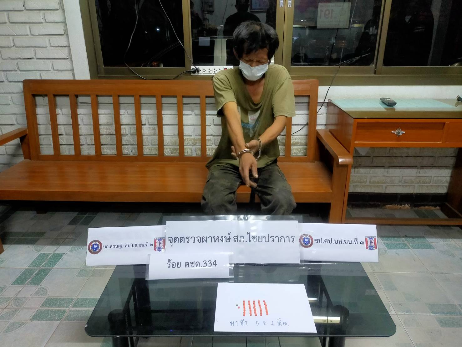 นายสมคิด อายุ 46 ปี หมู่ 6 ต.แม่ทะลบ อ.ไชยปราการ จ.เชียงใหม่ พร้อมด้วยของกลาง ยาบ้าสีส้มลักษณะเม็ดกลมแบน ด้านหนี่งมีอักษร WY ประทับอยู่เป็นร่องลึก จำนวน 51 เม็ด ยาบ้าสีเขียวจำนวน 1 เม็ด บรรจุรวมกันในถุงพลาสติกสีดำ นับรวมกันได้ทั้งหมด 52 เม็ด ตำรวจได้รับแจ้งว่ามีผู้ต้องสงสัยว่าจะเกี่ยวข้องกับยาเสพติด จะขึ้นไปซื้อยาบ้าที่บ้านมูเซอห้วยทราย หมู่ที่ 4 ต.แม่ทะลบ อ.ไชยปราการ จ.เชียงใหม่ มาแบ่งจำหน่ายต่อให้กับผู้เสพในตัวอำเภอ จึงรายงานผู้บังตับบัญชาทราบ และได้รับคำสั่งให้ร่วมกันออกทำการตรวจสอบ เมื่อเดินทางถึงบนถนนระหว่างทางบ้านมูเซอโป่งจ๊อก – บ้านมูเซอห้วยทราย หมู่ที่ 4 ต.แม่ทะลบ อ.ไชยปราการ จ.เชียงใหม่ พบชายคนหนึ่ง ขับขี่รถจักรยานยนต์ยี่ห้อ ฮอนด้า สีดำ หมายเลขทะเบียน จธพ 647 เชียงใหม่ มาตามถนนทางบ้านมูเซอห้วยทราย ท่าทางมีพิรุธ ตรงกับที่สายลับแจ้งมา เจ้าหน้าที่จึงแสดงตัวเป็นเจ้าพนักงานตำรวจ และส่งสัญญาณให้รถจักรยานยนต์คันดังกล่าวจอดเพื่อขอทำการตรวจค้น พบ นายสมคิด อายุ 46 ปี หมู่ 6 ต.แม่ทะลบ อ.ไชยปราการ จ.เชียงใหม่ เป็นผู้ขับขี่ (ทราบชื่อภายหลังตรวจค้น) มีท่าทางกระสับกระส่าย ลุกลี้รุกรน เจ้าหน้าที่ตำรวจ จึง ขออนุญาตทำการตรวจค้นตัวและสิ่งของที่ติดตัวมา โดยก่อนทำการตรวจค้นเจ้าหน้าที่ทุกนายได้แสดงความบริสุทธิ์ใจให้นายสมคิดฯ ดูจนเป็นที่พอใจแล้ว จึงทำการตรวจค้น ผลการตรวจค้นพบ ยาบ้าจำนวน 52 เม็ด บรรจุรวมกันในถุงพลาสติกสีดำ ซุกซ่อนอยู่ในถุงยาเส้นใส่ถุงพลาสติกอีกชั้นหนึ่ง แขวนไว้ที่แฮนด์ซ้ายของรถจักรยานยนต์ยี่ห้อฮอนด้า คันหมายเลขทะเบียน จธพ 647 เชียงใหม่ ที่นายสมคิดฯ ขับขี่มา สอบถามนายสมคิดฯ เกี่ยวกับยาบ้าจำนวนดังกล่าว รับว่าเป็นของตนเองดังกล่าวข้างต้น ในเวลาต่อมาเจ้าหน้าที่ได้นำตัว นายสมคิดฯ เดินทางไปยังโรงพยาบาลไชยปราการ อ.ไชยปราการ จว.เชียงใหม่ เพื่อให้แพทย์ตรวจหาสารเสพติดในร่างกายของนายสมคิดฯ ผลการตรวจตัวอย่างปัสสาวะของนายสมคิดฯ พบสารเสพติดเมทแอมเฟตามีนในตัวอย่างปัสสาวะของนายสมคิดฯ เจ้าหน้าที่ตำรวจ จึงนำตัวนายสมคิด ฯ เดินทางกลับมายังที่จุดตรวจผาหงษ์ ได้ทำบันทึกการจับกุมและนำตัวนายสมคิดฯ ส่งพนักงานสอบสวน สภ.ไชยปราการ เพื่อดำเนินคดีต่อไป