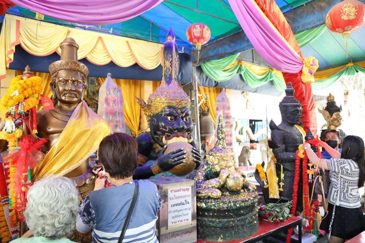 *********** บรรยากาศเป็นไปด้วยความเข้มขลัง พระครูยติธรรมานุยุต หรือหลวงพ่อแป๊ะ ได้นำพระสงฆ์สวดนพเคราะห์บูชาพระราหู โดยมีการผูกโยงสายสิณจน์ไว้บนศีรษะเพื่อความเป็นศิริมงคล ใช้เวลานานกว่า 2 ชั่วโมงจึงเสร็จสิ้น ทั้งนี้สำหรับสิ่งของเซ่นไหว้บุชานั้น ทางวัดได้มีการจัดเตรียมเครื่องไหว้เอาไว้ให้เป็นชุดๆในแต่ละชุดก็จะมีของดำ 8 อย่าง เช่น แบรนด์ซุบไก่ เหล้าดำ กาแฟดำ เฉาก๊วย ถั่วดำ ข้าวเหนียวดำ ขนมเปียกปูน ไข่เยี่ยวม้า ธูปดำ 8 ดอก รวมถึงดอกกุหลาบสีดำ แผ่นทองคำเปลว บายศรีชามคู่ ธูปดำ
