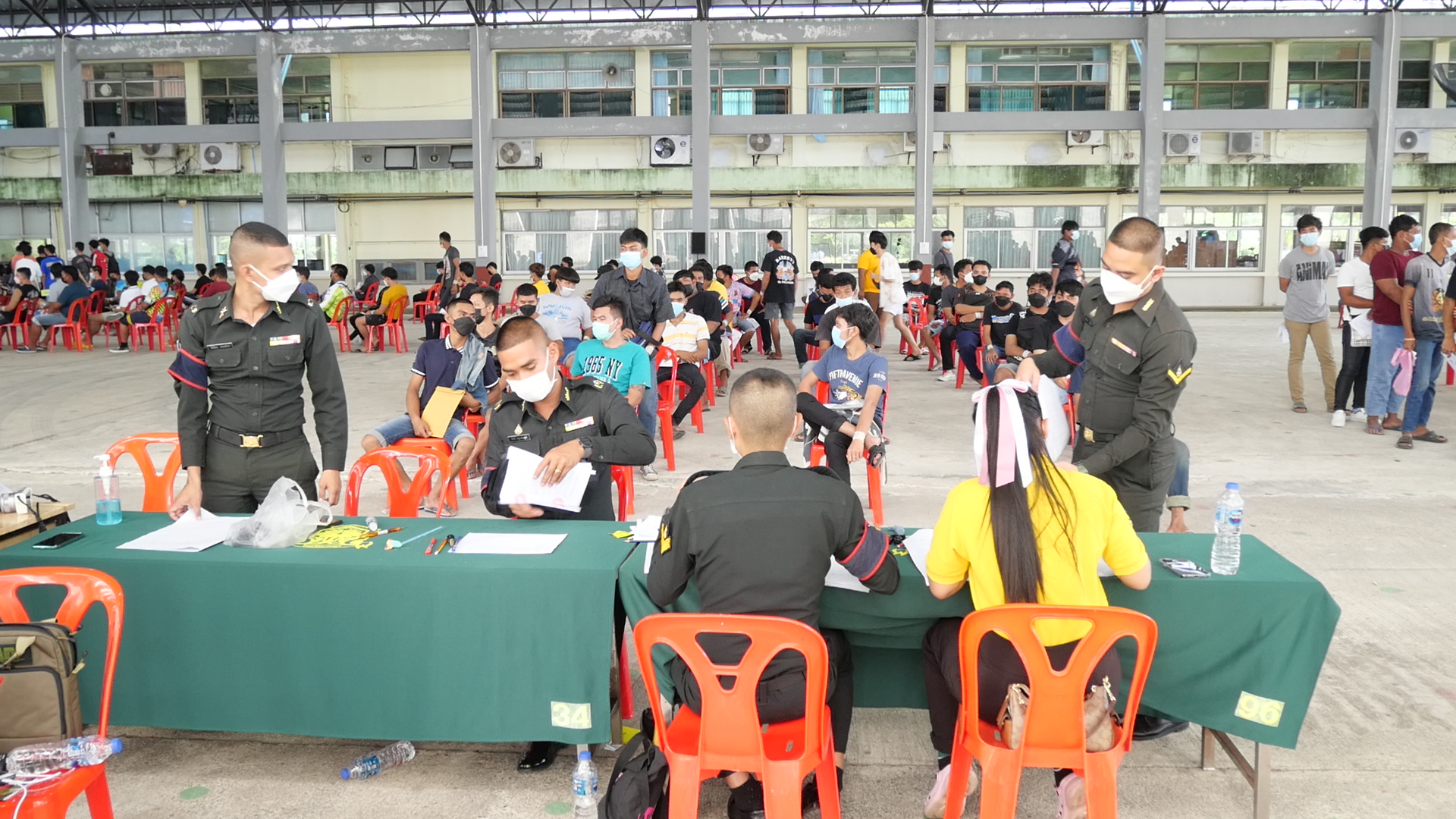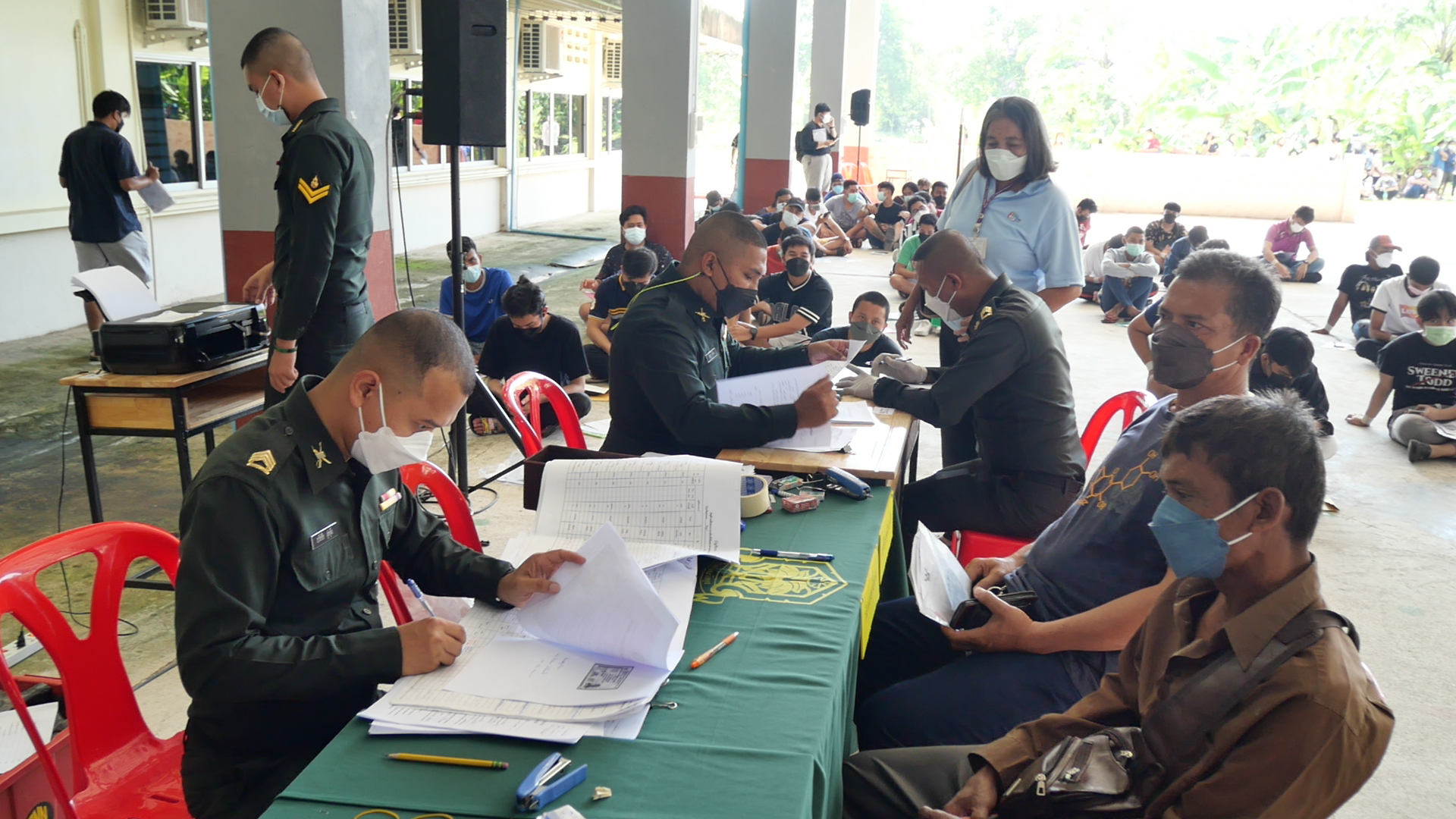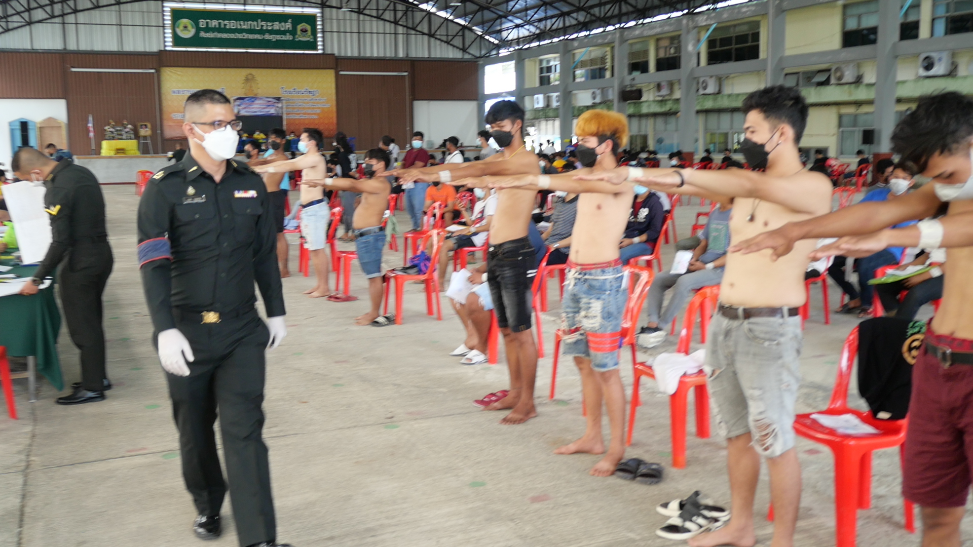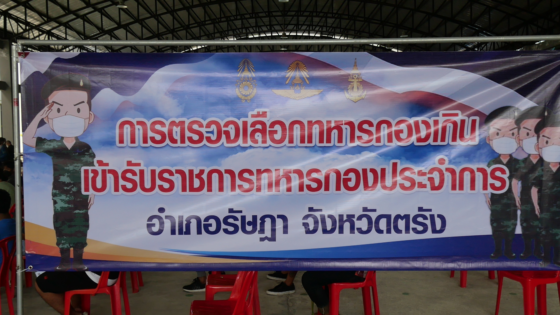 การตรวจเลือกทหารกองเกินเข้าเป็นทหารกองประจำการในวันแรกที่จังหวัดตรัง ในขณะที่ผู้บัญชาการมณฑลทหารบกที่ 43 ค่ายเทพสตรีศรีสุนทร เชิญชวนให้ชายไทยสมัครรับการทหาร เนื่องจากหลายคนอาจจะประสบปัญหาการแพร่ระบาดของโควิด -19 อาจทำให้เกิดการว่างงานขาดแคลนรายได้
