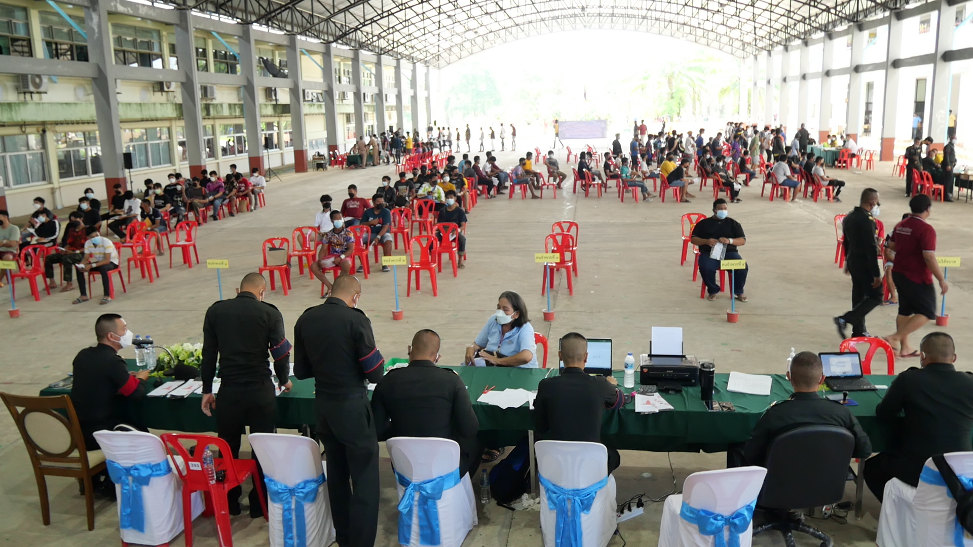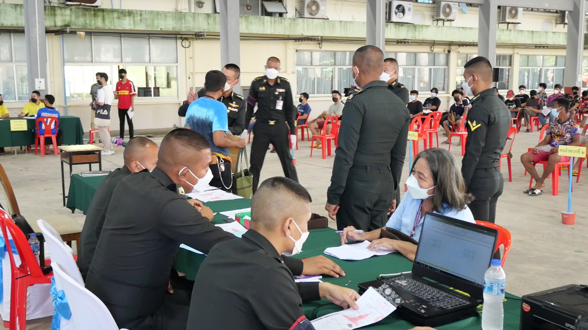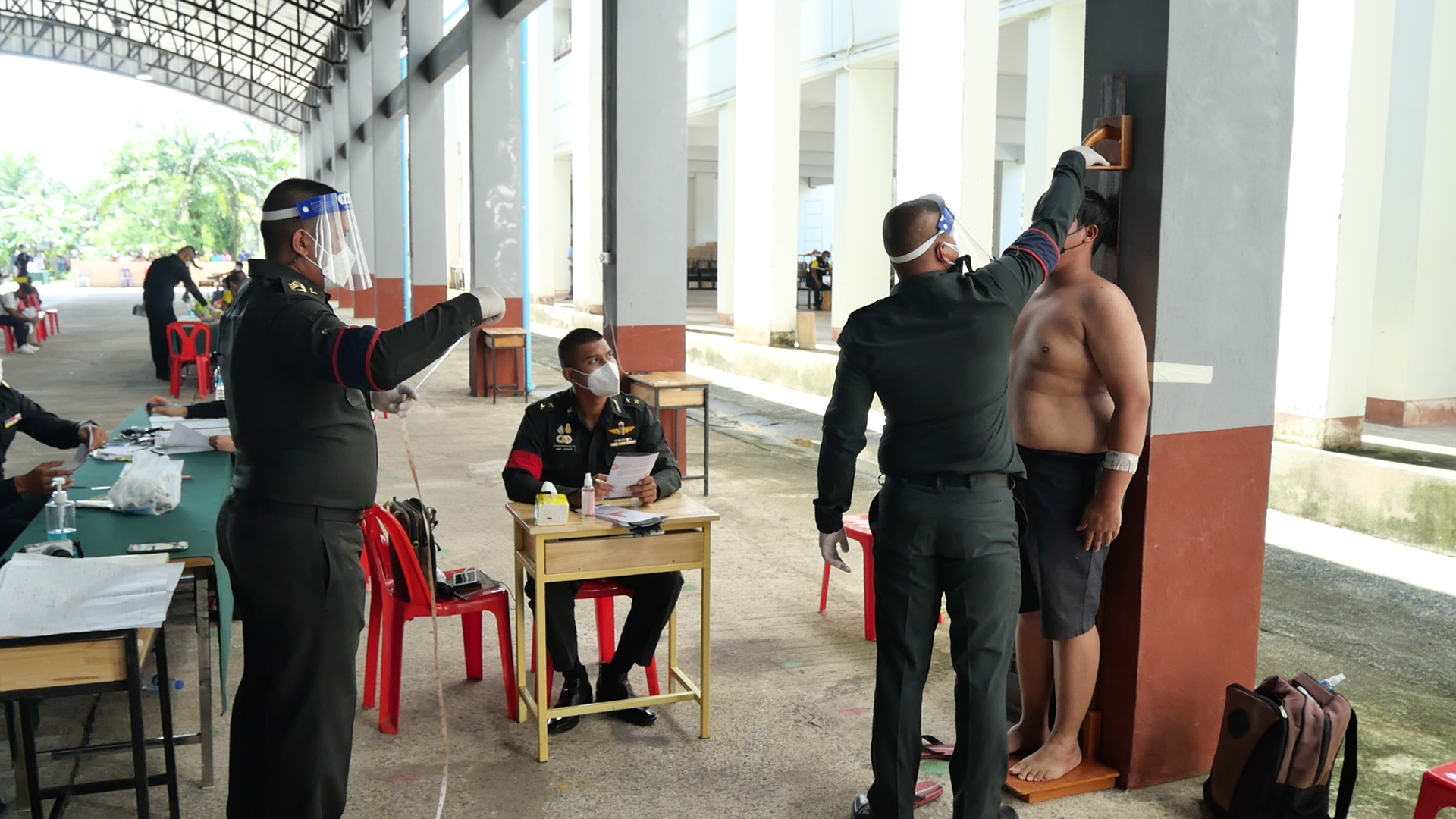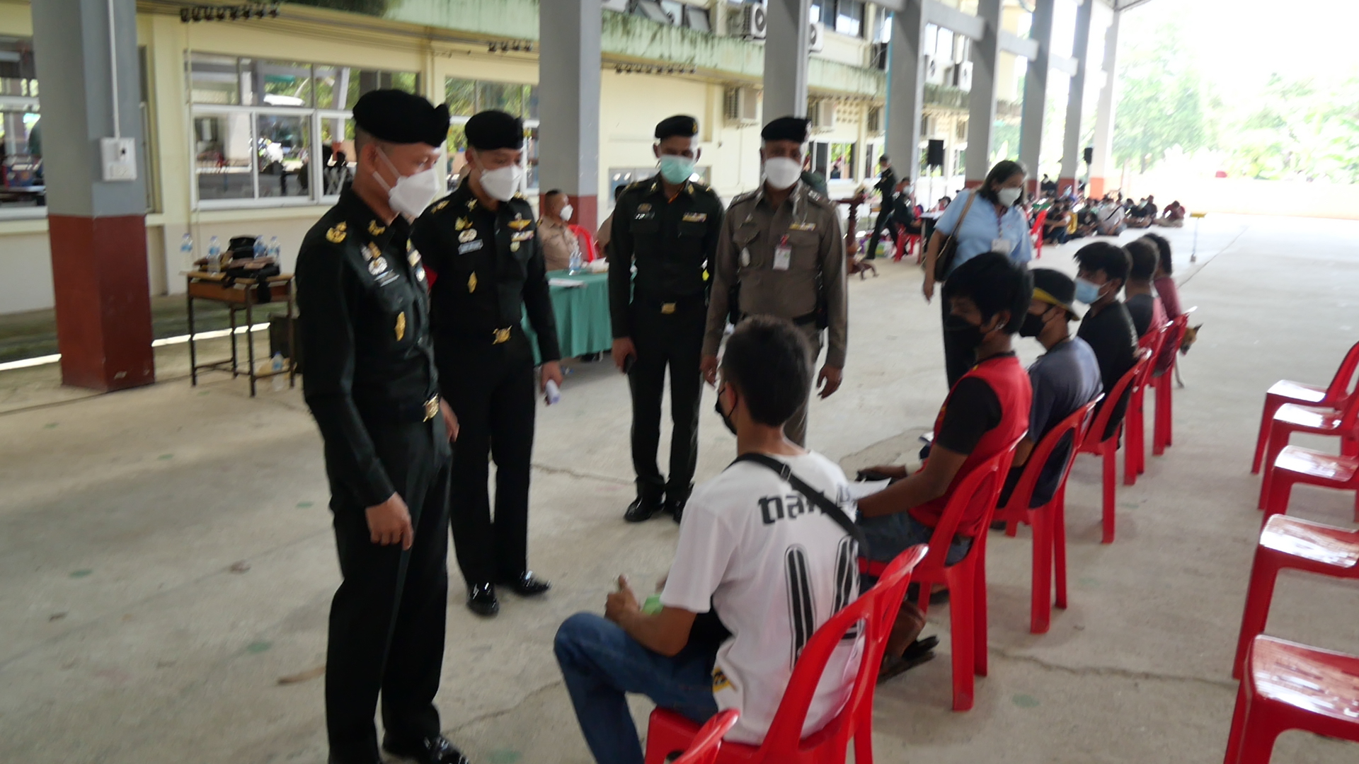 การตรวจเลือกทหารกองเกินเข้าเป็นทหารกองประจำการในวันแรกที่จังหวัดตรัง ในขณะที่ผู้บัญชาการมณฑลทหารบกที่ 43 ค่ายเทพสตรีศรีสุนทร เชิญชวนให้ชายไทยสมัครรับการทหาร เนื่องจากหลายคนอาจจะประสบปัญหาการแพร่ระบาดของโควิด -19 อาจทำให้เกิดการว่างงานขาดแคลนรายได้