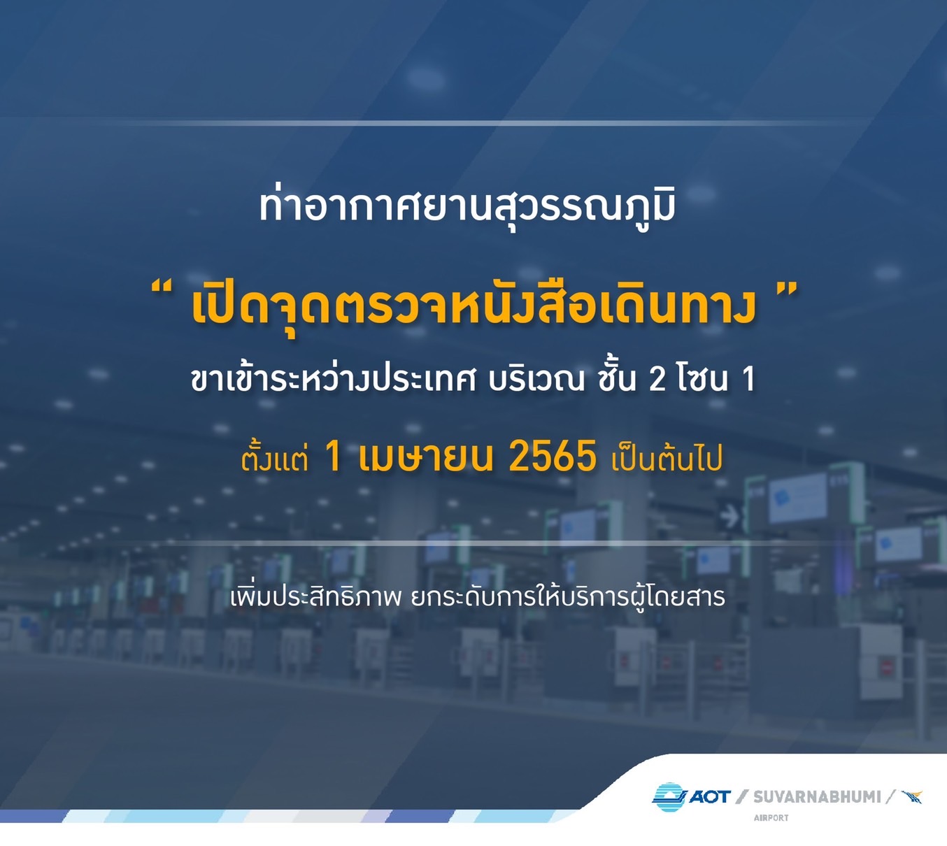 ***** วันที่ 1 เม.ย.2565 ท่าอากาศยานสุวรรณภูมิเปิดจุดตรวจหนังสือเดินทางขาเข้าระหว่างประเทศ ชั้น 2 โซน 1 หลังปรับปรุงใหม่เสร็จเรียบร้อย เพิ่มประสิทธิภาพบริการรับแนวโน้มผู้โดยสารเพิ่มตามการผ่อนคลายมาตรการเข้าประเทศ 1 เม.ย. นี้ ตั้งแต่เวลา 16.30 น. ของวันที่ 1 เมษายน 2565 ท่าอากาศยานสุวรรณภูมิ (ทสภ.) จะกลับมาเปิดจุดตรวจหนังสือเดินทางขาเข้าระหว่างประเทศ บริเวณชั้น 2 โซน 1 อาคารผู้โดยสาร หลังจากทำการปิดปรับปรุง เพื่อเพิ่มประสิทธิภาพการให้บริการด้านการตรวจหนังสือเดินทาง ช่วยลดความคับคั่งแออัด ทำให้ผู้โดยสารได้รับบริการที่สะดวกรวดเร็ว สามารถรองรับผู้โดยสารที่จะมีเพิ่มมากขึ้นภายหลังรัฐบาลเริ่มการผ่อนคลายมาตรการควบคุมการเดินทางเข้าราชอาณาจักร