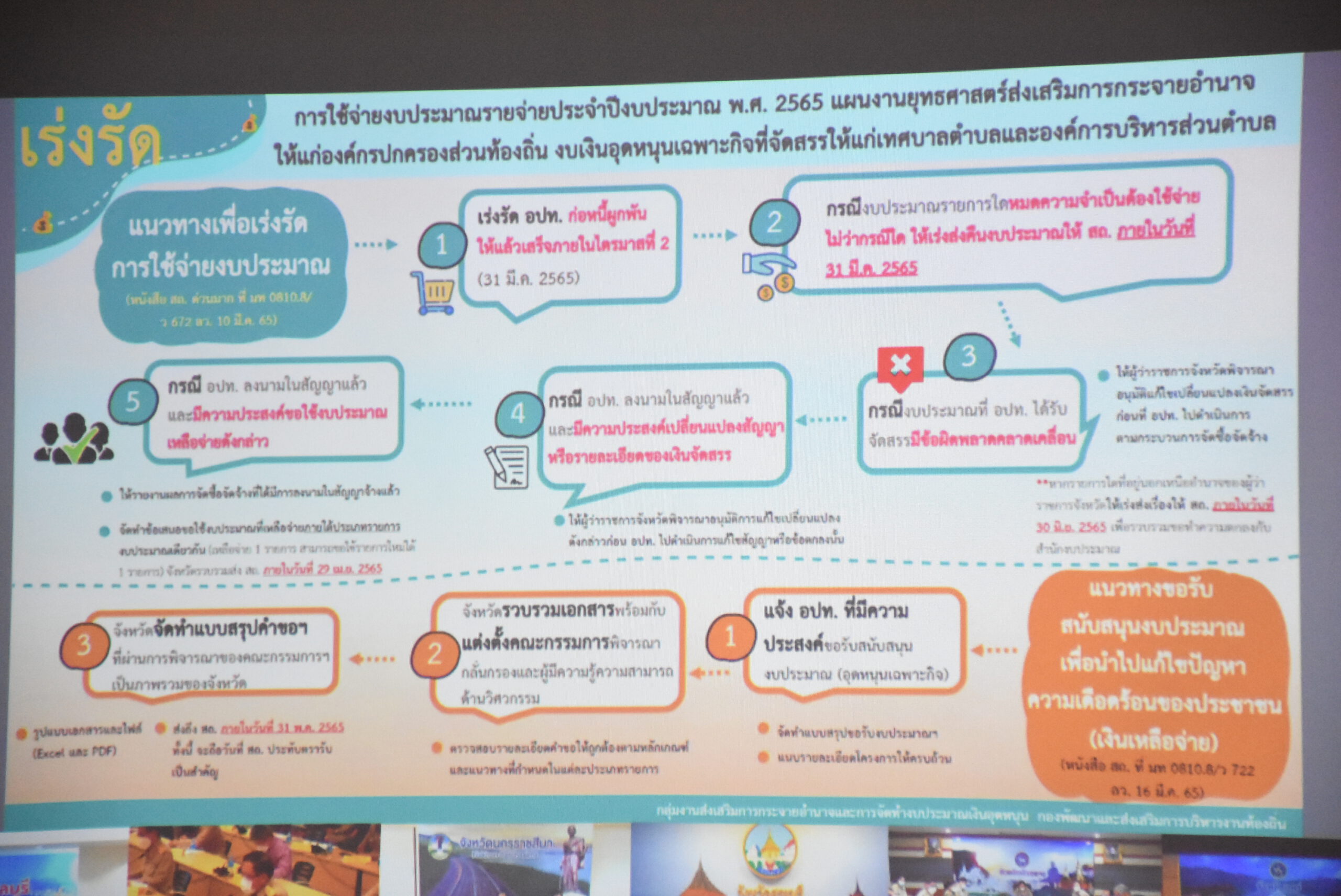 เรื่องการขับเคลื่อนขจัดความยากจนและพัฒนาคนทุกช่วงวัยอย่างยั่งยืนตามหลักปรัชญาเศรษฐกิจพอเพียงระดับพื้นที่ ผลจาการรายงานข้อมูลจาก TPMAP ปี 2565 พื้นที่เป้าหมาย จำนวน 619,111 ครัวเรือน มีครัวเรือนตกหล่น/และครัวเรือนใหม่ จำนวน 24,862 ทำให้มีข้อมูลในระบบขณะนี้ที่ 643,973 ครัวเรือน ในการเร่งดำเนินการ ซึ่งภาพรวมของแต่ละพื้นที่ หลายๆจังหวัด เกิน100 เปอร์เซ็นต์ มี 24 จังหวัด และบางจังหวัดถึง 100 เปอร์เซ็นต์ อีกหลายๆจังหวัดก็ดำเนินการไปเกินครึ่ง ปัญหาที่ได้รับการรายงาน ข้อมูลที่ได้รับข้อมูลจากTPMAPเรื่องกรอบเวลา ส่วนที่2 มีการรายงานเข้าระบบช้า อาจเพราะมีการเข้าใช้งานจำนวนมากเพื่อปรับกรอบการทำงานให้การดำเนินงานโดยให้ผู้ว่าราชการจังหวัดปรับกรอบเวลาและจัดการ