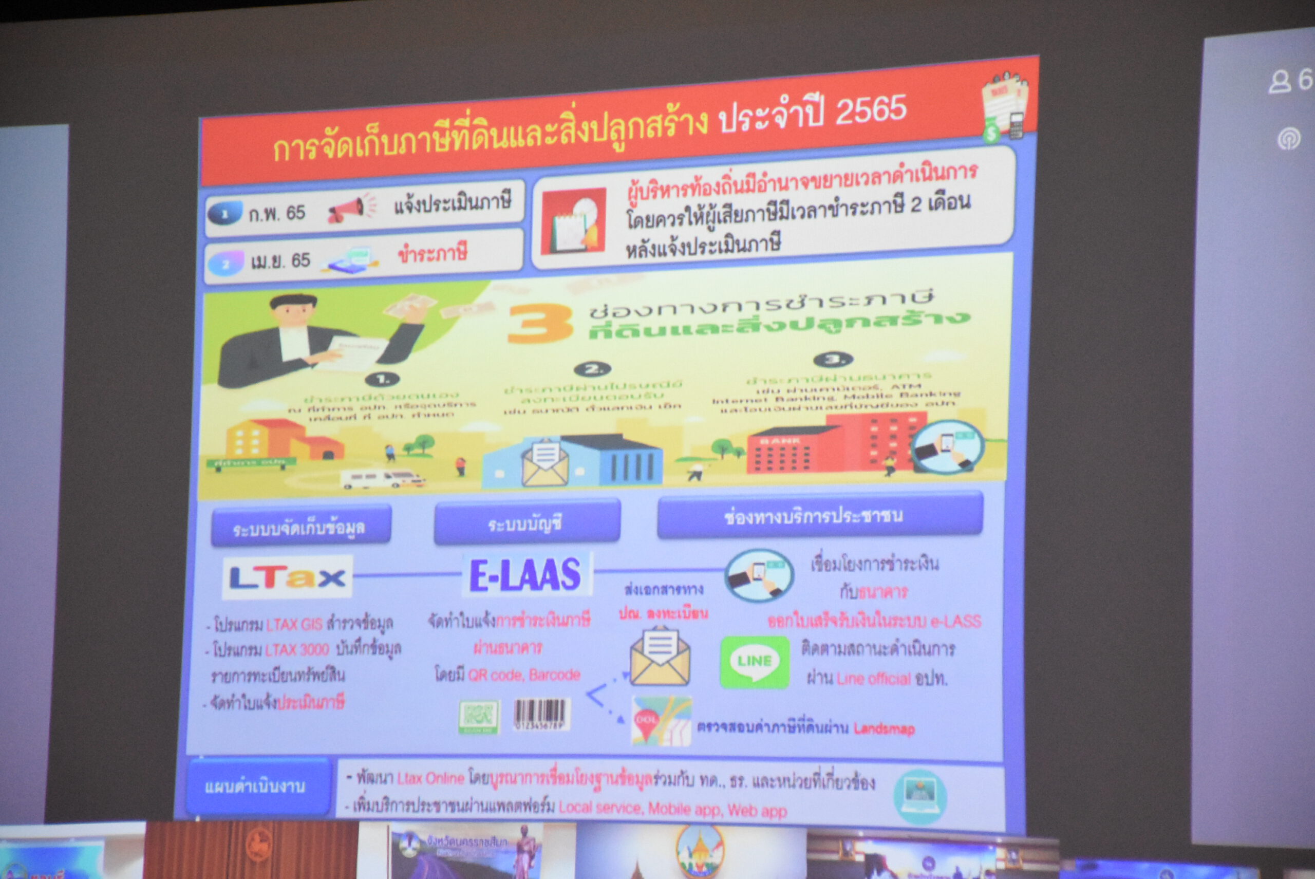 สำหรับการประชุมในวันนี้ เป็นการชี้แจงการดำเนินงานของส่วนภูมิภาค และจังหวัดในการดำเนินงานการปฏิบัติงาน ความคืบหน้านโยบายการขับเคลื่อนขงส่วนงานราชการ ตามนโยบายของรัฐบาล โดยได้ชี้แจ้งในเรื่องของการการจัดเก็บที่ ภาษีที่ดินและสิ่งปลูกสร้าง ประจำปี 2565 อยู่ในช่วงการชำระภาษีเดือน เมษายน265 ให้ผู้บริหารท้องถิ่นมีอำนาจขยายเวลาดำเนินการ ดูความจำเป็น สามารถขยายเวลาได้ ตามความเหมาะสม การชำระภาษี ปีนี้เป็นการจัดเก็บภาษีตามกฎหมาย ไม่มีการลดหย่อยภาษี ให้ทางผู้ว่าราชการจังหวัด ประชาสัมพันธ์การให้ความสะดวกการชำระภาษี ซึ่งสามารถชำระได้ 3 ช่องทาง คือ ชำระภาษีโดยวอล์คอินเข้าชำระด้วยตนเอง ที่ทำการ อปท.กำหนด ชำระผ่านทางไปรษณีย์ ลงทะเบียนตอบรับ เช่น ธนาณัติ และ ชำระภาษีผ่านธนาคาร อินเตอร์แบงค์กิ้ง หรือ อินเตอร์เน็ตโมบาย