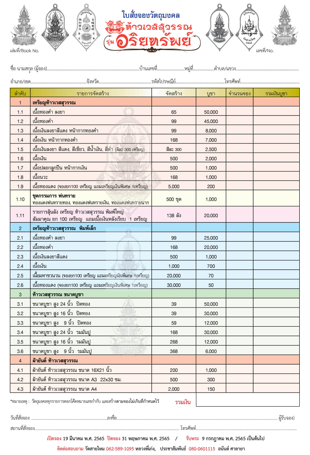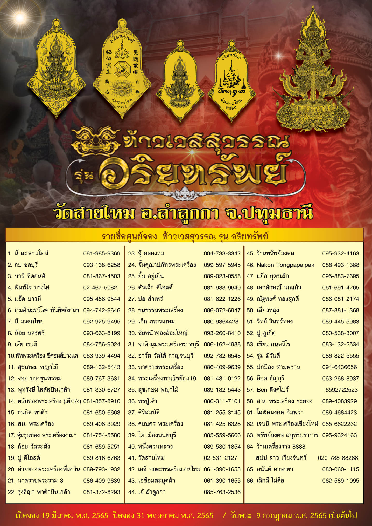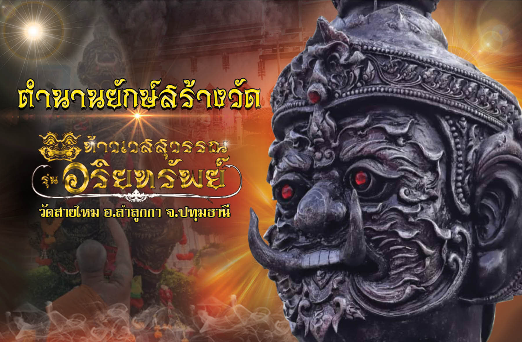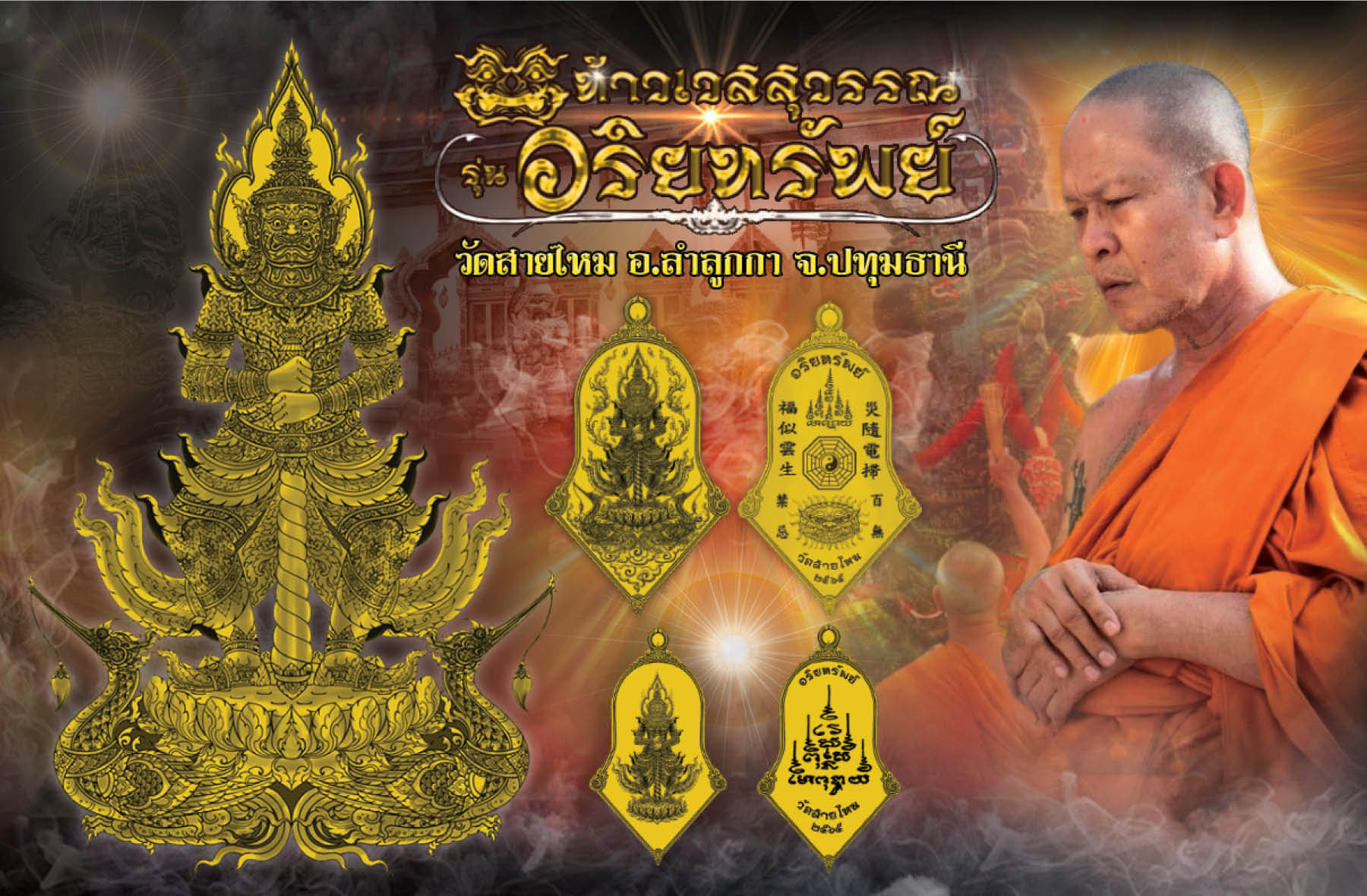 ท้าวเวสสุวรรณ รุ่น อริยทรัพย์ (รุ่นแรก) จองได้ที่วัดสายไหม 3 จุด 1.หน้าลานท้าวเวสสุวรรณ 2.ตู้วัตถุมงคลข้างกุฏิหลวงพ่อ 3.ตู้วัตถุมงคลข้างวิหารไอ้มะขาม และจองได้ที่สะพานบุญและศูนย์จองชั้นนำทั่วประเทศ เพื่อหารายได้สมทบทุนสร้างอุโบสถ วัดสายไหมแห่งที่ 2 จ.พระนครศรีอยุธยา