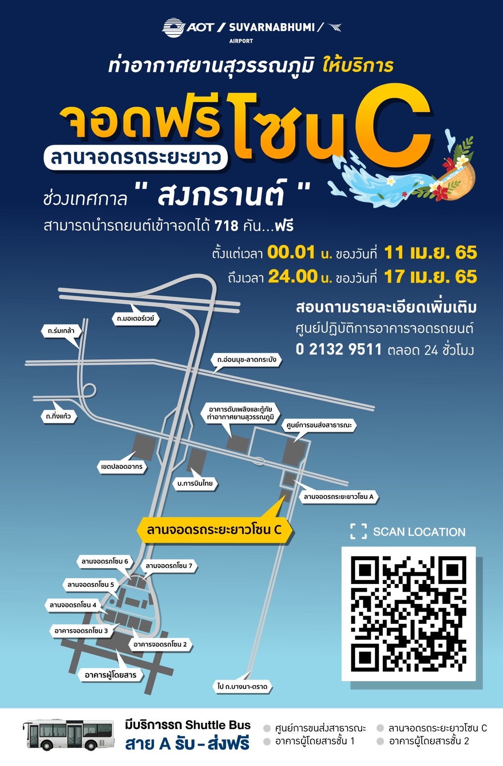 *****นายกิตติพงศ์ กล่าวเพิ่มเติมว่า เพื่อเป็นการช่วยลดภาระค่าใช้จ่ายของผู้โดยสารและผู้ใช้บริการ ทสภ.ได้ยกเว้นค่าบริการจอดรถยนต์ที่ลานจอดรถระยะยาวโซน C ตั้งแต่วันจันทร์ที่ 11 เมษายน 2565 เวลา 00.01น. จนถึง วันอาทิตย์ที่ 17 เมษายน 2565 เวลา 24.00 น. รวม 7 วัน โดยลานจอดรถโซนดังกล่าวสามารถรองรับรถยนต์ได้จำนวน 718 คัน ทั้งนี้ ทสภ. มีรถ Shuttle Bus สาย A วิ่งให้บริการรับ – ส่ง ผู้โดยสารทุก ๆ 15 นาที ฟรี ตลอด 24 ชั่วโมง ผู้ใช้บริการสามารถสอบถามรายละเอียดเพิ่มเติมได้ที่ศูนย์ปฏิบัติการอาคารจอดรถยนต์ หมายเลขโทรศัพท์ 0 2132 9511 ตลอด 24 ชั่วโมง และในช่วงเทศกาลสงกรานต์ประจำปี 2565 ทสภ. ได้จัดตกแต่งพื้นที่สำหรับถ่ายภาพ เพื่อต้อนรับเทศกาลสงกรานต์ และยังเป็นการร่วมอนุรักษ์ สืบสาน ส่งเสริมประเพณีของไทย ระหว่างวันที่ 1 – 20 เมษายน 2565 จำนวน 2 จุด บริเวณประตู 5 ชั้น 4 โถงผู้โดยสารขาออก โดย ทสภ. ได้อัญเชิญพระพุทธรูปขึ้นประดิษฐาน ณ บริเวณพื้นที่จัดกิจกรรมฯ เพื่อให้ผู้โดยสารและผู้ใช้บริการได้สักการะบูชาเพื่อความเป็นสิริมงคล และ พื้นที่สำหรับถ่ายภาพบริเวณ Exit A ประตู 1 ชั้น 2 โถงผู้โดยสารขาเข้าภายในประเทศ ที่สามารถมองเห็นความสวยงามได้