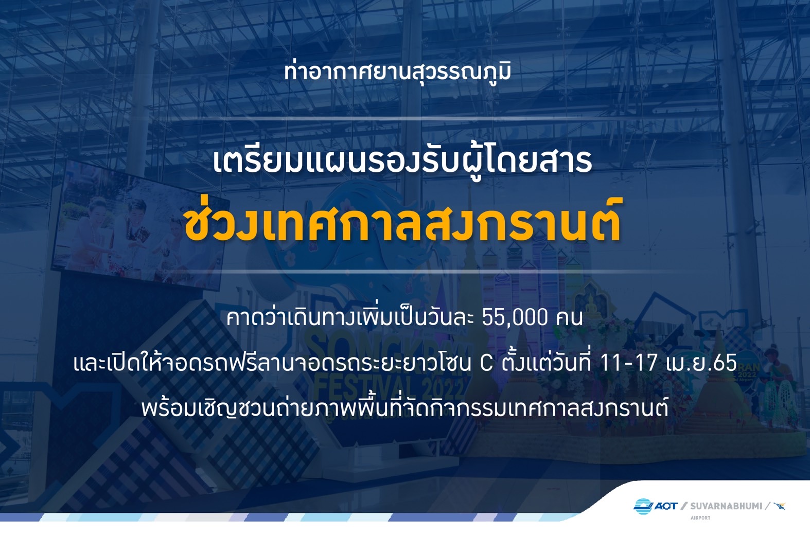 *****วันที่ 7 เมษายน 2565 ท่าอากาศยานสุวรรณภูมิ (ทสภ.) คาดการณ์จำนวนผู้โดยสารเดินทางในช่วงเทศกาลสงกรานต์เพิ่มขึ้นร้อยละ 106.59 เตรียมแผนอำนวยความสะดวกรองรับการเดินทางของผู้โดยสารที่จะเพิ่มมากขึ้นในช่วงวันหยุดยาวเทศกาลสงกรานต์ ตั้งแต่วันที่ 11 – 17 เมษายน 2565 ทสภ. ได้มีการยกเว้นค่าบริการลานจอดรถระยะยาวโซน C พร้อมเชิญชวนถ่ายภาพซุ้มเทศกาลสงกรานต์