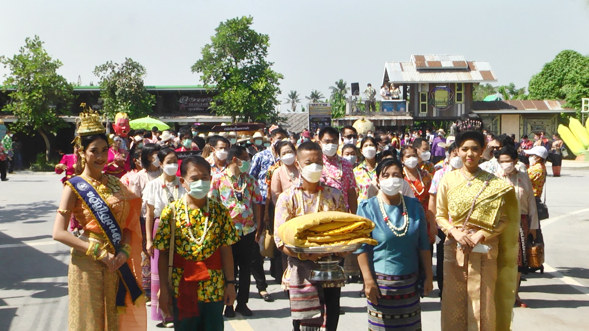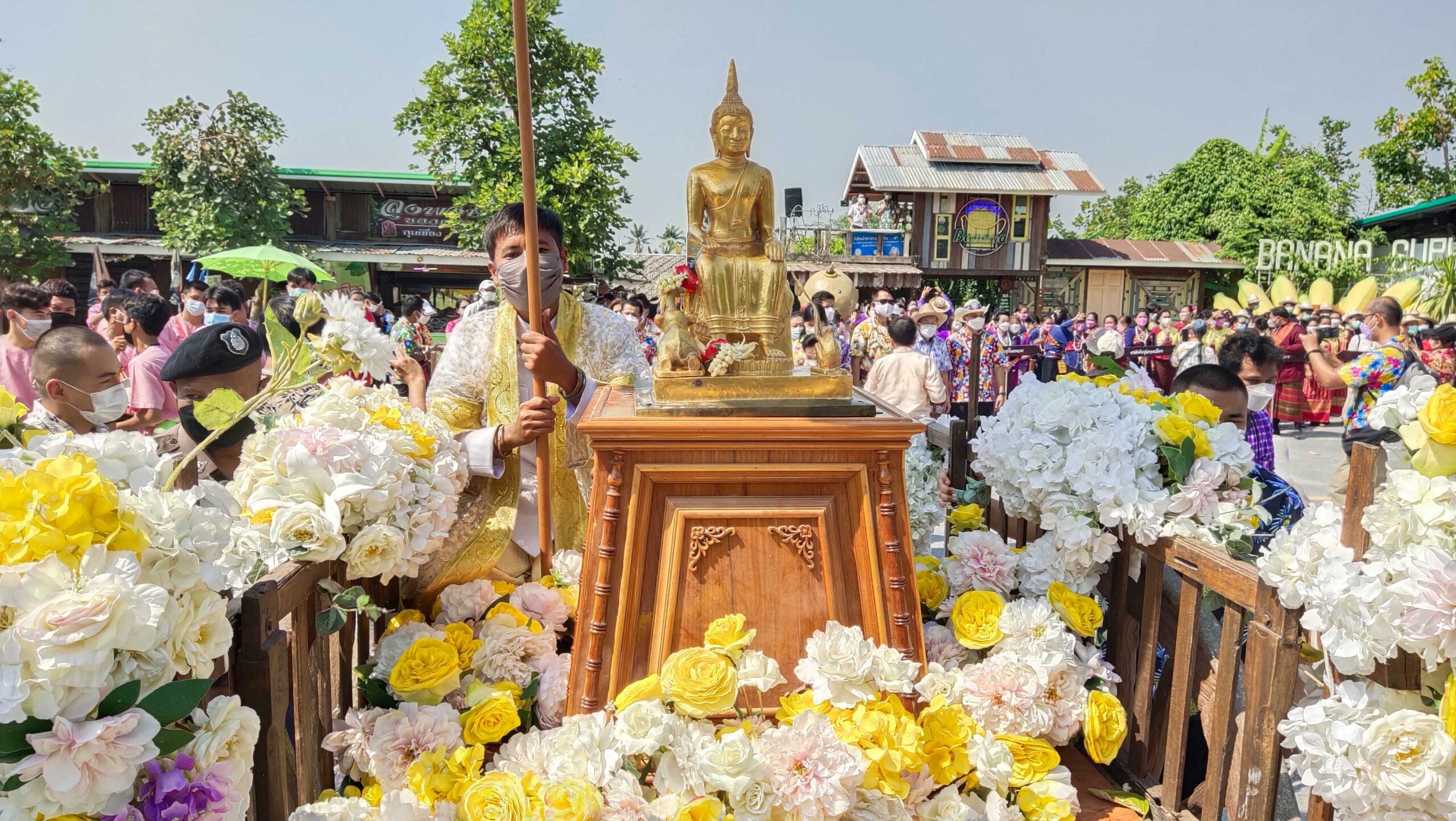 จากนั้นได้อัญเชิญหลวงพ่อโตทองคำ ขึ้นบกโดยมีเกวียนบุปผาชาติ พร้อมผ้าห่มหลวงพ่อโตและขบวน 11 ชาติพันธุ์สุพรรณบุรี เคลื่อนขบวนแห่ไปที่หน้าพระวิหารหลวงพ่อโต ก่อนอัญเชิญหลวงพ่อโตทองคำ ขึ้นไปประดิษฐานหน้าวิหารหลวงพ่อโต จากนั้นนายณัฐภัทร สุวรรณประทีป ผู้ว่าราชการจังหวัดสุพรรณบุรี ได้นำหัวหน้าส่วนราชการและประชาชนสรงน้ำหลวงพ่อโตทองคำก่อนจะแห่ผ้าห่มหลวงพ่อโตวนพระวิหารหลวงพ่อโต 3 รอบก่อนจะทำพิธีห่มผ้าหลวงพ่อโต