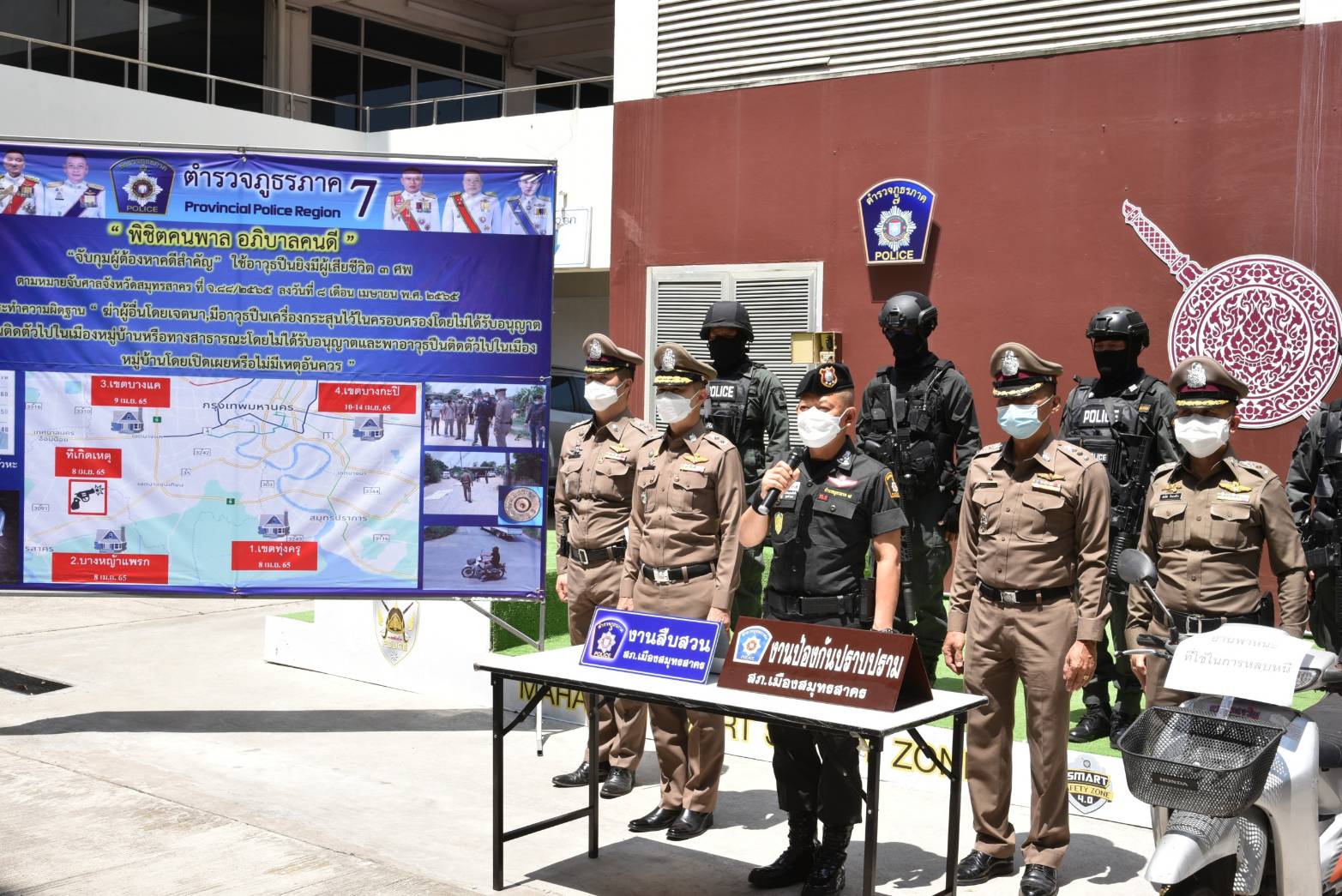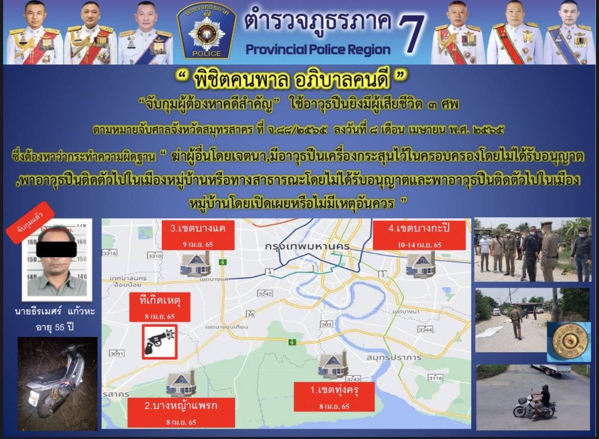พ.ต.อ.เชิดศักดิ์ รอดเข็ม ผกก.สส.2 ภ.7 พ.ต.อ.ยอดชาย แก้วเรือง ผกก.สส.ภ.จว.สมุทรสาคร และเจ้าหน้าที่ที่เกี่ยวข้อง ได้ร่วมกันแถลงข่าวการจับกุมตัวผู้ต้องหาตามหมายจับ จำนวน 1 ราย ซึ่งก่อเหตุอุกฉกรรจ์สะเทือนขวัญใช้อาวุธปืนยิงผู้อื่นมีผู้เสียชีวิต 3 ราย คือ นายธีรเมศร์ แก้วหะ อายุ 55 ปี ผู้ต้องหาตามหมายจับศาลจังหวัดสมุทรสาคร ที่ จ.88/2565 ลงวันที่ 8 เม.ย. 65 ซึ่งต้องหาว่ากระทำความผิดฐาน “ฆ่าผู้อื่นโดยเจตนา, มีอาวุธปืนและเครื่องกระสุนปืนไว้ในครอบครองโดยไม่ได้รับอนุญาต และพาอาวุธปืนติดตัวไปในเมือง หมู่บ้าน หรือทางสาธารณะโดยไม่ได้รับอนุญาต”