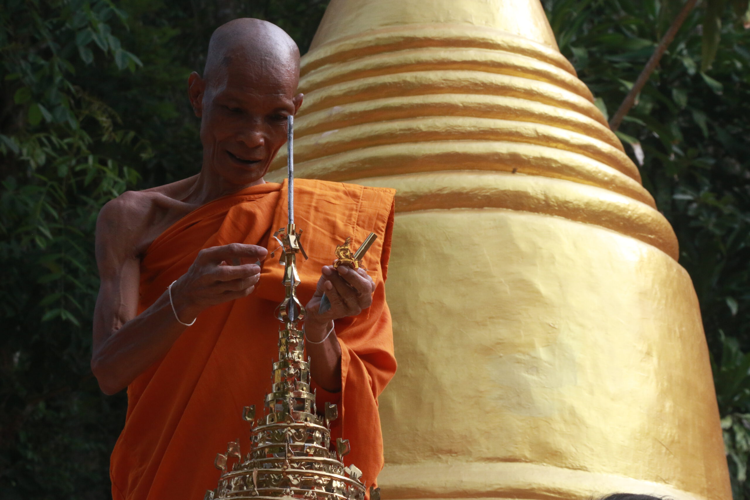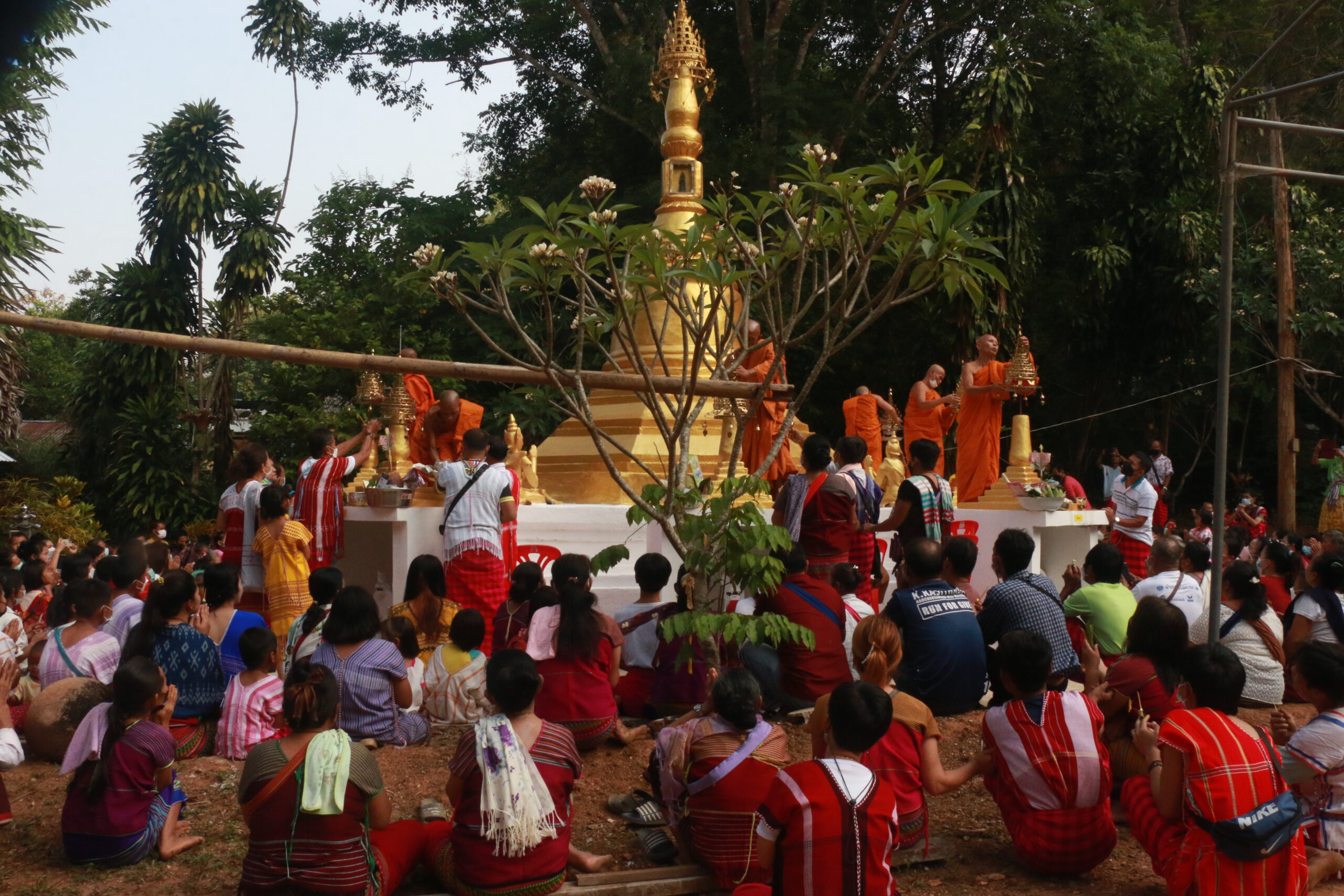 ก่อนจะร่วมพิธีอัญเชิญพระแก้วขาว ออกจากที่ประดิษฐาน ในศาลาวัดสะเน่พ่อง มายังศาลาพิธีที่ถูกสร้างขึ้น ตกแต่งอย่างงดงาม ก่อนจะให้พระภิกษุและแม่ชี ทำการสรงน้ำที่ชาวบ้านนำมา ซึ่งเป็นน้ำที่ใส่น้ำหอม แป้ง ขมิ้น และลูกส้มป่อยที่ผ่านการเผาแล้ว ทำให้น้ำดังกล่าวมีกลิ่นหอม