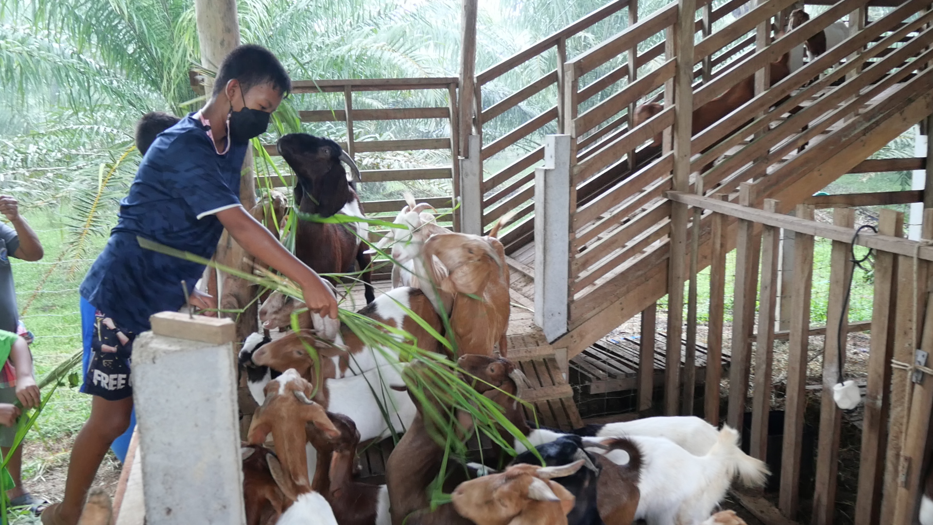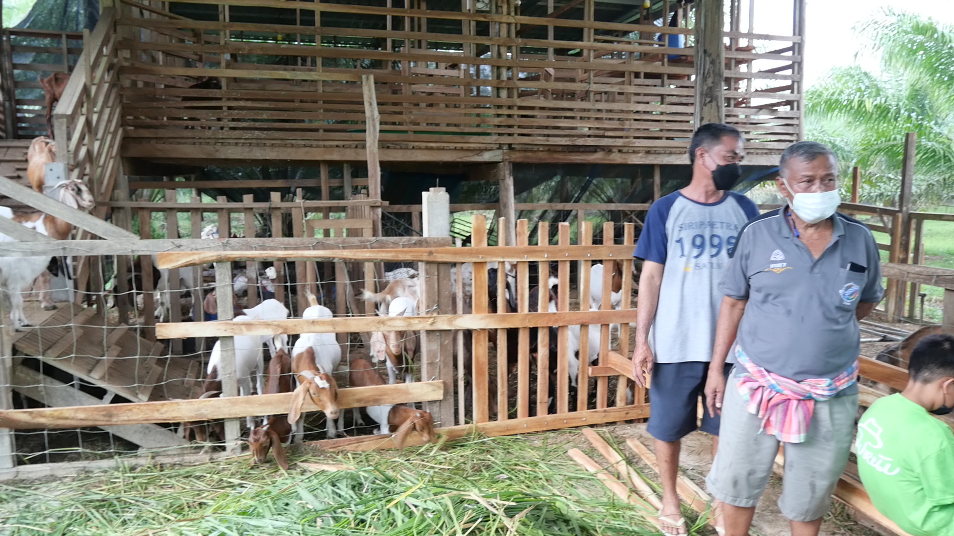 นายสมัย ชื่นแก้ว เกษตรกรกล่าวว่า สถานการณ์การแพร่ระบาดโควิด -19 ทำให้ตนเองและประชาชนทั่วไปต้องมีการปรับตัว ไม่ว่าจะเป็นด้านอาชีพ หรือการใช้ชีวิตประจำวัน รวมถึงการเดินทางไปสถานที่ต่างๆ ตนเองนั้นไม่ค่อยได้ออกนอกพื้นที่ จึงใช้เวลาว่างมาเลี้ยงแพะ พันธุ์บอร์ลูกผสมและพันธุ์แอโกลูกผสม แพะนั้นจะตั้งท้องประมาณ 5 เดือนก็สามารถให้ลูกได้แล้ว ขณะนี้มีพ่อพันธุ์จำนวน 2 ตัว แม่พันธุ์ 30 ตัว ขณะนี้เริ่มออกลูกแพะแล้ว ส่วนการให้อาหารหรือการเลี้ยงนั้น จะเลี้ยงลักษณะกึ่งปล่อยหากไม่มีฝนตกก็จะให้กินหญ้าภายในสวนปาล์ม หากฝนตกก็จะนำหญ้ามาให้แพะ หารก็เป็นหญ้าเนเปียและอื่นๆ ได้เริ่มเลี้ยงมาประมาณ 1 ปี ได้ลูกแล้ว แต่จะเก็บไว้เป็นแม่พันธุ์โดยตั้งเป้าแม่พันธุ์ประมาณ 80 ตัว ส่วนราคาเนื้อแพะอยู่ที่ 80-200 บาท จะมีพ่อค้ามารับซื้อถึงที่ สถานการณ์วามต้องการเนื้อแพะพบว่ายังไม่เพียงพอต่อความต้องการของผู้บริโภค