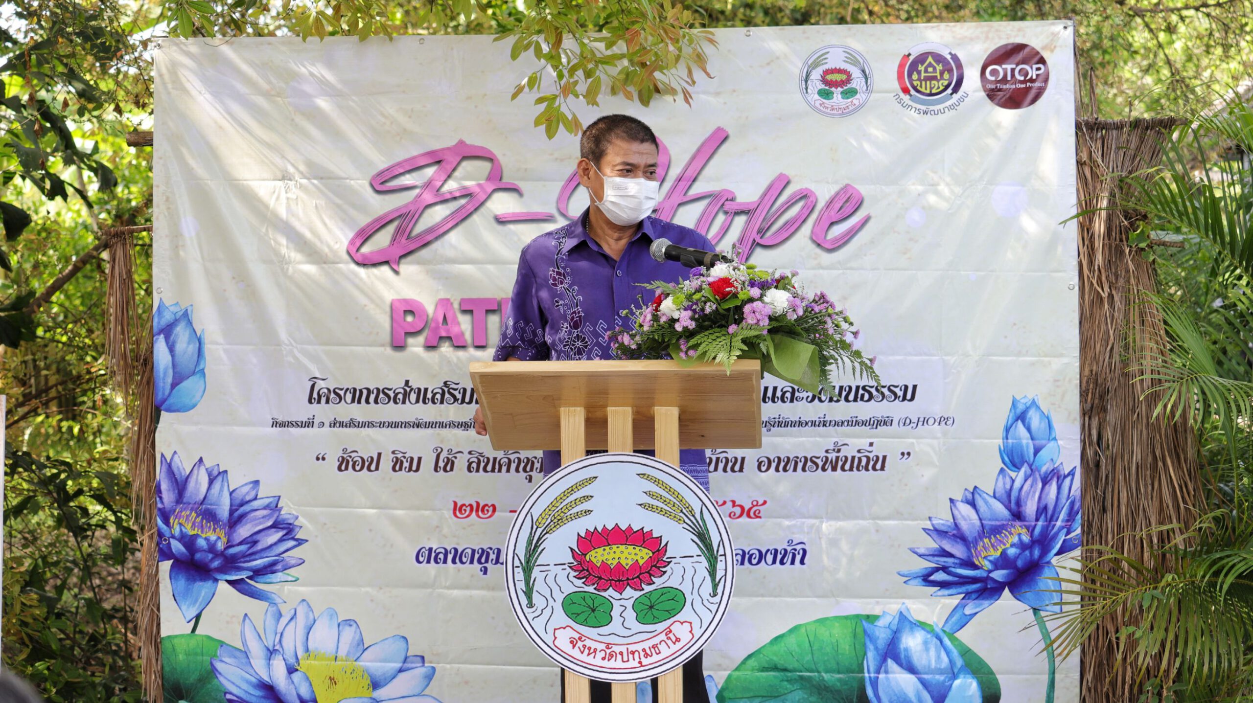 เมื่อเวลา 9.00 น. วันที่ 22 เมษายน 2565 นายพงษ์เทพ รุ่งเรือง พัฒนาการจังหวัดปทุมธานี เป็นประธานเปิดกิจกรรมส่งเสริมการเรียนรู้ที่นักท่องเที่ยวลงมือปฏิบัติ (D-HOPE) ตามโครงการส่งเสริมการท่องเที่ยวเชิงสร้างสรรค์และวัฒนธรรม โดยมี นายสิทธิพล ภู่สมบุญ กรรมการผู้จัดการ บริษัท ประชารัฐรักสามัคคีปทุมธานี (วิสาหกิจเพื่อสังคม) จำกัด นายสุชาติ โป๊ะแก้ว รองนายก อบต.คลองห้า พัฒนาการอำเภอคลองหลวง เจ้าหน้าที่ในหน่วยงานสำนักงานพัฒนาชุมชน ผู้นำท้องถิ่น ผู้นำชุมชน และประชาชน ร่วมงาน ณ ตลาดชุมชนวิถีพอเพียงบ้านคลองห้า หมู่ที่ 2 ตำบลคลองห้า อำเภอคลองหลวง จังหวัดปทุมธานี
