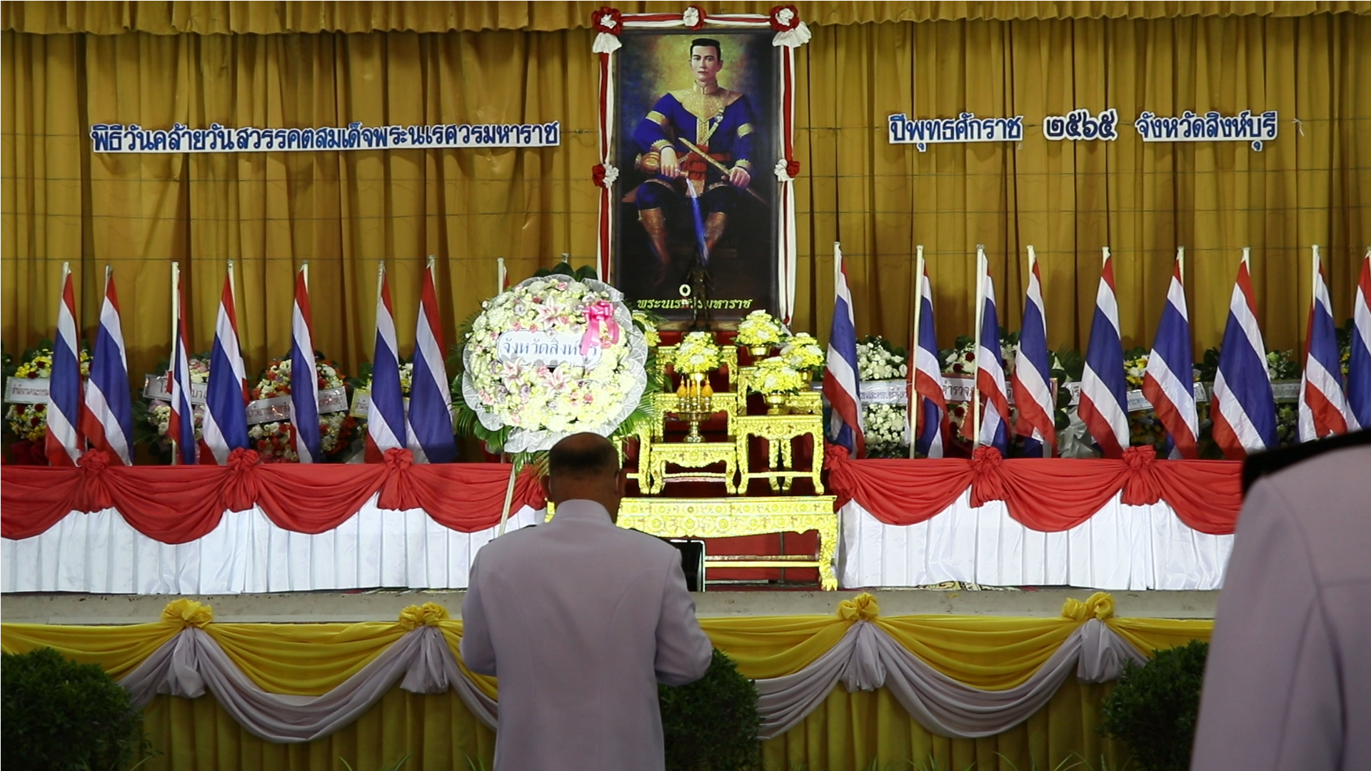 โดยมี รองผู้ว่าราชการจังหวัดสิงห์บุรี นายกเหล่ากาชาด หัวหน้าส่วนราชการ ชมรมแม่บ้านมหาดไทย ศาล ทหาร ตำรวจ ข้าราชการและเจ้าหน้าที่ ร่วมรำลึกถึงพระวีรกรรมอันกล้าหาญ และพระมหากรุณาธิคุณ ของสมเด็จพระนเรศวรมหาราช ทรงเป็นวีรกษัตริย์ที่ทรงพระปรีชาสามารถอย่างล้ำเลิศ มีพระอัจฉริยภาพและฝีพระหัตถ์ในทางการรบและเชี่ยวชาญในอาวุธทุกชนิด ทรงเสด็จสวรรคตเมื่อเดือน 6 ขึ้น 8 ค่ำ ปีมะเส็ง พุทธศักราช 2148 พระชนมายุ 50 พรรษา อยู่ในราชสมบัติ 15 ปี แม้พระองค์จะได้เสด็จสวรรคตมานานกว่า 400 ปี แล้วก็ตาม พสกนิกรชาวไทยต่างสำนึกในพระมหากรุณาธิคุณและพระเกียรติคุณของพระองค์
