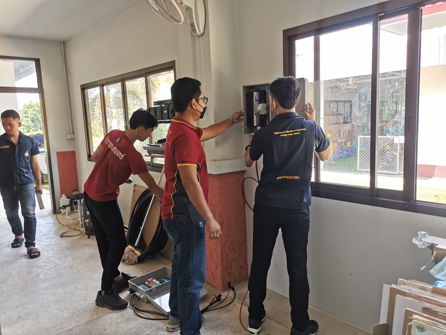 วันที่ 25 เมษายน 2565 อาจารย์สิทธิศักดิ์ โรจชะยะ หัวหน้าสาขาวิศวกรรมไฟฟ้า พร้อมด้วยอาจารย์ประจำสาขาและนักศึกษาชมรมวิศวฯไฟฟ้าอาสา คณะวิศวกรรมศาสตร์และเทคโนโลยี มทร.ศรีวิชัย วิทยาเขตตรัง ได้ร่วมกัน ติดตั้งระบบโซล่าเซลล์ให้กับศูนย์พัฒนาเด็กเล็ก ตำบลหาดสำราญ อำเภอหาดสำราญ จังหวัดตรัง เพื่อช่วยประหยัดพลังงานไฟฟ้า และเพื่อสำรองไฟฟ้ามาใช้งานได้ในกรณีเกิดเหตุไฟฟ้าดับ โดยระบบโซล่าเซลล์สามารารถ รองรับการใช้งานกำลังไฟฟ้าได้ ถึง 3,500 วัตต์