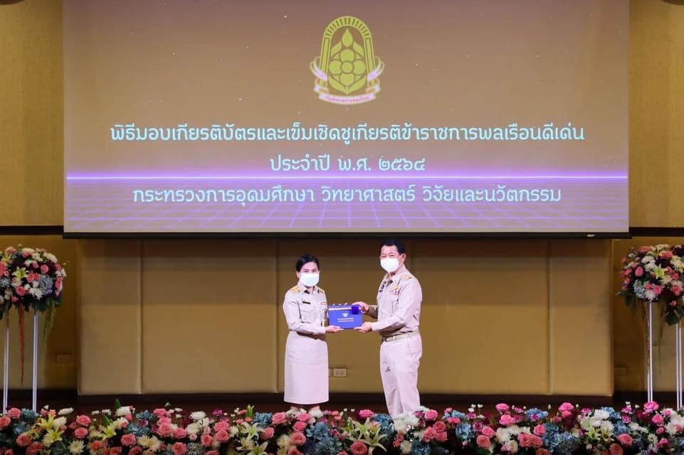ในวันที่ 2 พฤษภาคม 2565 ณ ห้องประชุมภูมิบดินทร์ชั้น 6 อาคารสถานศึกษาเคมีปฏิบัติ กรมวิทยาศาสตร์บริการ กรุงเทพมหานคร ศ.ดร.นพ.สิริฤกษ์ ทรงศิวิไล ปลัดกระทรวงการอุดมศึกษา วิทยาศาสตร์ วิจัยและนวัตกรรม ปลัดกระทรวงการอุดมศึกษา วิทยาศาสตร์ วิจัย และนวัตกรรม (รมว.อว.) เป็นประธานในพิธีมอบเกียรติบัตรและเข็มเชิดชูเกียรติให้แก่ข้าราชการพลเรือนดีเด่น ในโครงการยกย่องเชิดชูเกียรติคนดีมีคุณธรรมของกระทรวงการอุดมศึกษา วิทยาศาสตร์ วิจัย และนวัตกรรม ประจำปี พ.ศ.2564
