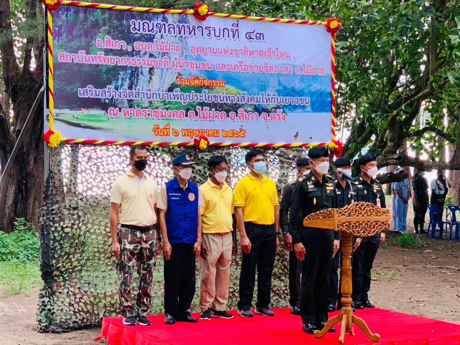 วันที่ 6 พฤษภาคม 2565 มหาวิทยาลัยเทคโนโลยีราชมงคลศรีวิชัย วิทยาเขตตรัง สถาบันทรัพยากรธรรมชาติและสิ่งแวดล้อม นำโดยผู้ช่วยศาสตราจารย์มาโนช ขำเจริญ ผู้อำนวยการสถาบันทรัพยากรและสิ่งแวดล้อม และบุคลากร ร่วมกับมณฑลทหารบกที่ 43 นำโดยพลตรีรักชาติ รัตนาศักดิ์ ผู้บัญชาการมณฑลทหารบกที่ 43 ค่ายเทพสตรีศรีสุนทร ตำบลกะปาง อำเภอทุ่งสง จังหวัดนครศรีธรรมราช พร้อมด้วยสมาชิกเครือข่ายจิตอาสา อำเภอสิเกา เจ้าหน้าที่อุทยานแห่งชาติหาดเจ้าไหม องค์การบริการส่วนตำบลไม้ฝาด ผู้นำชุมชน และเครือข่ายภาคประชาชน จิตอาสา ตำบลไม้ฝาด ร่วมกิจกรรมสร้างเสริมจิตสำนึกบำเพ็ญประโยชน์ทางสังคมและสาธารณประโยชน์นอกสถานที่ การพัฒนาพื้นที่ และเก็บขยะบริเวณชายหาดราชมงคล