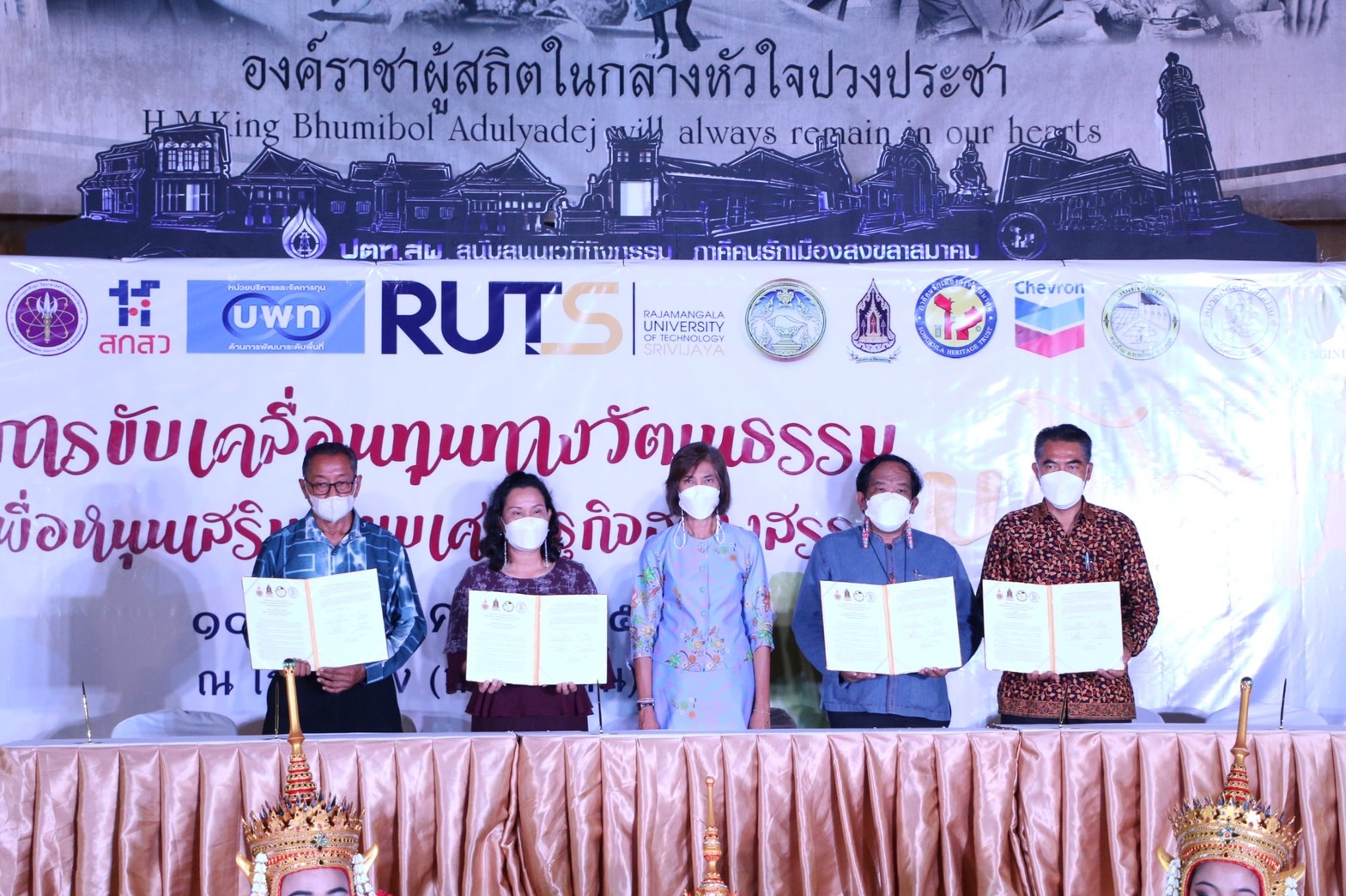 สำนักงานนวัตกรรมและเทคโนโลยี มหาวิทยาลัยเทคโนโลยีราชมงคลศรีวิชัย จัด“กิจกรรมขับเคลื่อนทุนทางวัฒนธรรมมโนราห์เพื่อหนุนเสริมระบบเศรษฐกิจสร้างสรรค์จังหวัดสงขลา” โดยได้รับเกียรติจาก นางสุรียพรรณ์ ณ สงขลา รองผู้ว่าราชการจังหวัดสงขลา มาเป็นประธานพิธีลงนามบันทึกข้อตกลง (MOU) ว่าด้วยความร่วมมือทางด้าน วิชาการเพื่อขับเคลื่อนทุนทางวัฒนธรรมมโนราห์ สำหรับการหนุนเสริมระบบเศรษฐกิจสร้างสรรค์ จังหวัดสงขลา ระหว่างมหาวิทยาลัยเทคโนโลยีราชมงคลศรีวิชัย โดยอธิการบดี ได้มอบหมายให้ ผศ.ดร.อภิรักษ์ สงรักษ์ รองอธิการบดี ร่วมกับ วัฒนธรรมจังหวัดสงขลา องค์การบริหารส่วนตำบลท่าข้าม และสมาคมศิลปินพื้นบ้าน จังหวัดสงขลา การจัดงานครั้งนี้ภายใต้แนวคิด “ขับเคลื่อนทุนทางวัฒนธรรมมโนราห์เพื่อหนุนเสริมระบบเศรษฐกิจสร้างสรรค์จังหวัดสงขลา” โดยมีวัตถุประสงค์ เพื่อสร้างกลไกประสานความร่วมมือและบูรณาการทำงานของประชาคมทางวัฒนธรรมด้านมโนราห์ สำหรับการส่งเสริมและสร้างความเข้มแข็งของมรดกภูมิปัญญาด้านวัฒนธรรม และการมีปฏิสัมพันธ์ร่วมกันทางสังคมระหว่างคนรุ่นเก่าคนรุ่นใหม่สู่การสำนึกท้องถิ่นบนฐานทุนวัฒนธรรมโนราห์