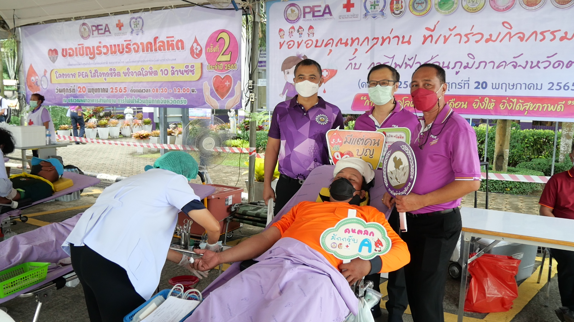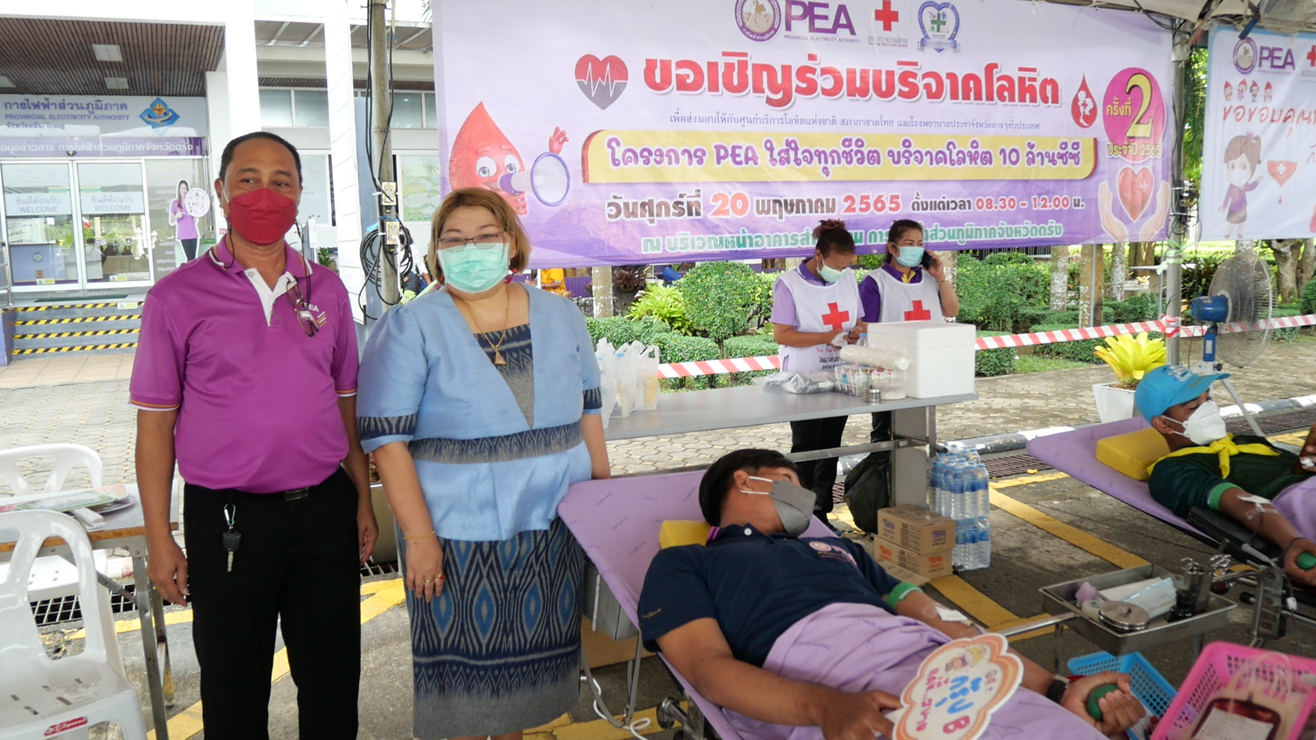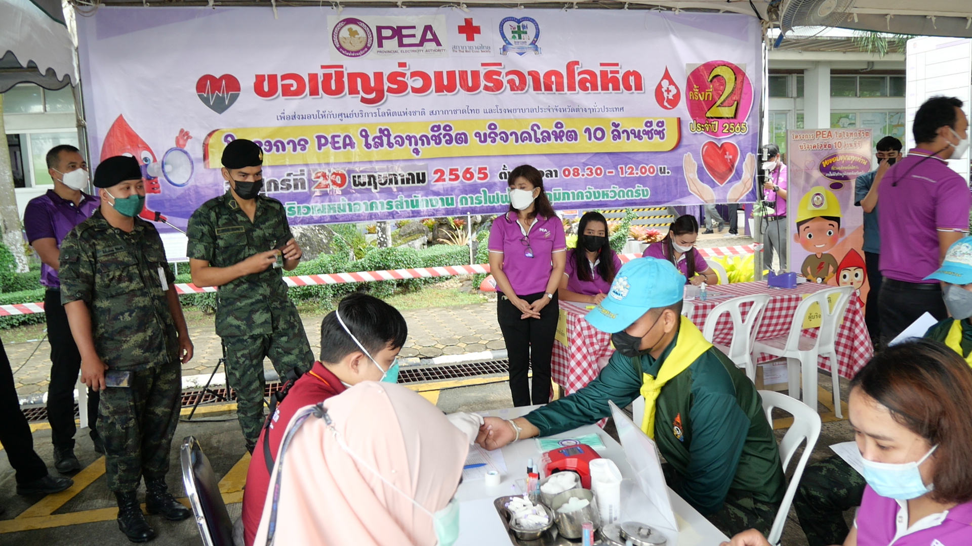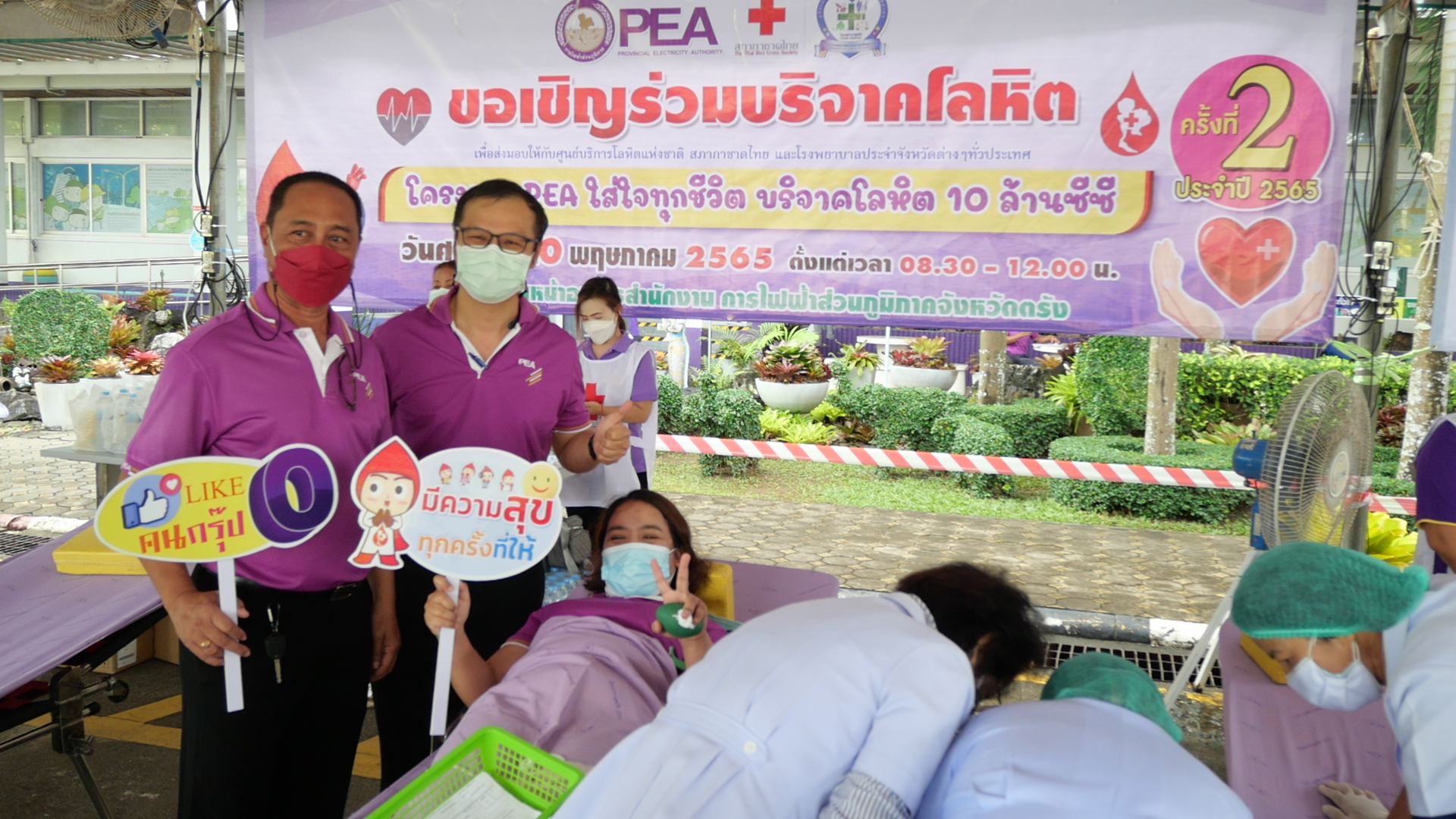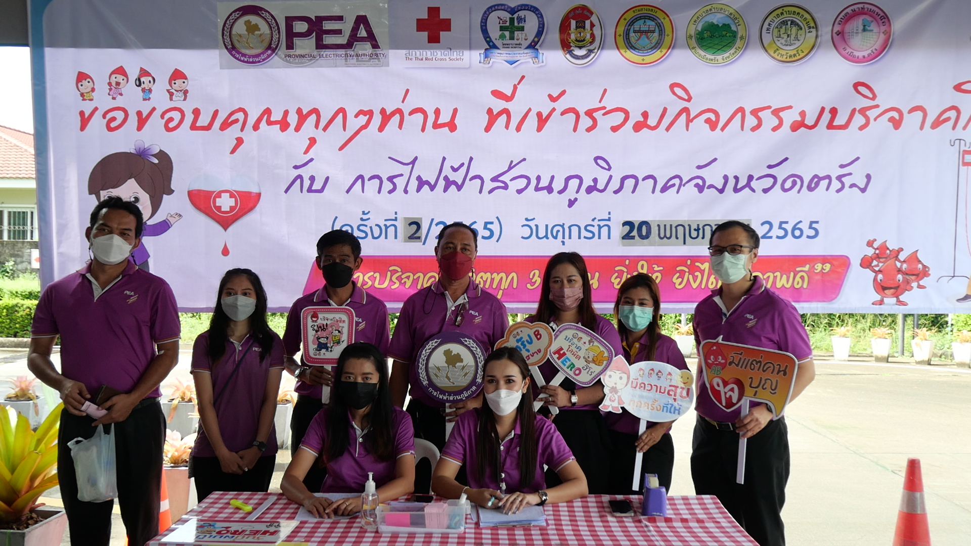 ที่บริเวณหน้าอาคารสำนักงานการไฟฟ้าส่วนภูมิภาคจังหวัดตรังนายสมมาศ พุฒิพงศกร ผู้จัดการการไฟฟ้าส่วนภูมิภาคจังหวัดตรัง มอบหมายให้นายชนธัญ แก้วแกมเพ็ชร์ รองผู้จัดการด้านเทคนิค การไฟฟ้าส่วนภูมิภาคจังหวัดตรัง พร้อมด้วยคณะผู้บริหาร พนักงาน และลูกจ้างการไฟฟ้าส่วนภูมิภาค จัดโครงการ “PEA ใส่ใจทุกชีวิต บริจาคโลหิต 10 ล้านซีซี” ครั้งที่ 2 ประจำปี 2565 โดยเชิญชวนบุคลากรของ PEA, จิตอาสากองพันทหารราบที่ 4 กรมทหารราบที่ 15 ค่ายพระยารัษฎานุประดิษฐ์, วิทยาลัยเกษตรและเทคโนโลยีตรัง, วิทยาลัยสารพัดช่าง, วิทยาลัยเทคนิคตรัง หน่วยงานปกครองส่วนท้องถิ่น และประชาชนทั่วไป ร่วมบริจาคโลหิตให้กับศูนย์บริการโลหิตแห่งชาติ สภากาชาดไทย เพื่อส่งต่อให้กับโรงพยาบาลประจำจังหวัดต่าง ๆ ทั่วประเทศ และนำโลหิตที่ได้จากการบริจาคนี้ ไปช่วยเหลือผู้ป่วยที่มีความจำเป็นต้องรับโลหิตในการรักษาต่อไป