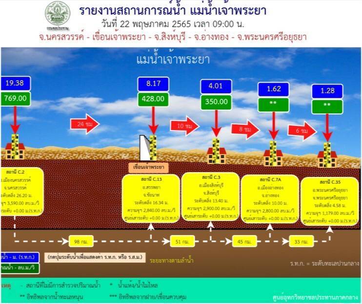 อ่างทอง สุพรรณบุรี ลพบุรี และพระนครศรีอยุธยา ให้บริหารจัดการน้ำ เนื่องจากคาดการณ์ว่าปริมาณน้ำไหลผ่านเขื่อนเจ้าพระยาจะมีแนวโน้มสูงขึ้นอยู่ในเกณฑ์ 300-500 ลูกบาศก์เมตรต่อวินาที ซึ่งส่งผลให้พื้นที่ริมน้ำมีระดับน้ำเพิ่มสูงขึ้น ตั้งแต่บริเวณท้ายเขื่อนเจ้าพระยา อำเภอสรรพยา จังหวัดชัยนาท ถึงบริเวณตำบลกระทุ่ม ตำบลหัวเวียง อำเภอเสนา และตำบลท่าดินแดง อำเภอผักไห่ จังหวัดพระนครศรีอยุธยา ประมาณ 1.50-2.00 เมตร ทั้งนี้ สำนักชลประทานที่ 12 ได้ควบคุมปริมาณการระบายน้ำผ่านเขื่อนเจ้าพระยาให้อยู่ในเกณฑ์ดังกล่าวแล้ว ด้วยการบริหารจัดการน้ำให้เกิดประสิทธิภาพสูงสุด